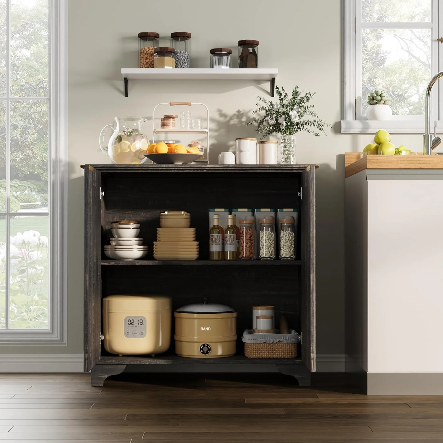 The Modern Farmhouse Coffee Bar Cabinet combines style, functionality, and safety to create an essential addition to your home. With spacious storage options, modern farmhouse charm, and a durable design, this cabinet is perfect for organizing your kitchen, dining room, or living space. Enhance your home decor while keeping your essentials neatly stored with this beautiful cabinet!