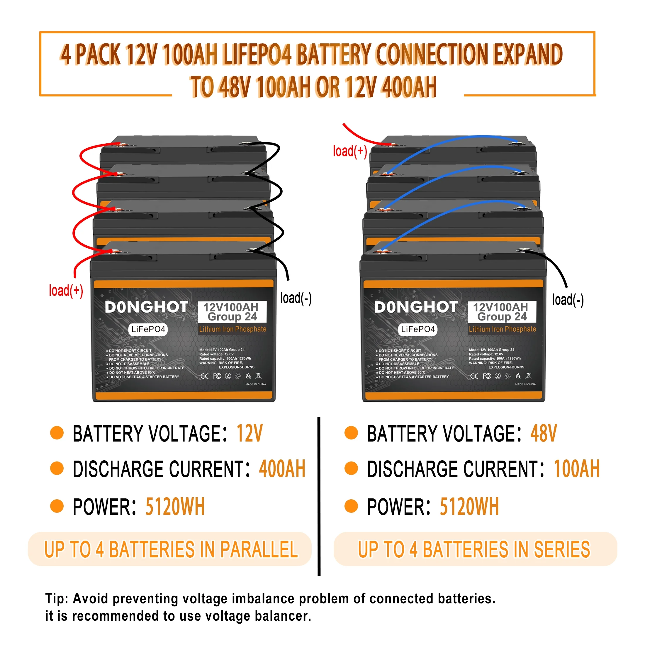 ��4 Pack 12V 100Ah Series to 48V 100AH��Our deep cycle lithium ion battery can be connected in series or in parallel with the same type batteries. Max connection in series: Up to 4 identical batteries for up to 48V connecting in series. Connection in parallels: it can connect multiple batteries, suggest no more than 4 pcs in parallel. Under the premise that each 12V 100Ah lithium battery of the same brand and model is fully charged.