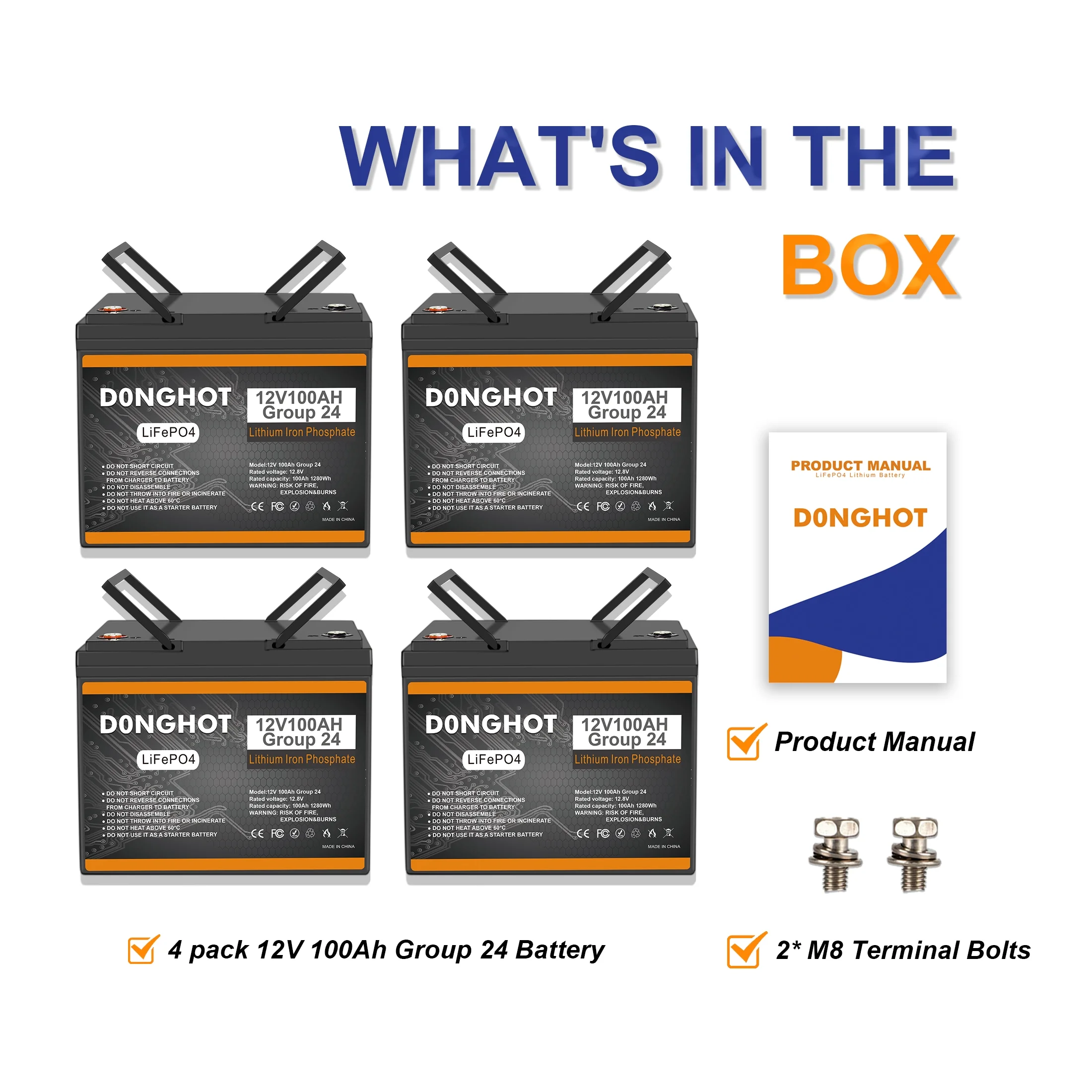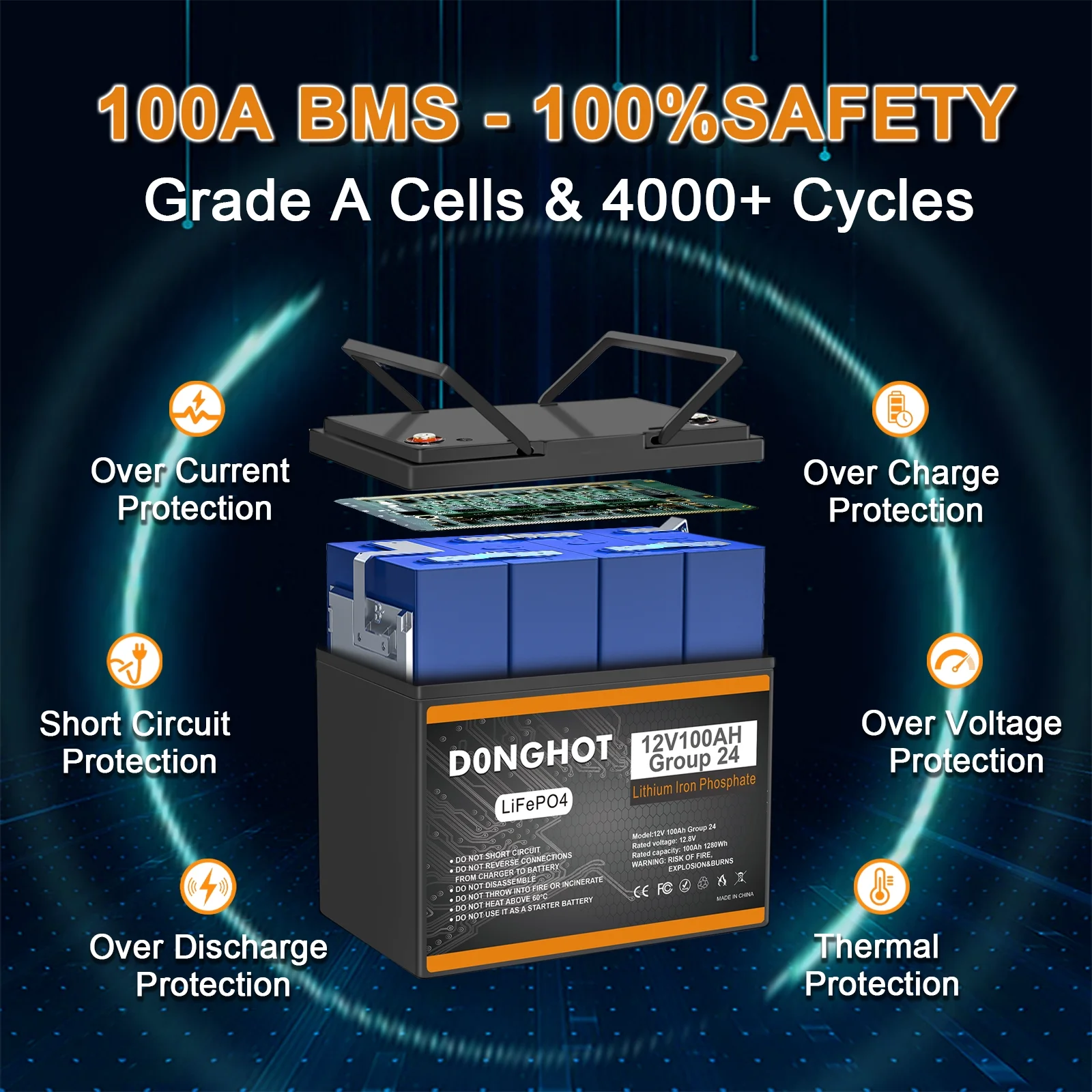 ��100% Grade-A BMS Protection of 12.8V 100Ah Group 24 Lithium Batteries��Group 24 Battery fueled by four Grade-A LiFePO4 cells, it delivers heightened energy density and unparalleled power. The upgraded 100A BMS, offering a fortress of protection. Guarding against overcharge, over-discharge, over-current, over-voltage, overload, and short circuits, it ensures not just power, but peace of mind.