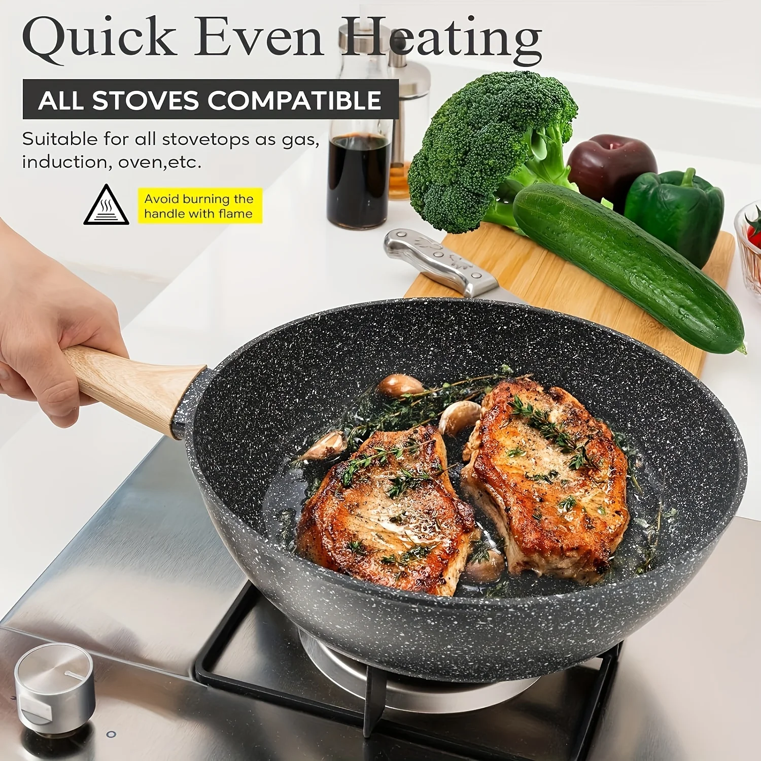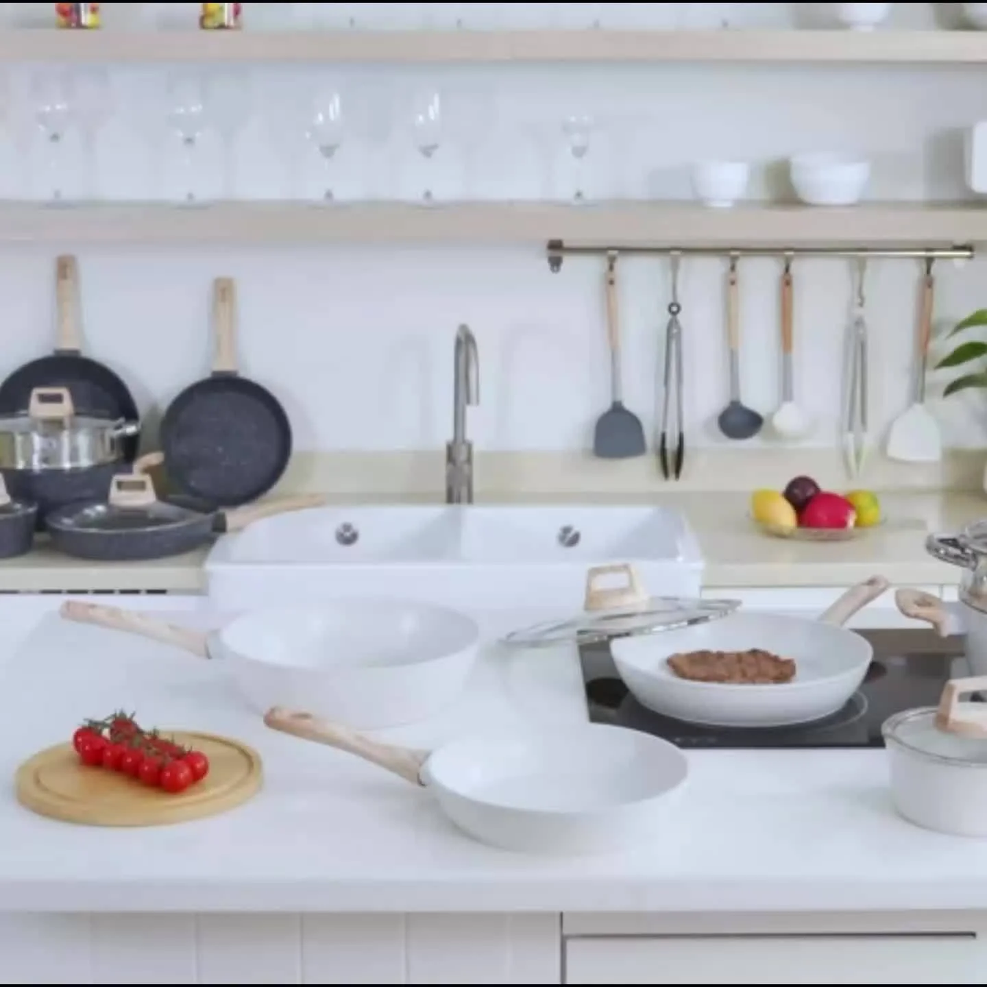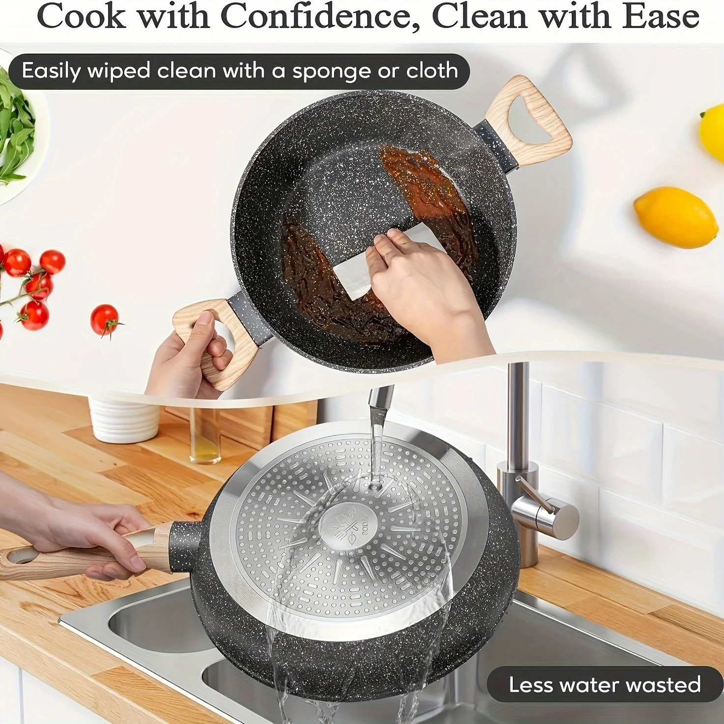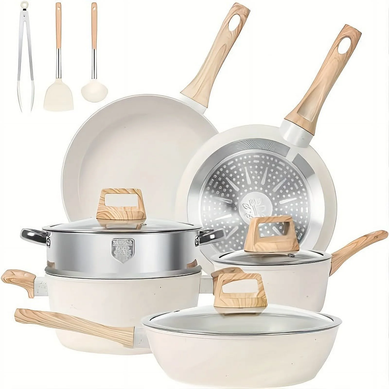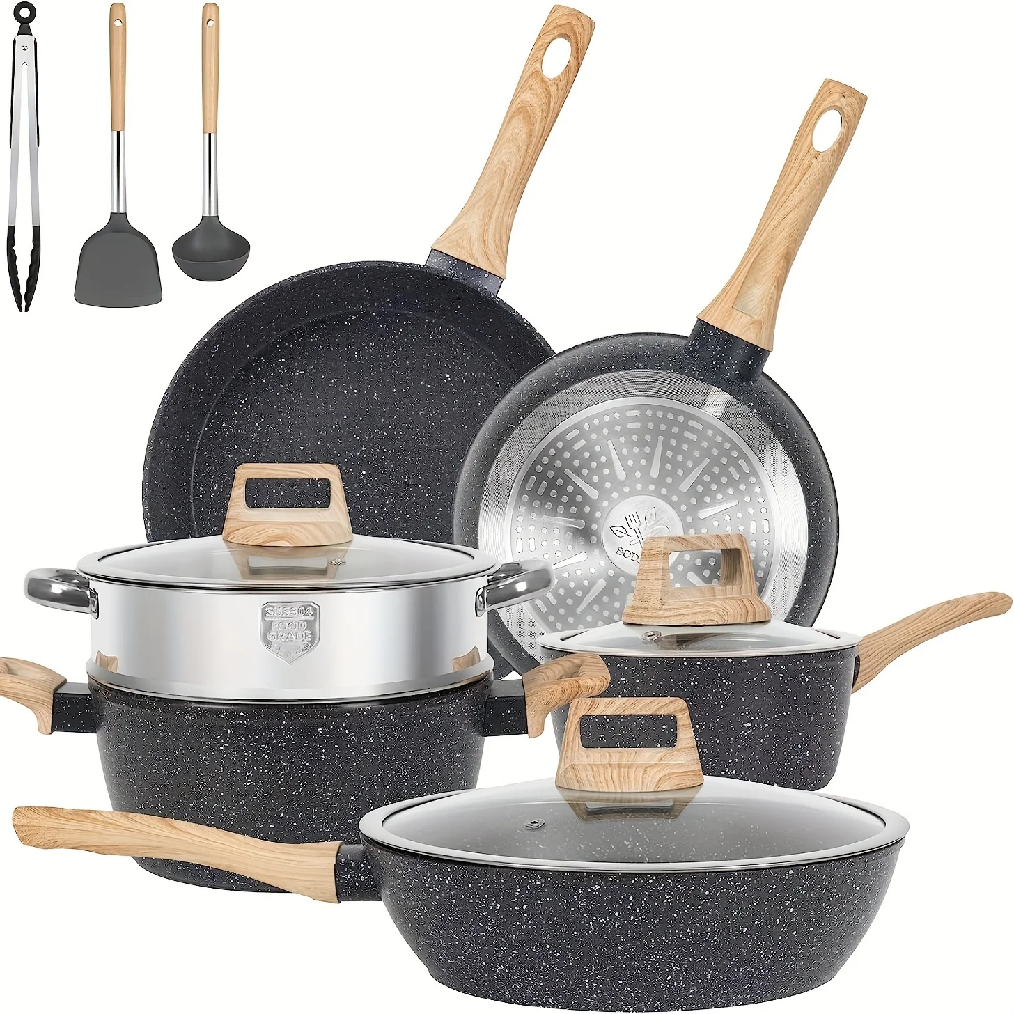 Non-stick 12 POTS and pans Set, Cookware Set, including frying pan, pan, steamer, silicone spatula and tongs - Granite cooking Set (black)