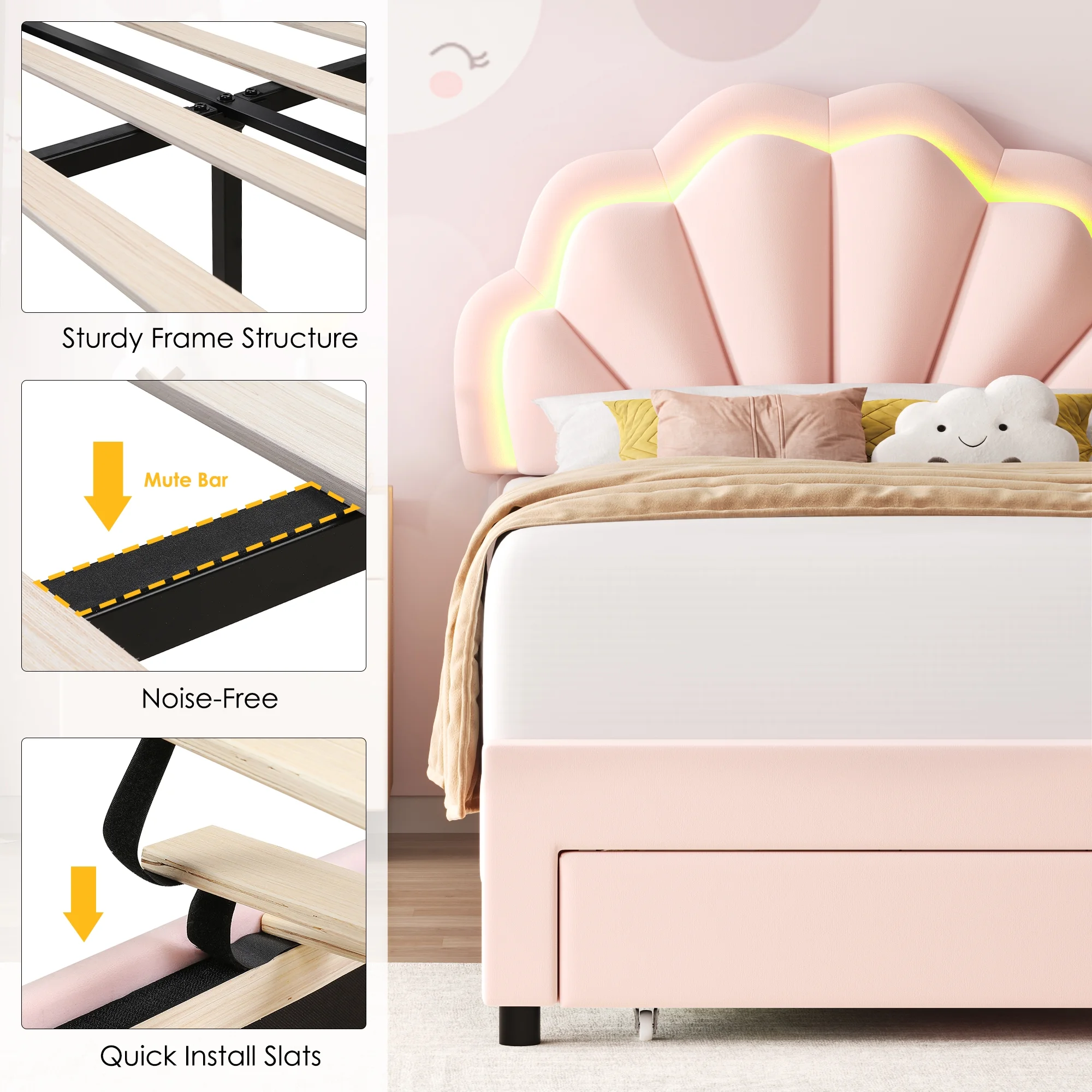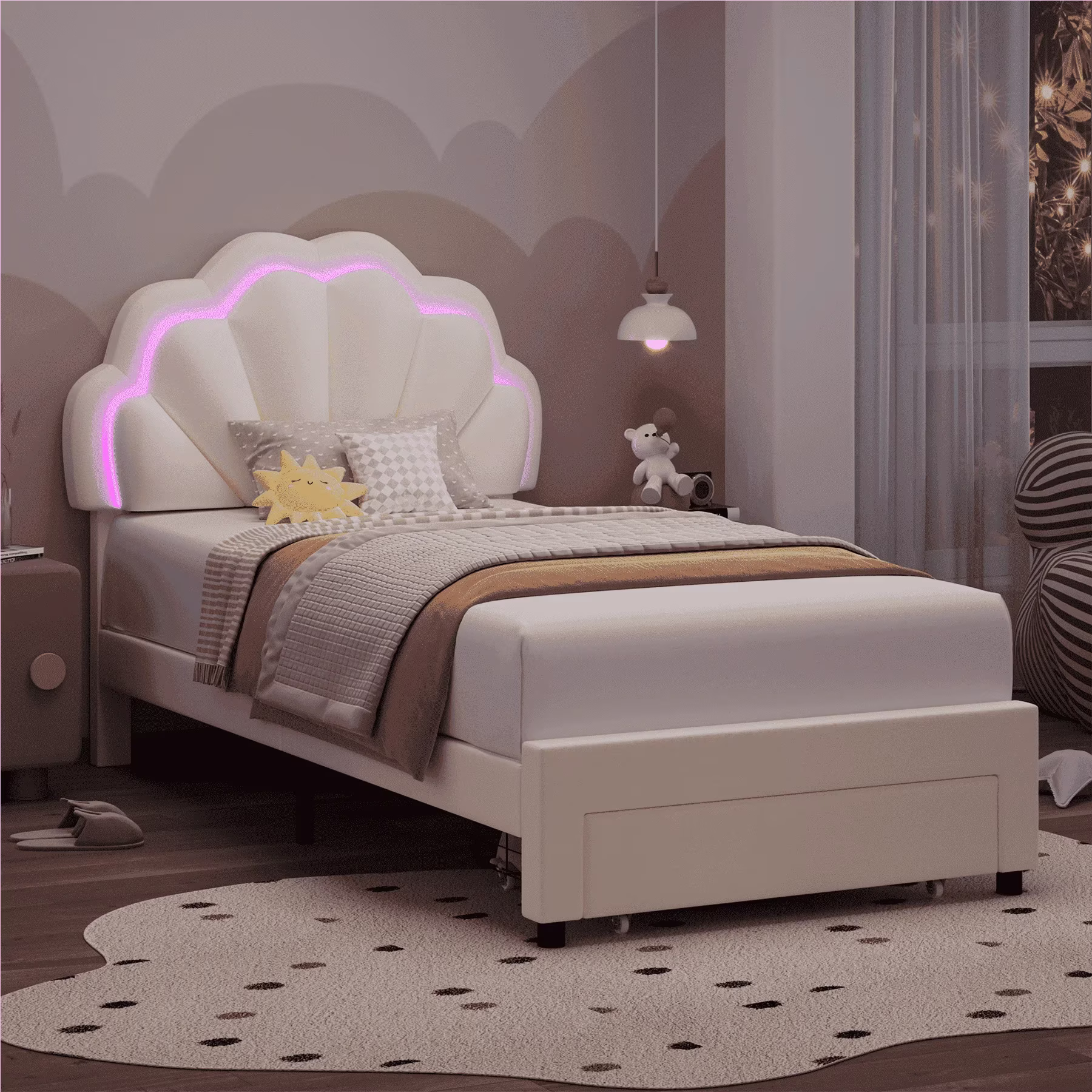 Well upholstered twin headboard of this cream twin bed with storage drawers features colorful LED lights with 3 music-activated modes to stimulate sense of color and imagination, adding more lively joy to bedroom. The soft velvet upholstery and skin-friendly touch take you to sweet dreams every night!