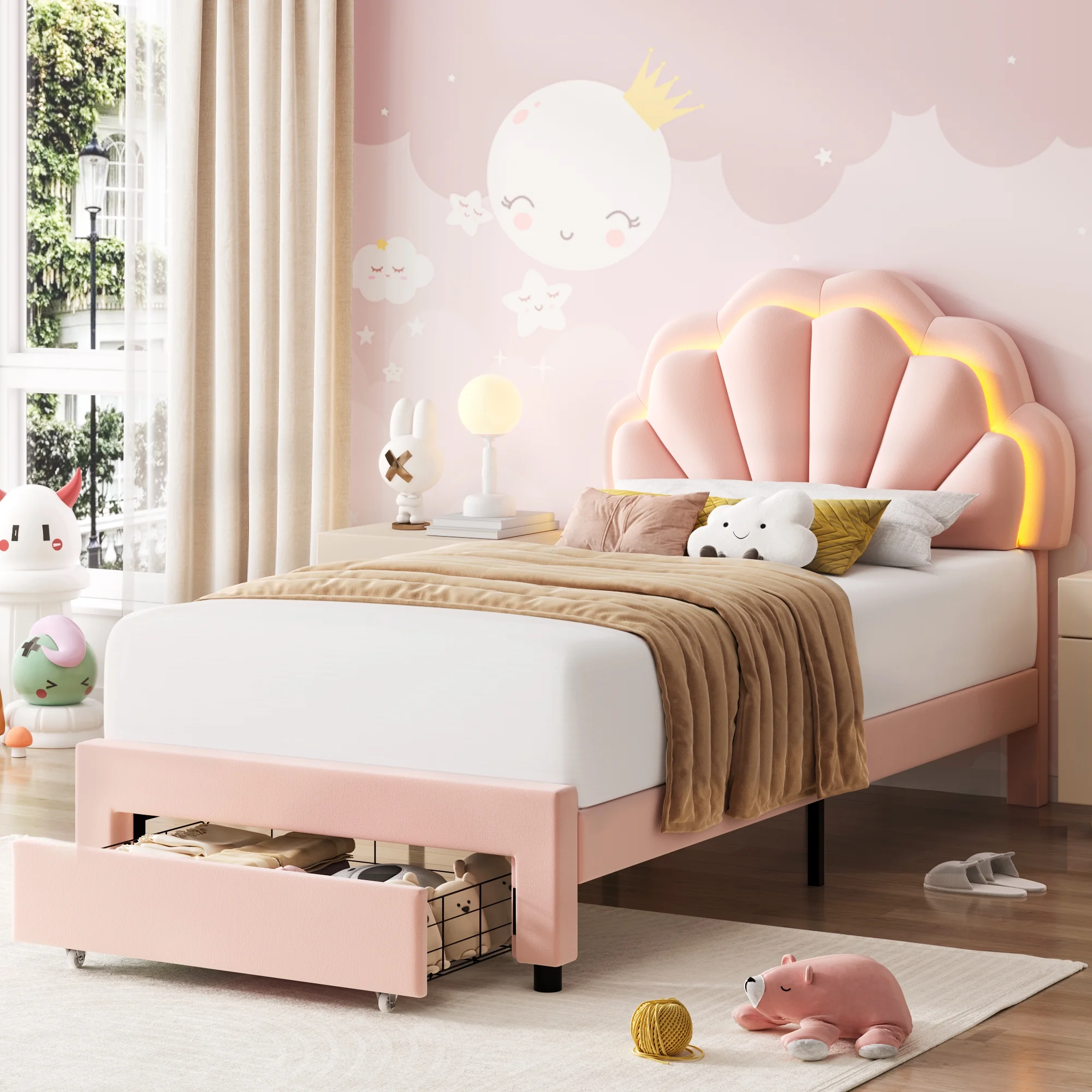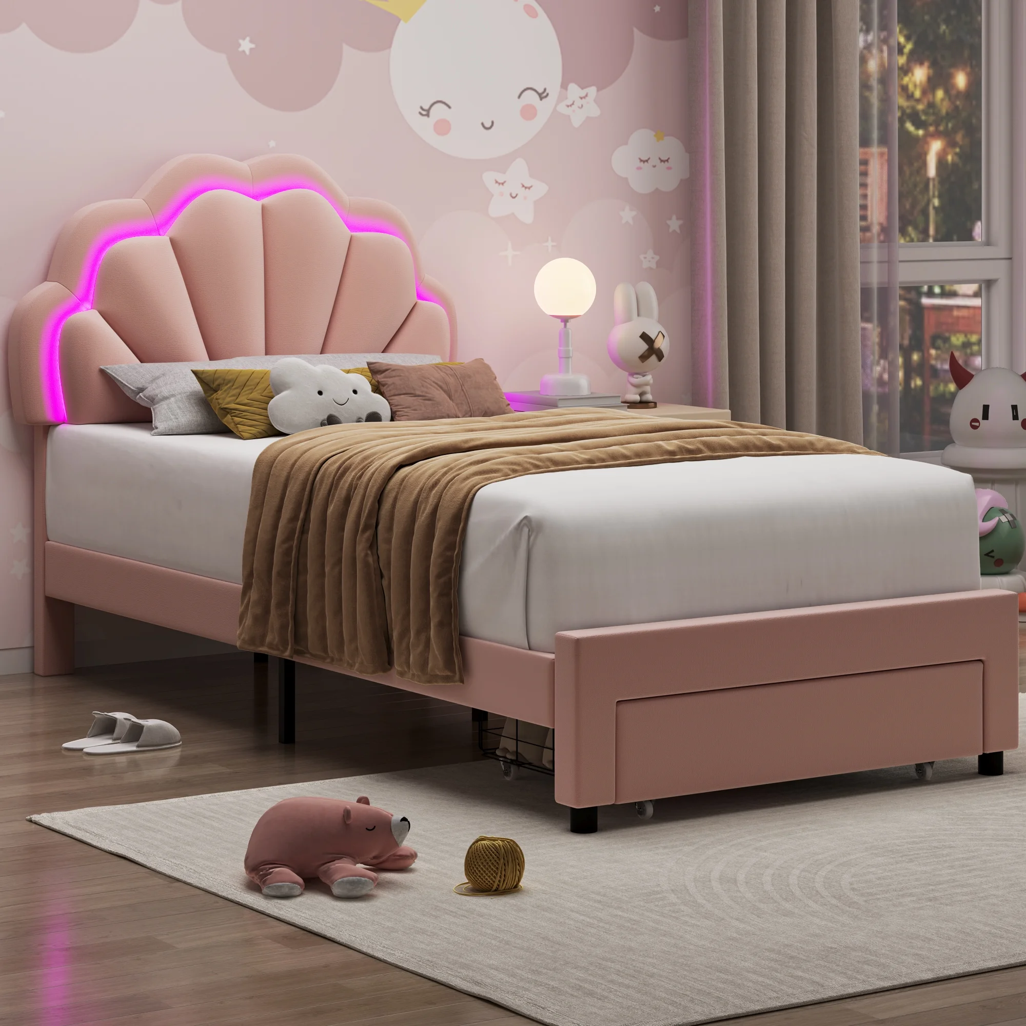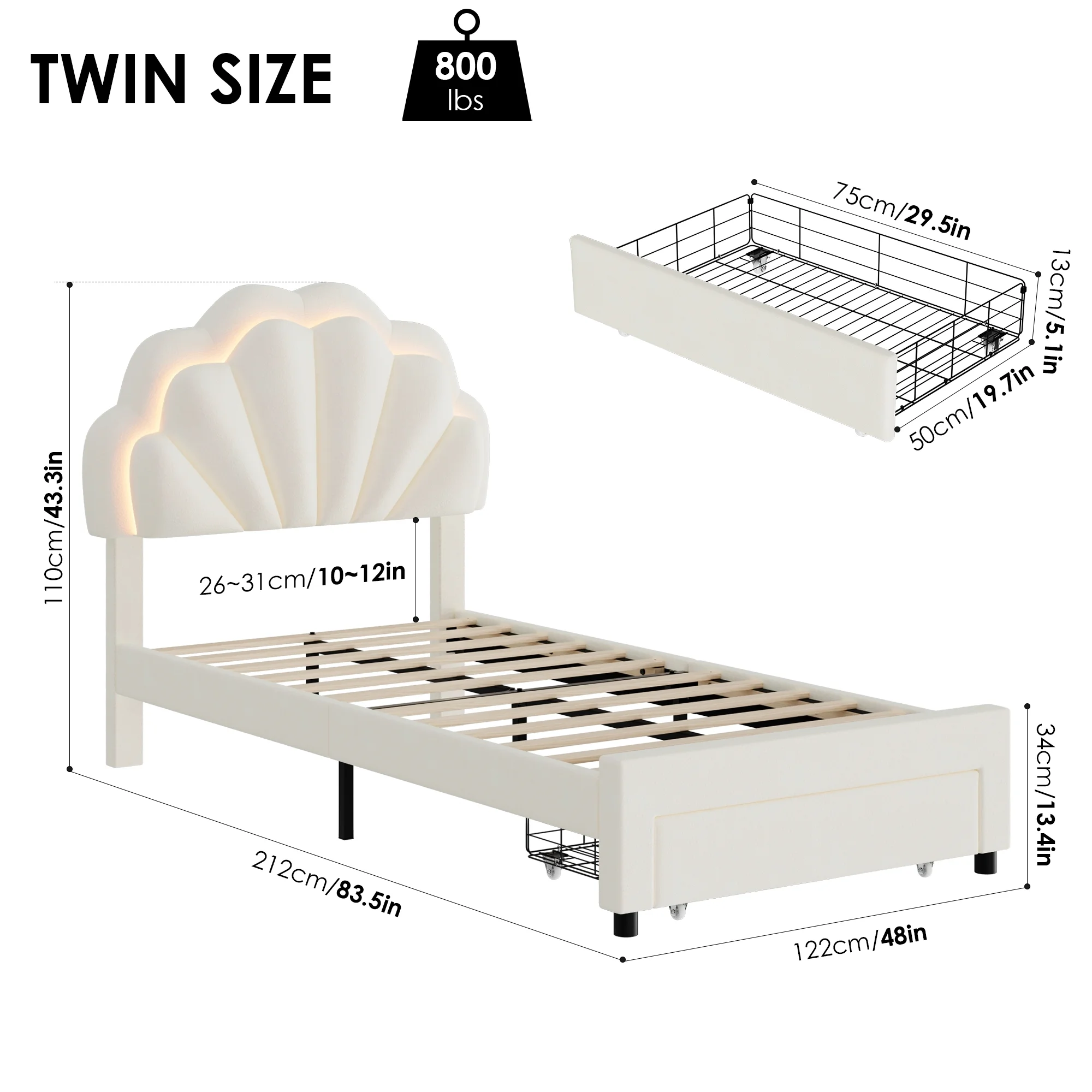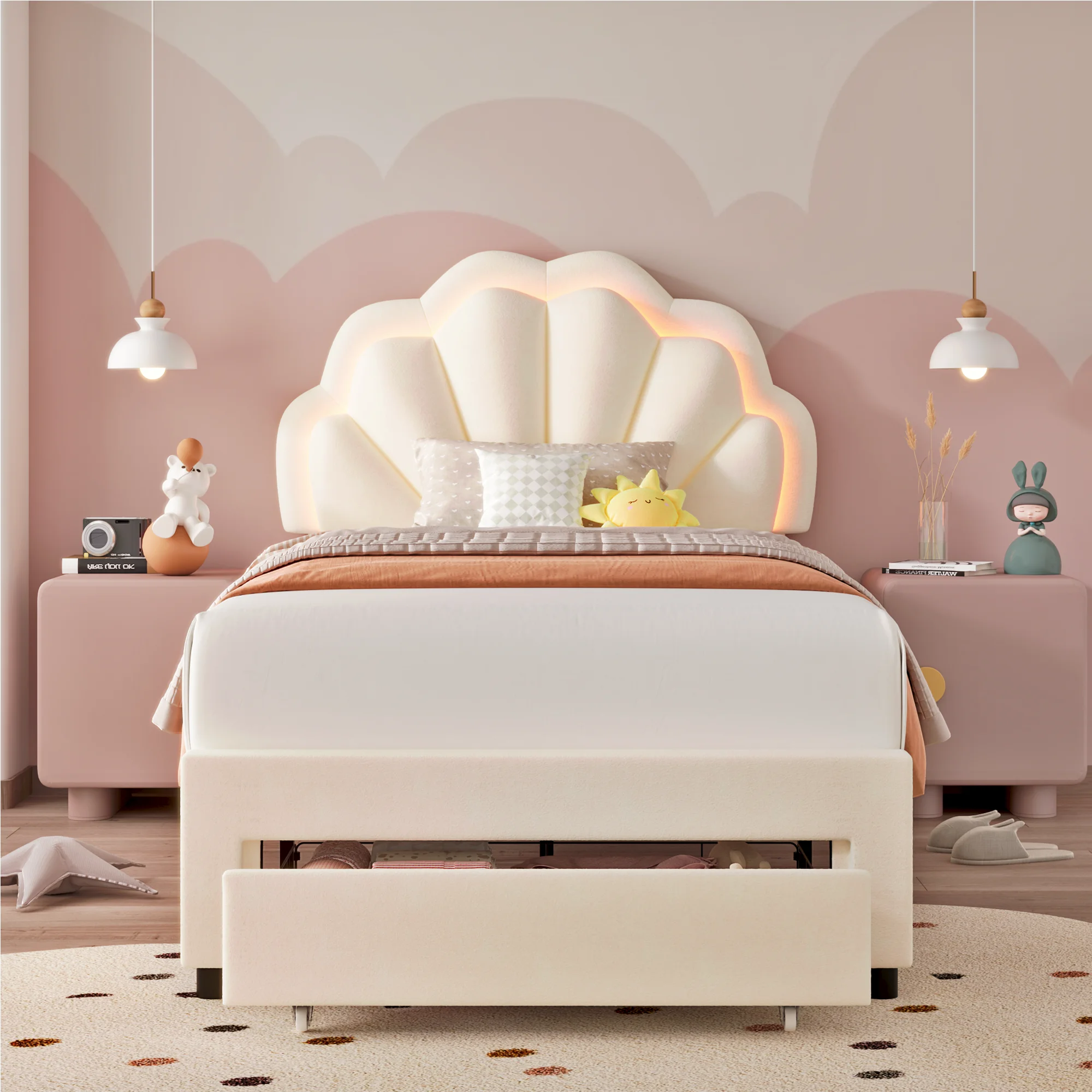 Homfa lovely Bunk Petal Cream Beige Twin Bed with LED Lights is perfect for your bedroom! This beige twin bed comes with 2 large storage drawers on wheels, not only chic and elegant, but also providing storage space for bedroom. Blankets, clothes, and many thing finally get an excellent plan to place.