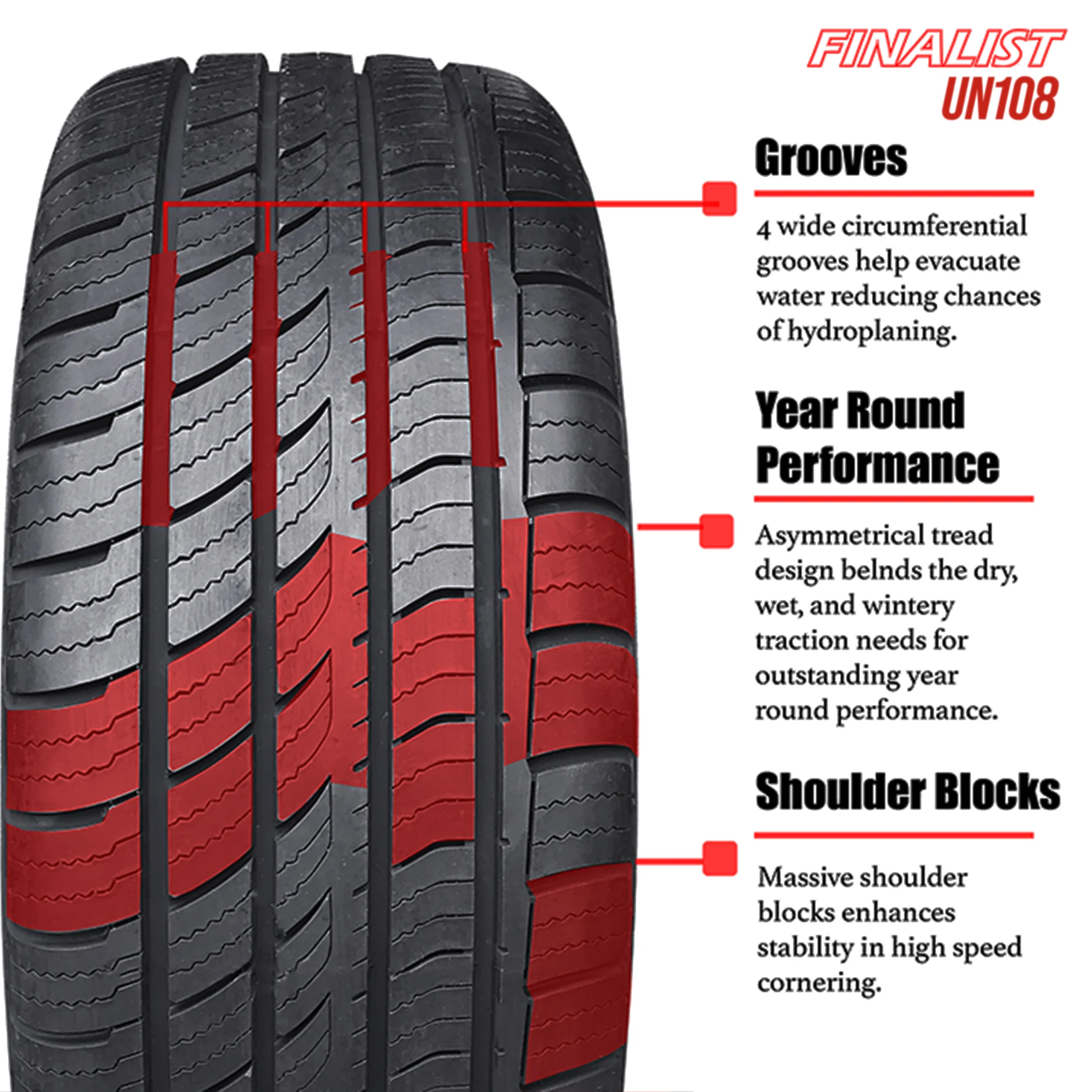 The Finalist UN108 is an ultra-high performance all-season tire that offers high-speed performance,cornering,and braking.It offering a premium quality tire at an economical price point.An aggressive tread pattern can deliver a perfect balance between ultra-high-performance and everyday comfort.