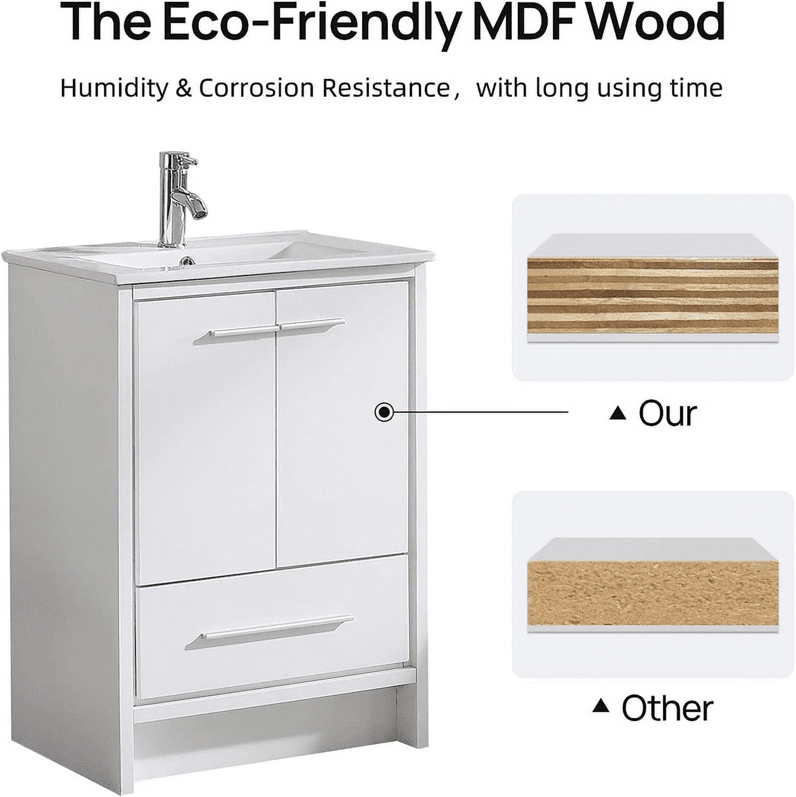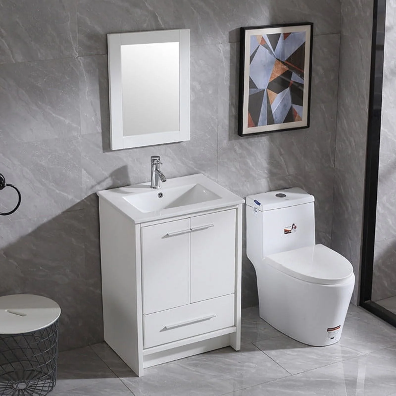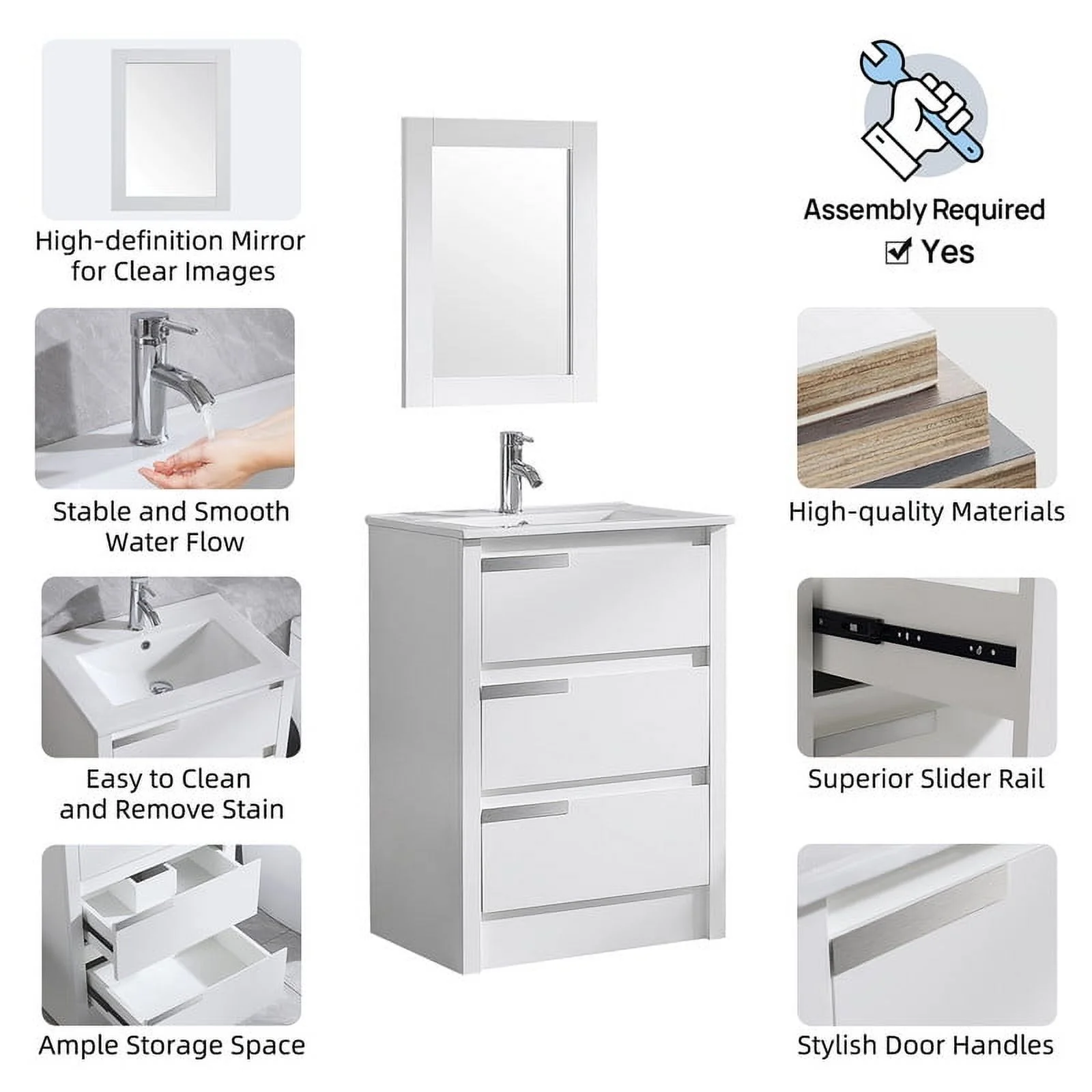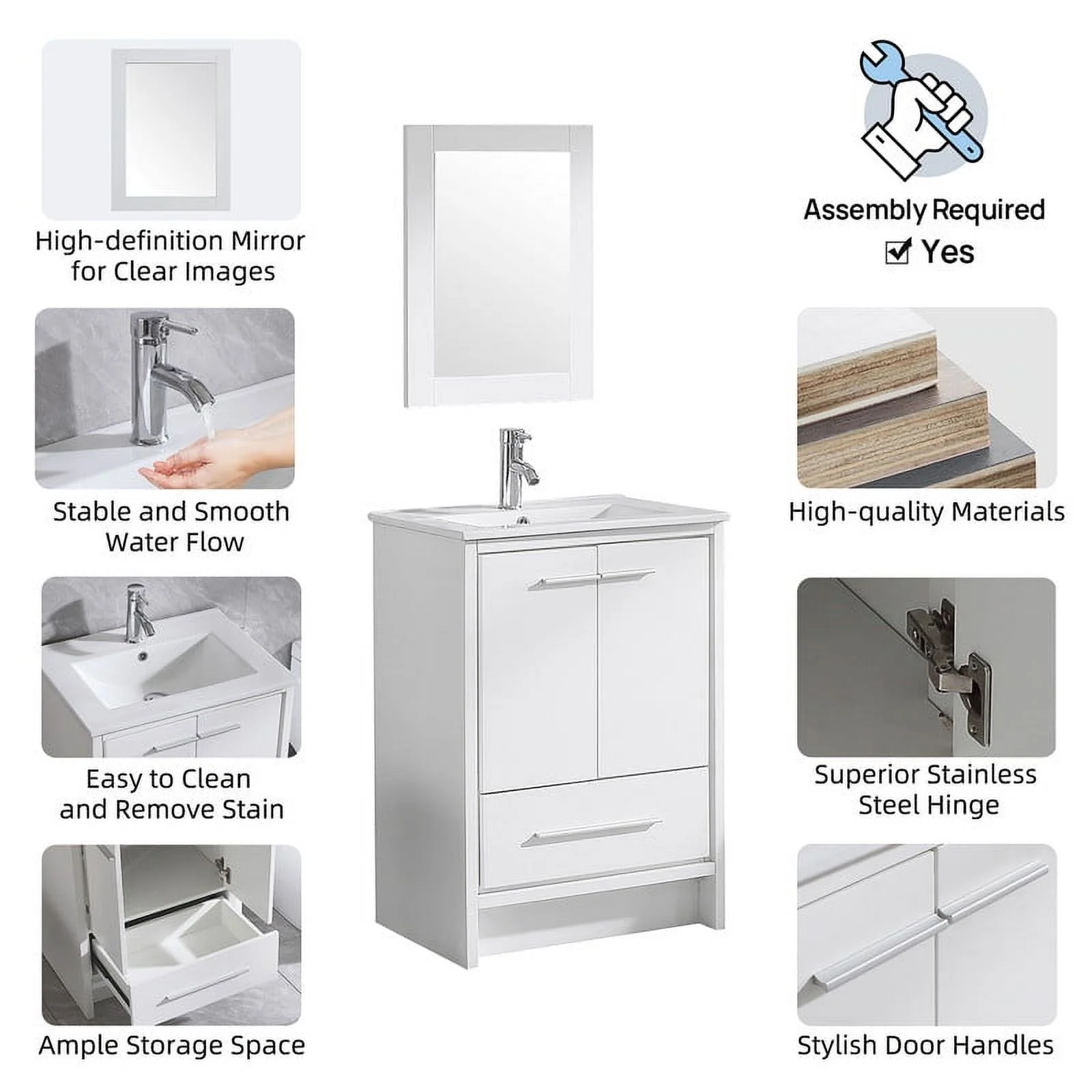 Walsport 24" Luxurious Bathroom Vanity with Ceramic Sink and Countertop and Mirror and Faucet, Double Door Stand Floor Cabinet Bathroom Storage Vanity with Pop up Drain, White