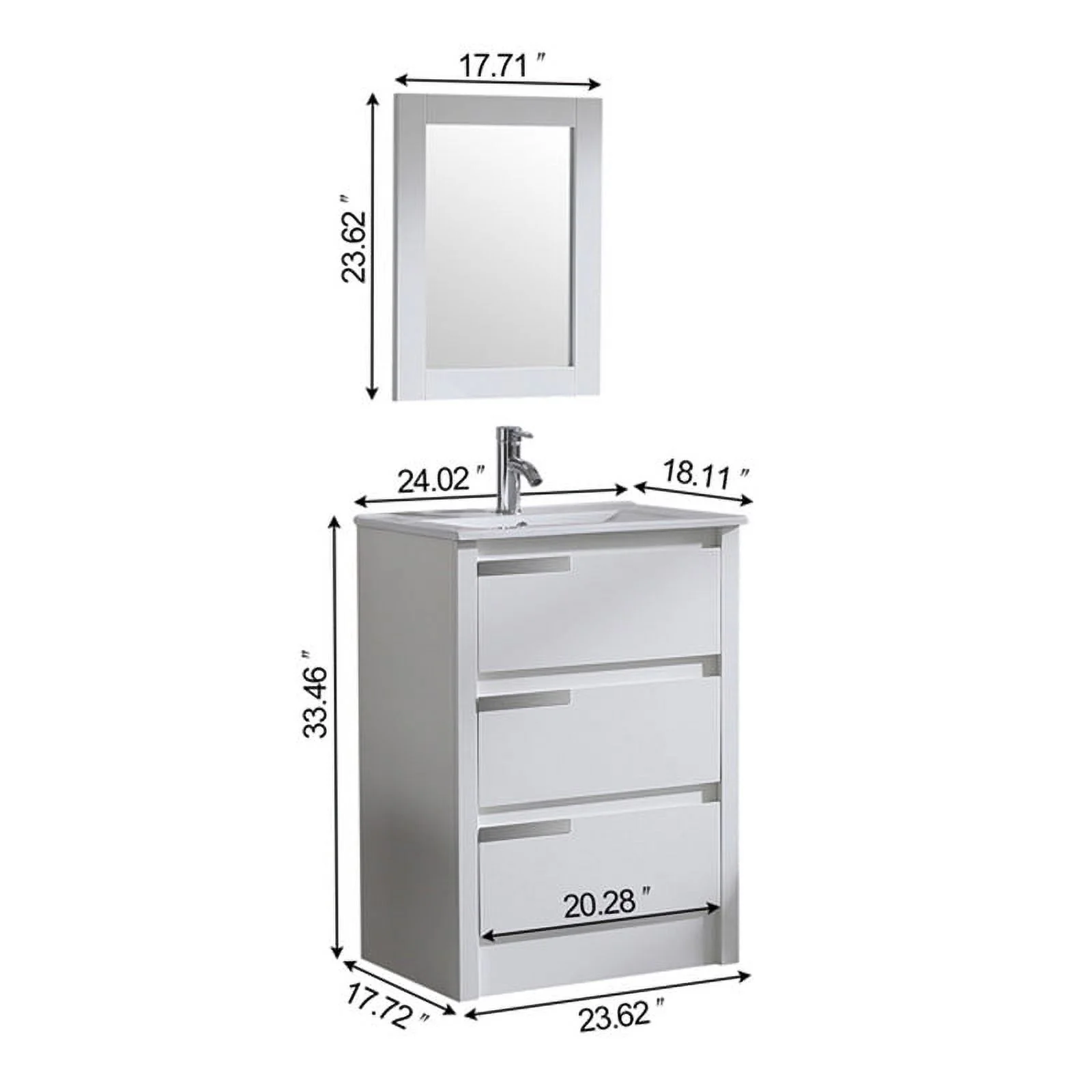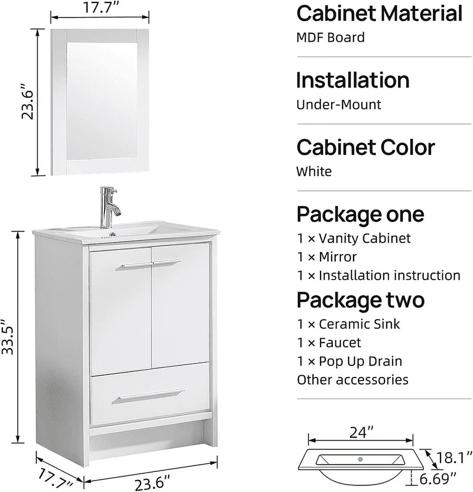 - Dimensionsl:Vanity Size: 23.6"L x 17.7"W x 33.5”H. Mirror size: 17.7”L X 23.6”H. Sink Size: 24"L x 18.1"W x 6.69”H