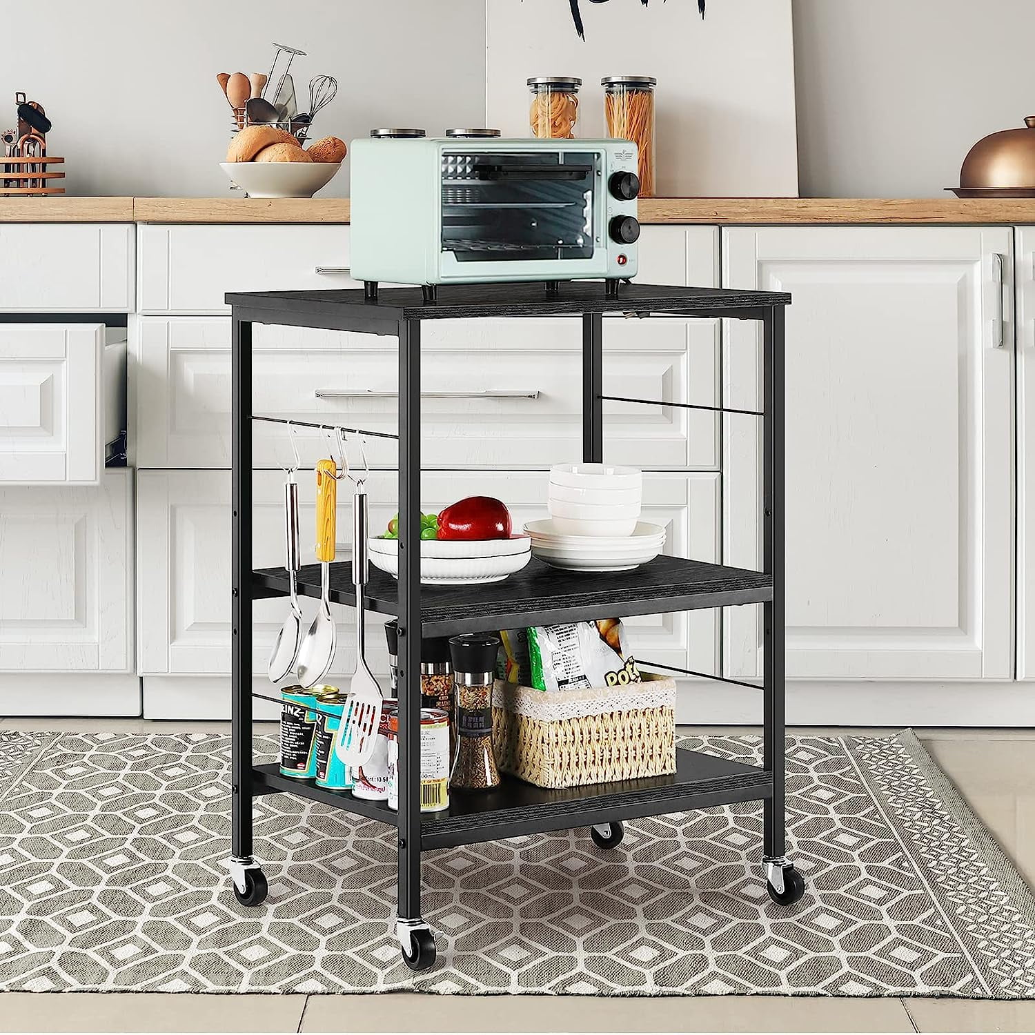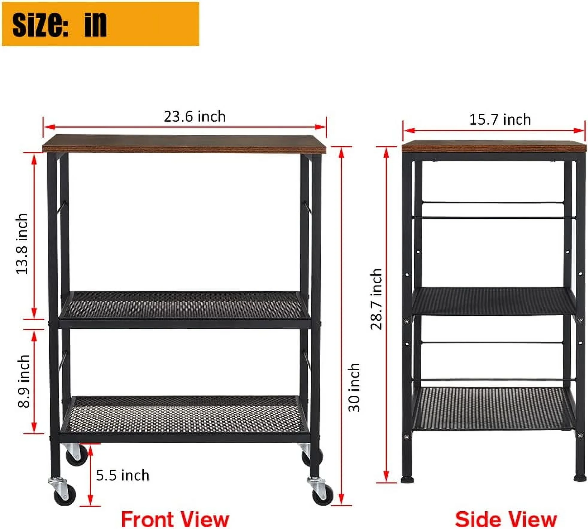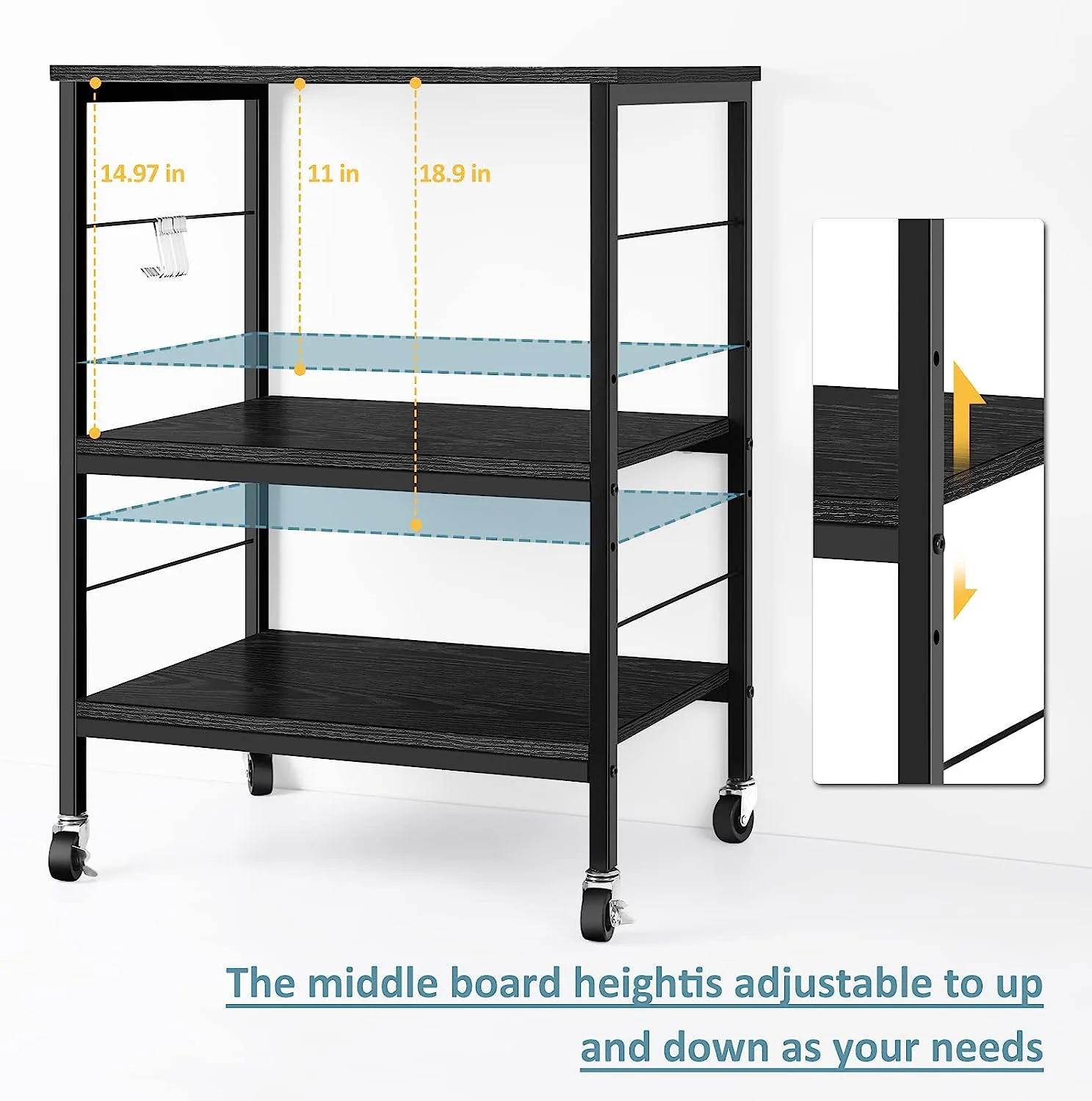 - 【Organize and Save Space】The overall size of microwave cart with wheels is 23.63×15.75×30.71 inches, which can provide you with larger storage space. The middle shelf can be adjusted up and down, allowing you to store larger items; the hooks can conveniently hang some cooking tools or document bags on the side.