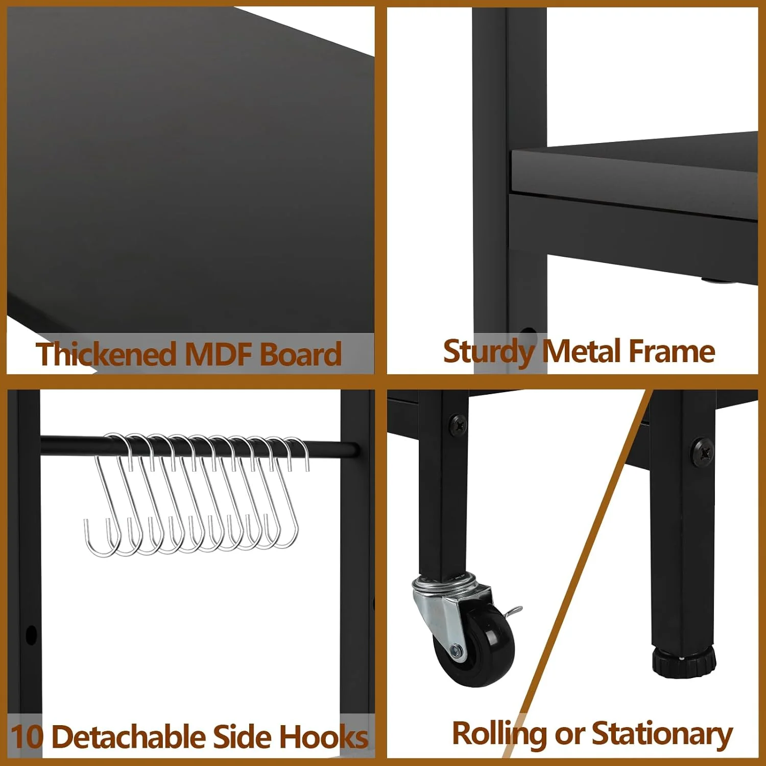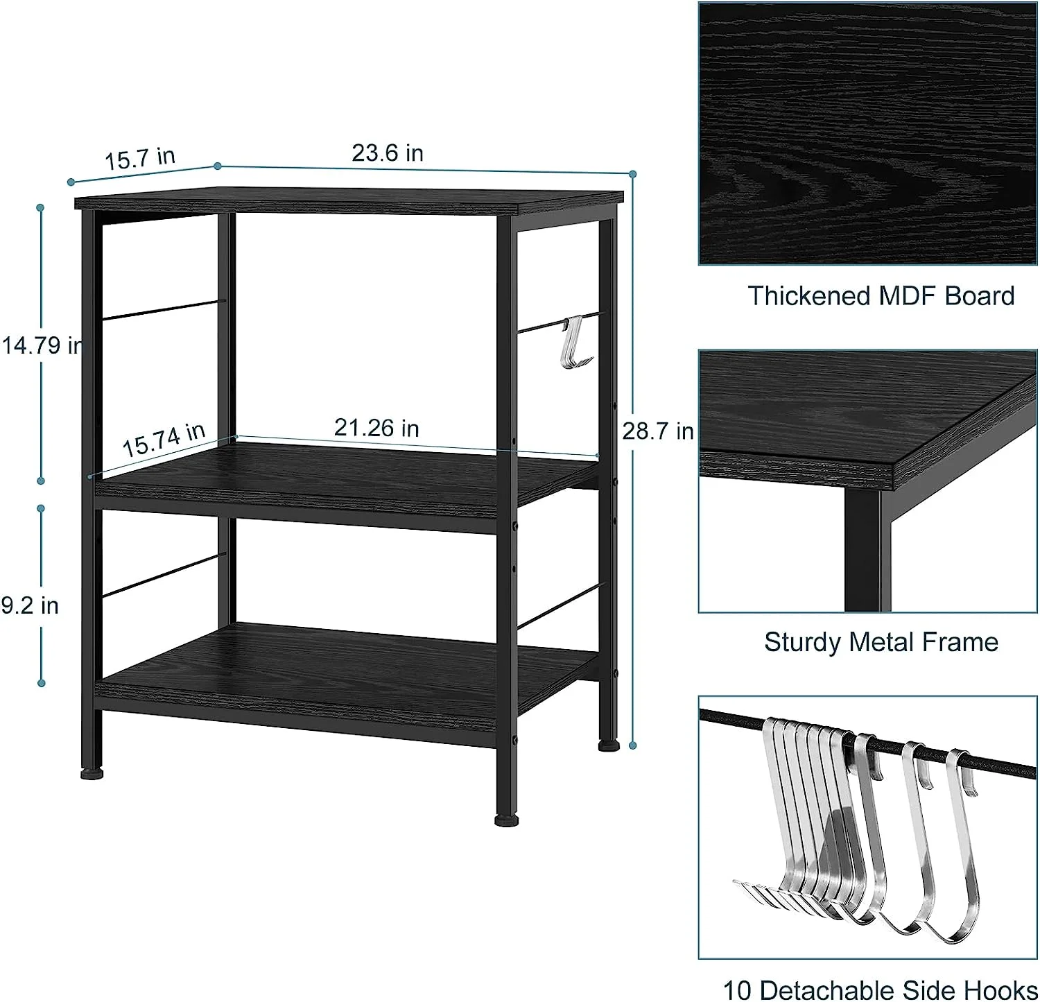 Bakers Rack with Power Outlet Microwave Shelf Stand Black Coffee Bar Table Cart 3 Tier Kitchen Carts on Wheels with Storage and 10 S - Shaped Hooks for Living Room Dining Room Office