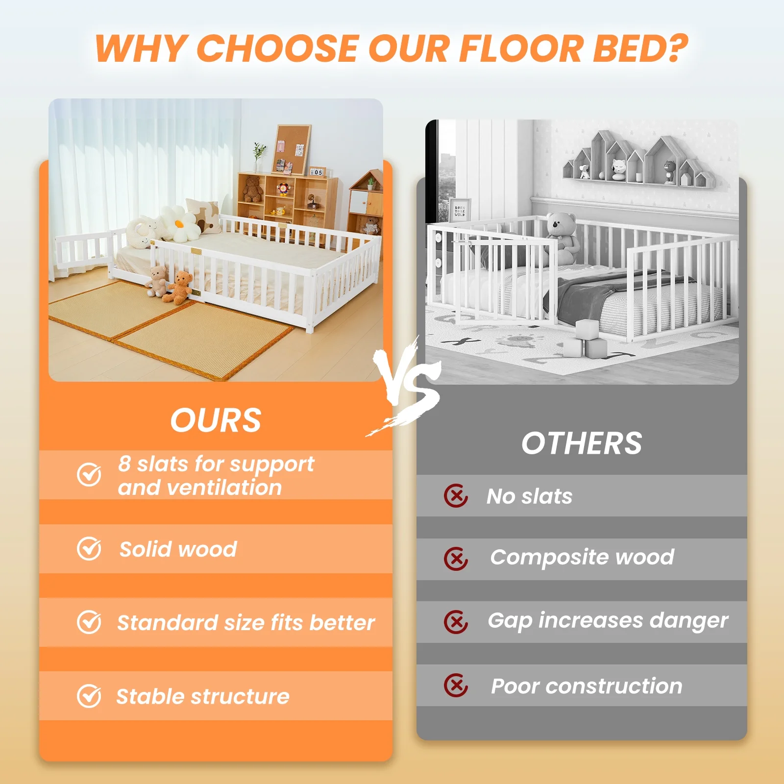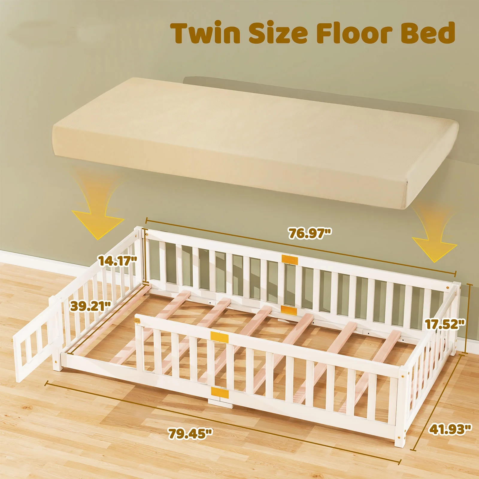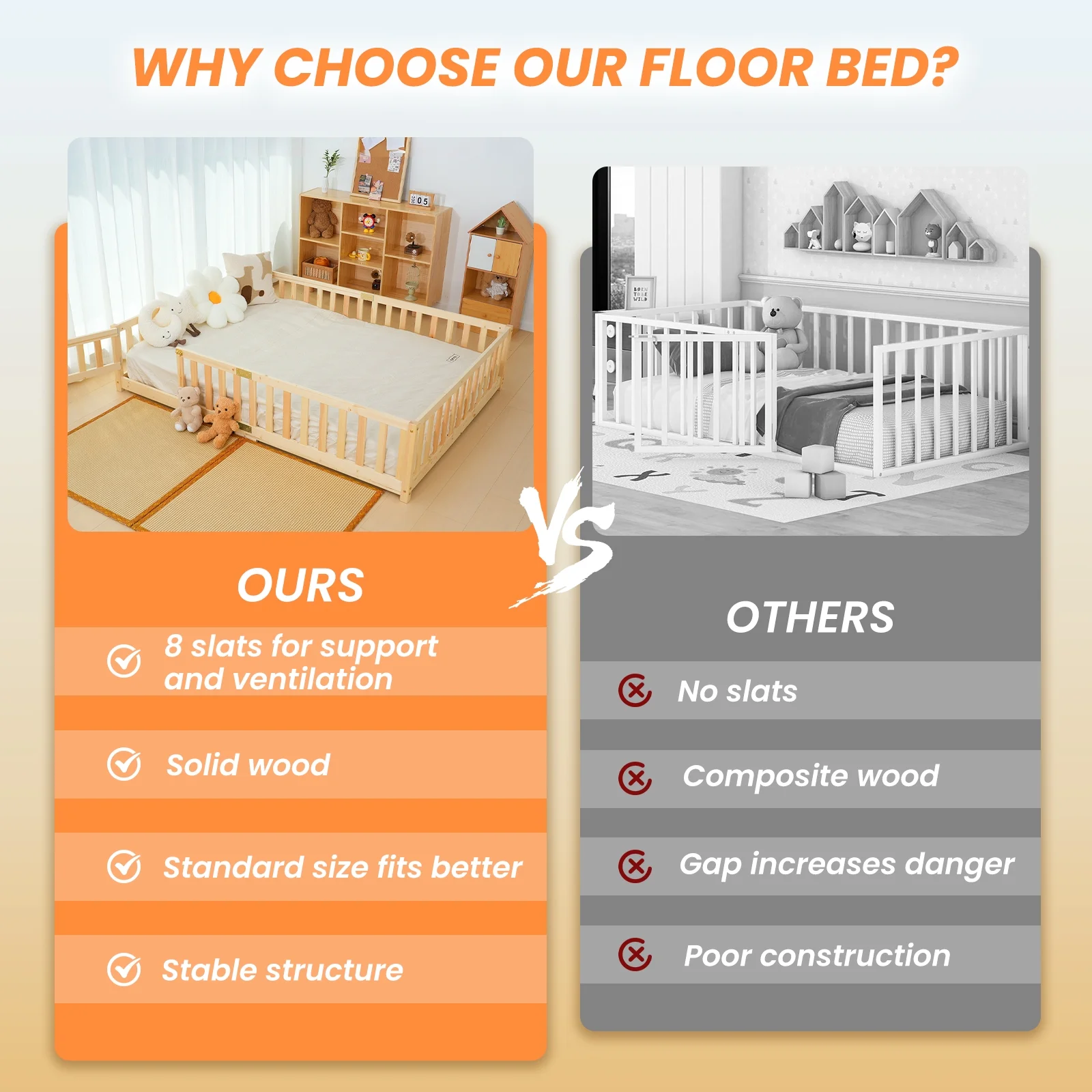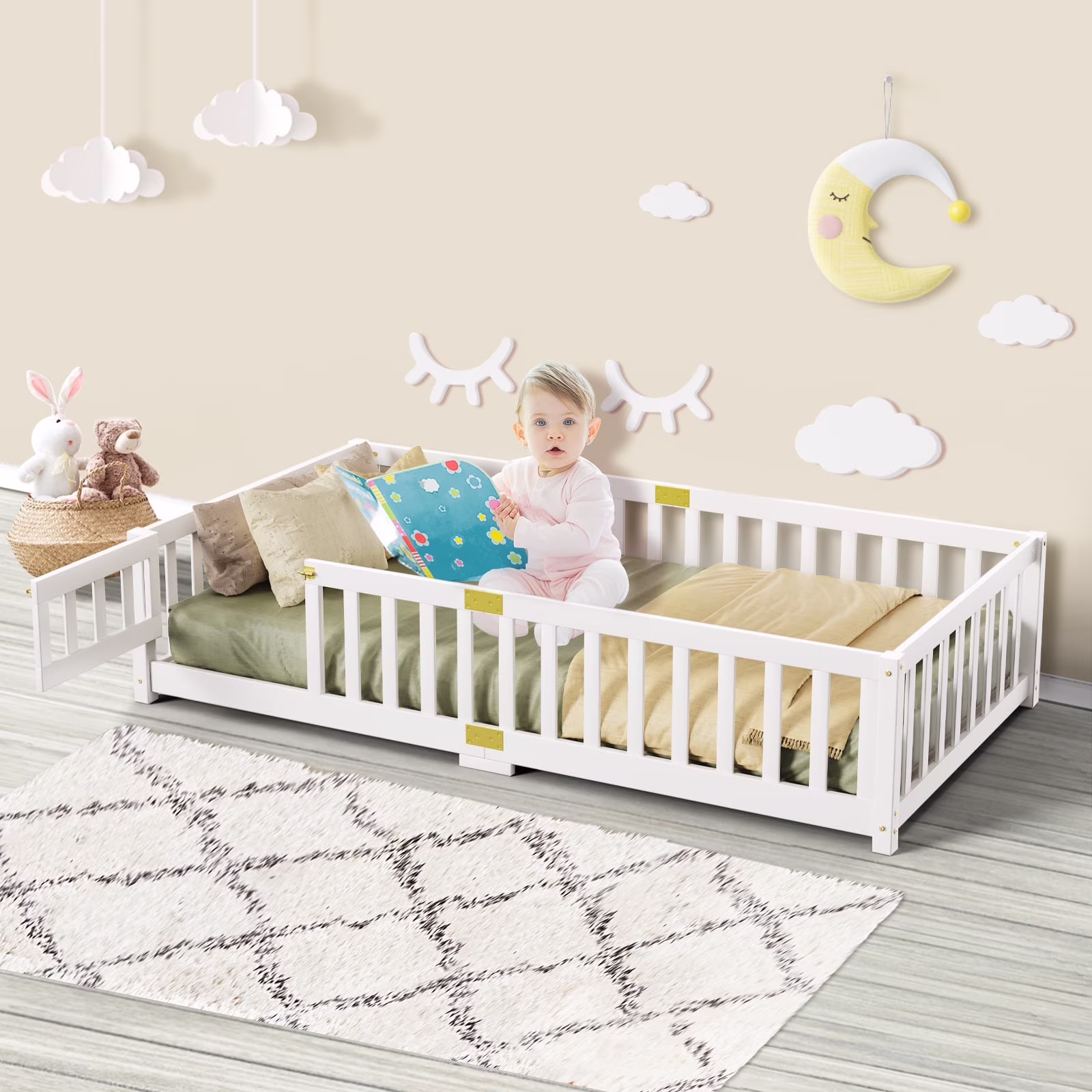 【Twin & Full Size Floor Bed for Kids�?/b>Slsy floor bed for kids is available in two sizes �?Twin (79.45"L x 41.93"W x 17.52"H) and Full (79.45"L x 57.4"W x 17.52"H). Designed with children in mind, this floor bed features a low-profile frame with protective fencing and supportive slats, making it not only a comfortable place to sleep but also a cozy space for reading, playing, or relaxing. Its versatile design blends function and fun, fitting seamlessly into any child’s room.