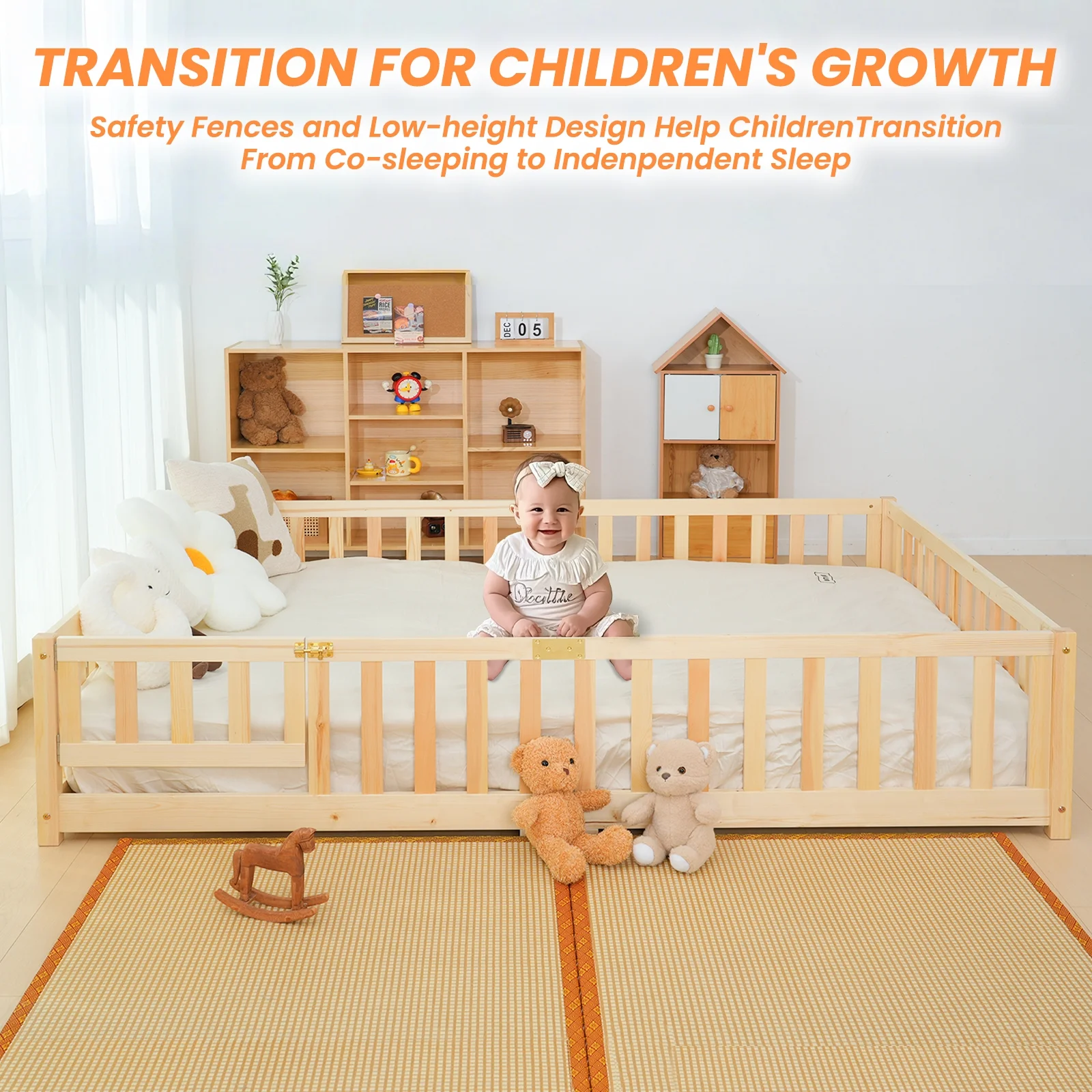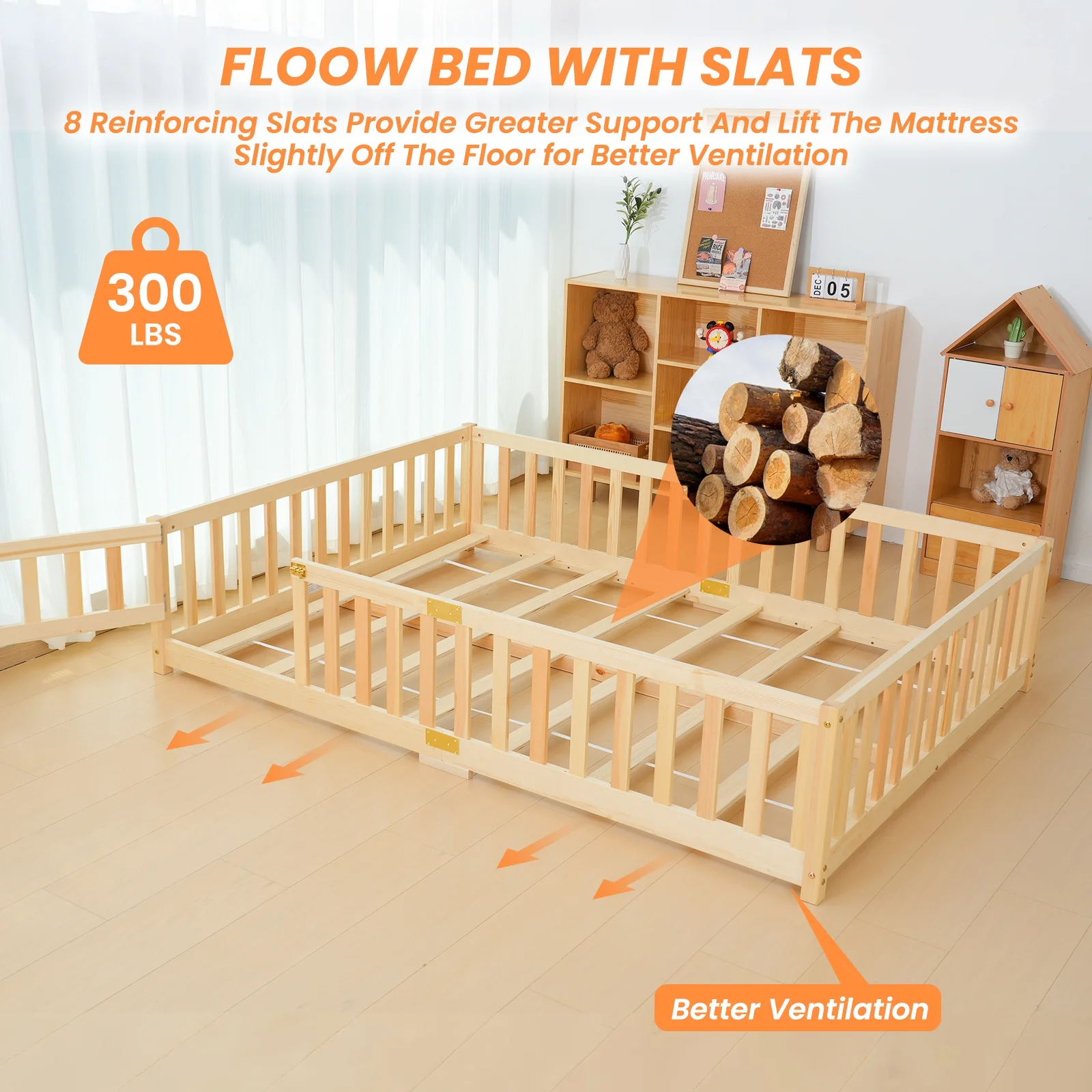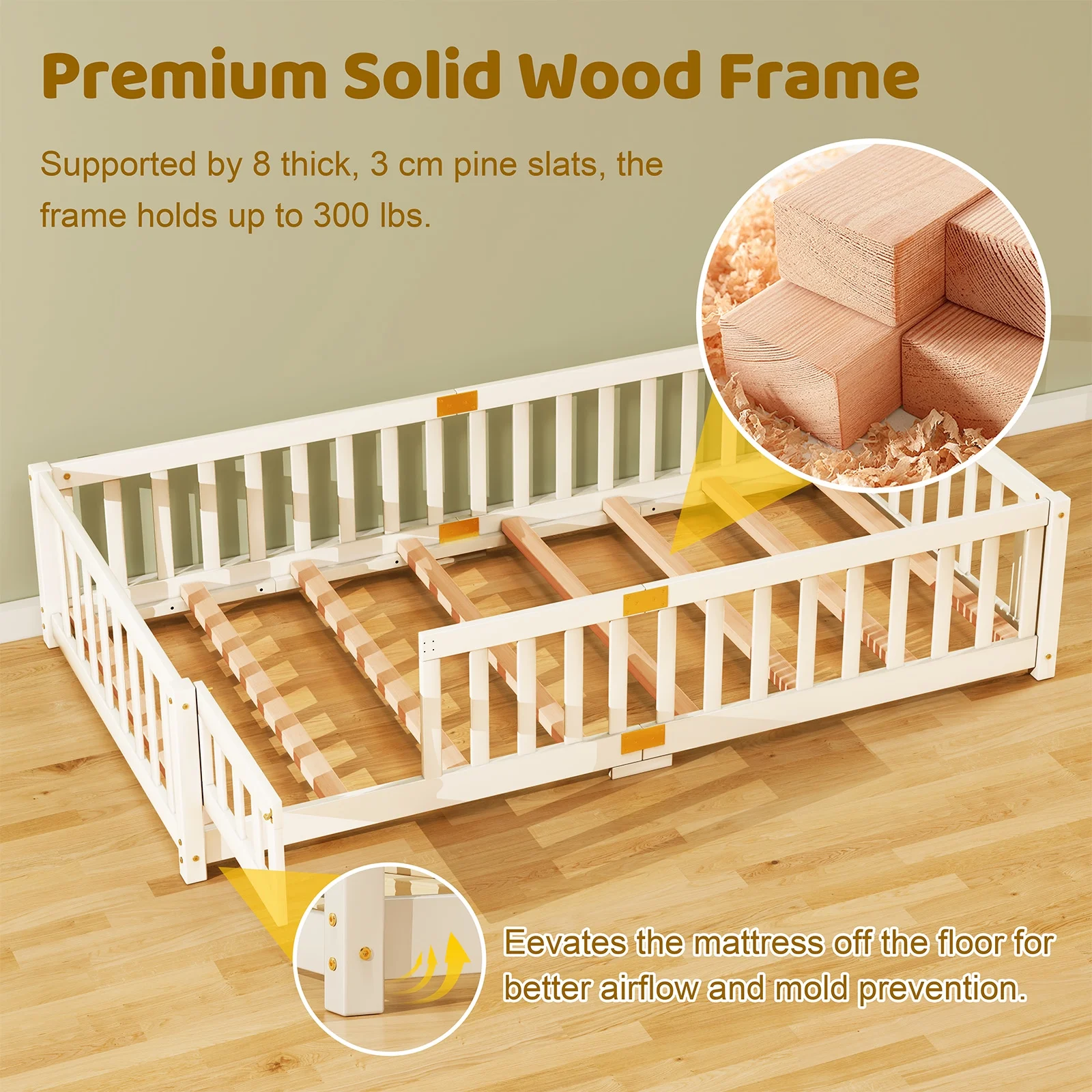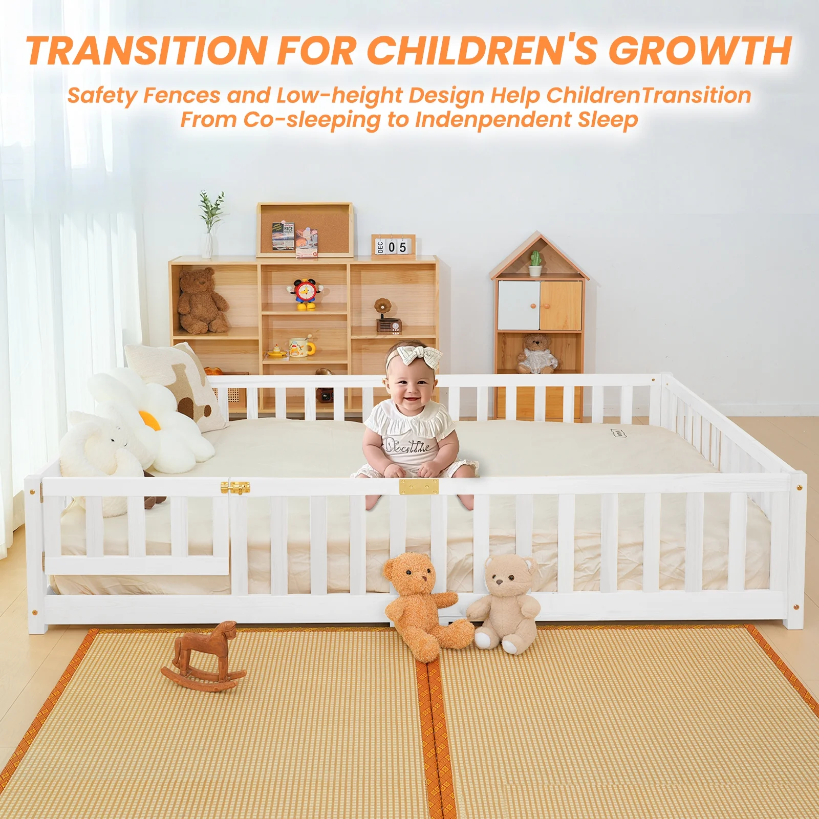 【Twin & Full Size Floor Bed for Kids�?/b>Slsy floor bed for kids is available in two sizes �?Twin (79.45"L x 41.93"W x 17.52"H) and Full (79.45"L x 57.4"W x 17.52"H). Designed with children in mind, this floor bed features a low-profile frame with protective fencing and supportive slats, making it not only a comfortable place to sleep but also a cozy space for reading, playing, or relaxing. Its versatile design blends function and fun, fitting seamlessly into any child’s room.
