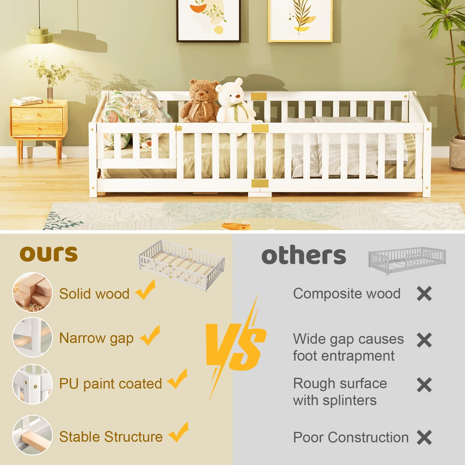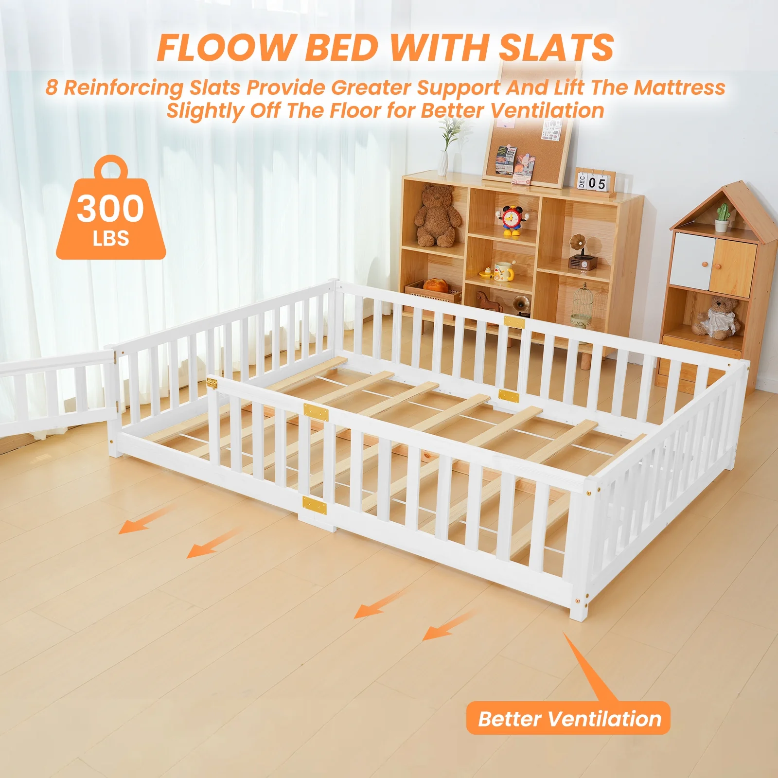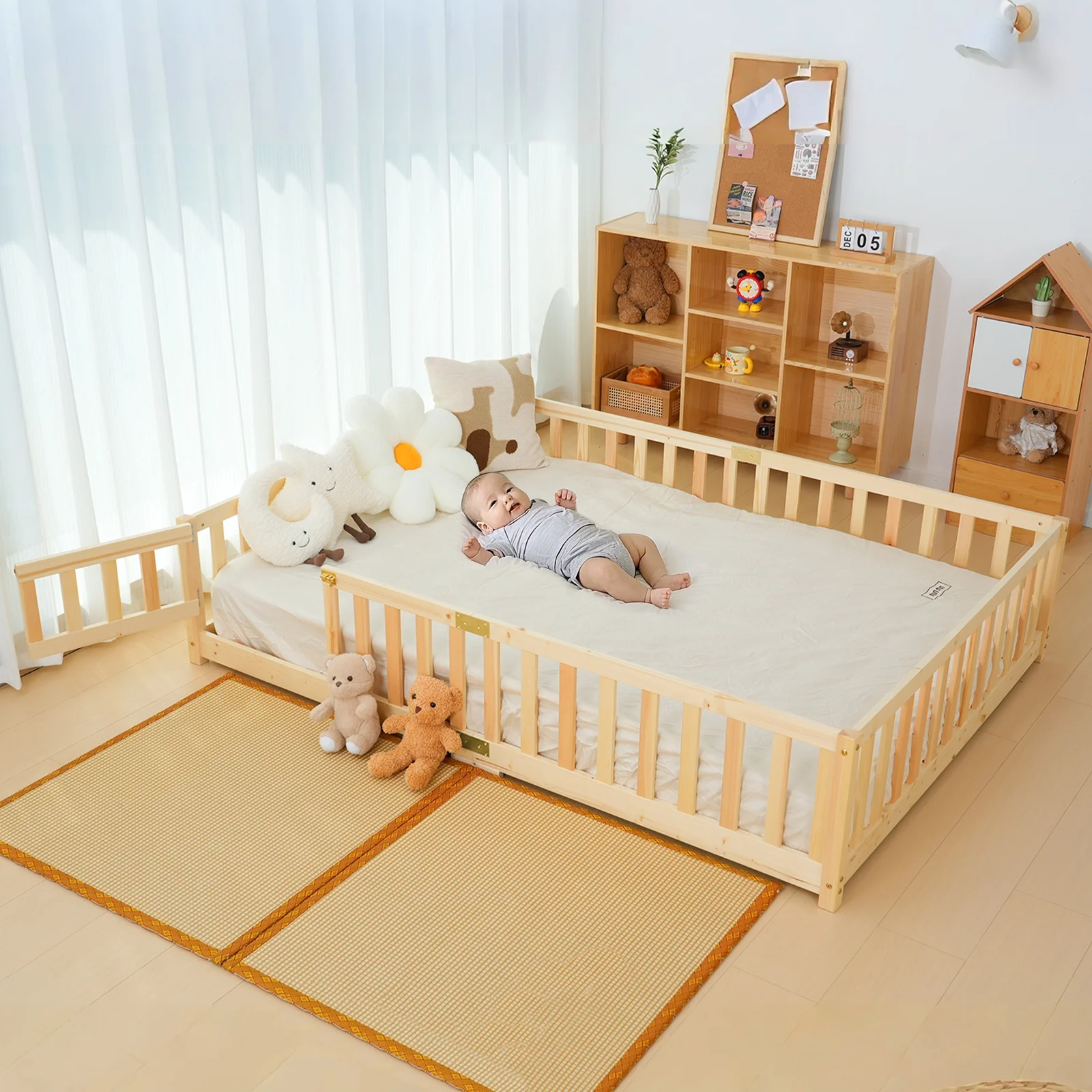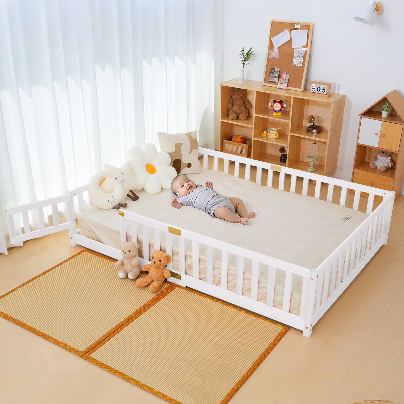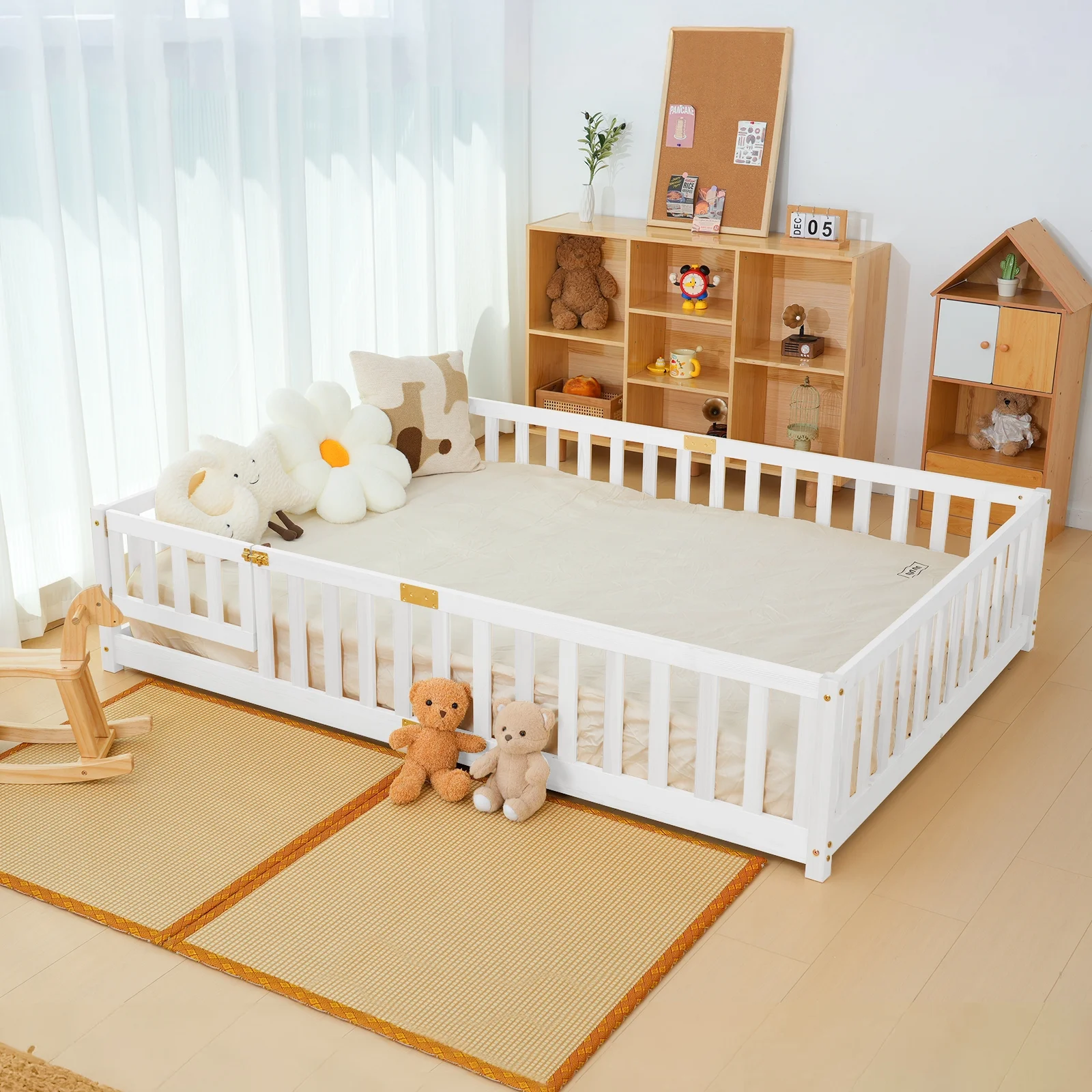 【Twin & Full Size Floor Bed for Kids�?/b>Slsy floor bed for kids is available in two sizes �?Twin (79.45"L x 41.93"W x 17.52"H) and Full (79.45"L x 57.4"W x 17.52"H). Designed with children in mind, this floor bed features a low-profile frame with protective fencing and supportive slats, making it not only a comfortable place to sleep but also a cozy space for reading, playing, or relaxing. Its versatile design blends function and fun, fitting seamlessly into any child’s room.