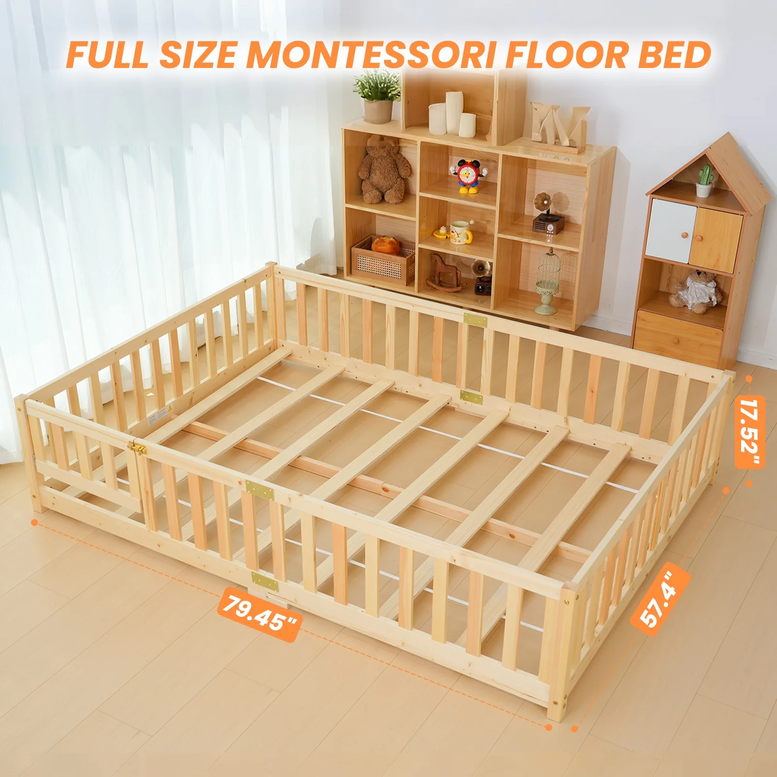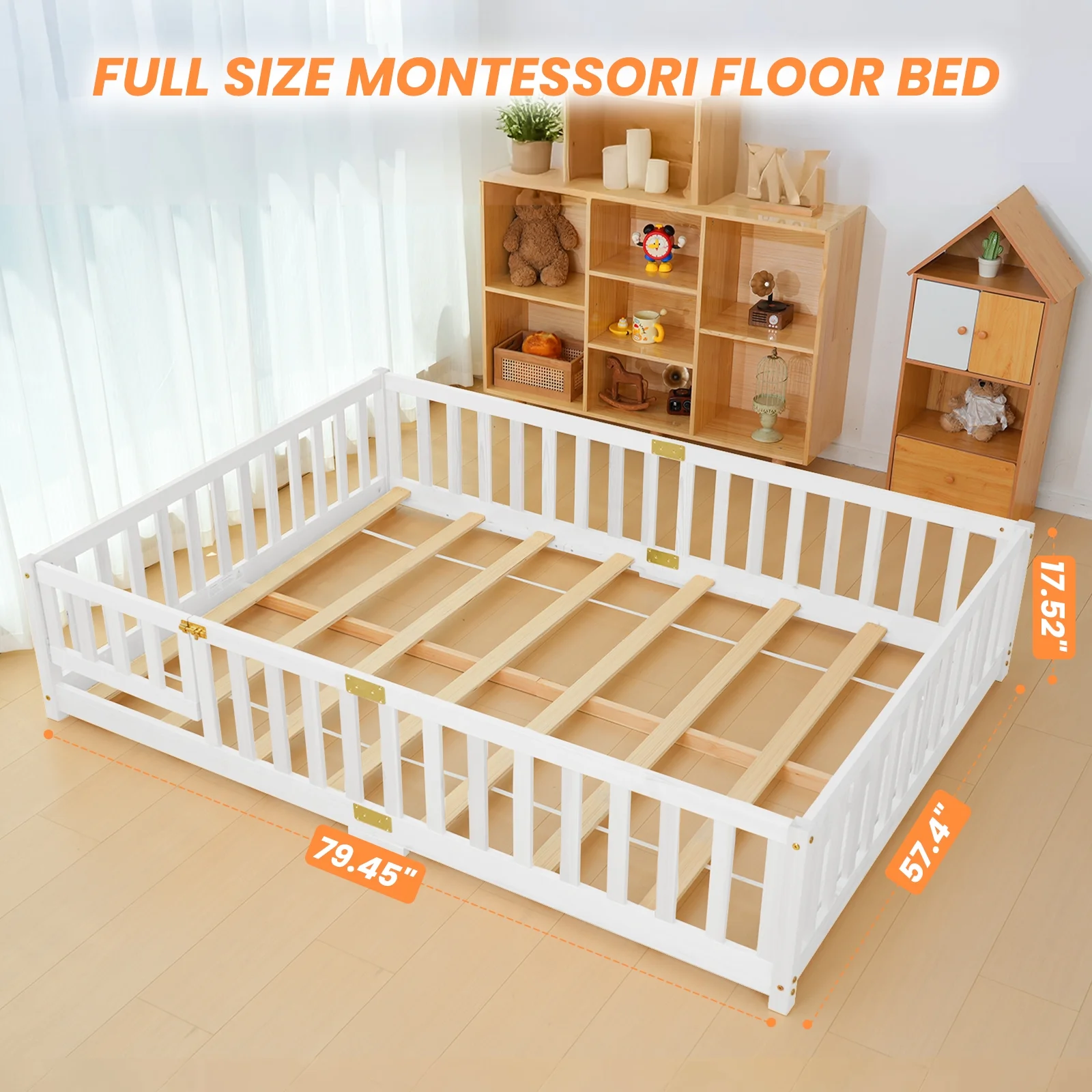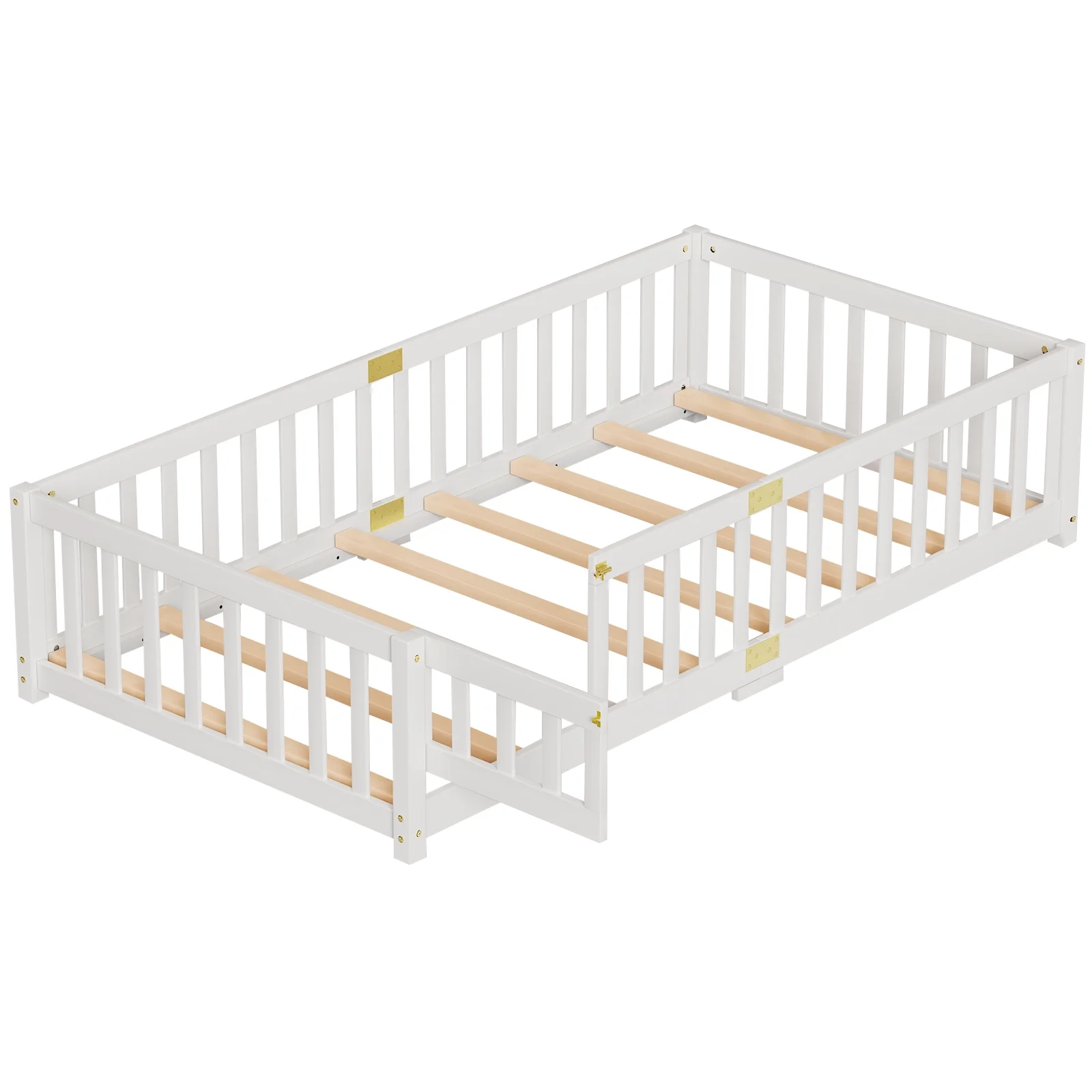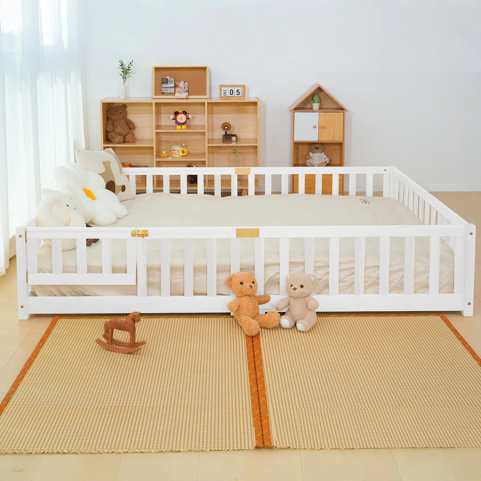 【Twin & Full Size Floor Bed for Kids�?/b>Slsy floor bed for kids is available in two sizes �?Twin (79.45"L x 41.93"W x 17.52"H) and Full (79.45"L x 57.4"W x 17.52"H). Designed with children in mind, this floor bed features a low-profile frame with protective fencing and supportive slats, making it not only a comfortable place to sleep but also a cozy space for reading, playing, or relaxing. Its versatile design blends function and fun, fitting seamlessly into any child’s room.