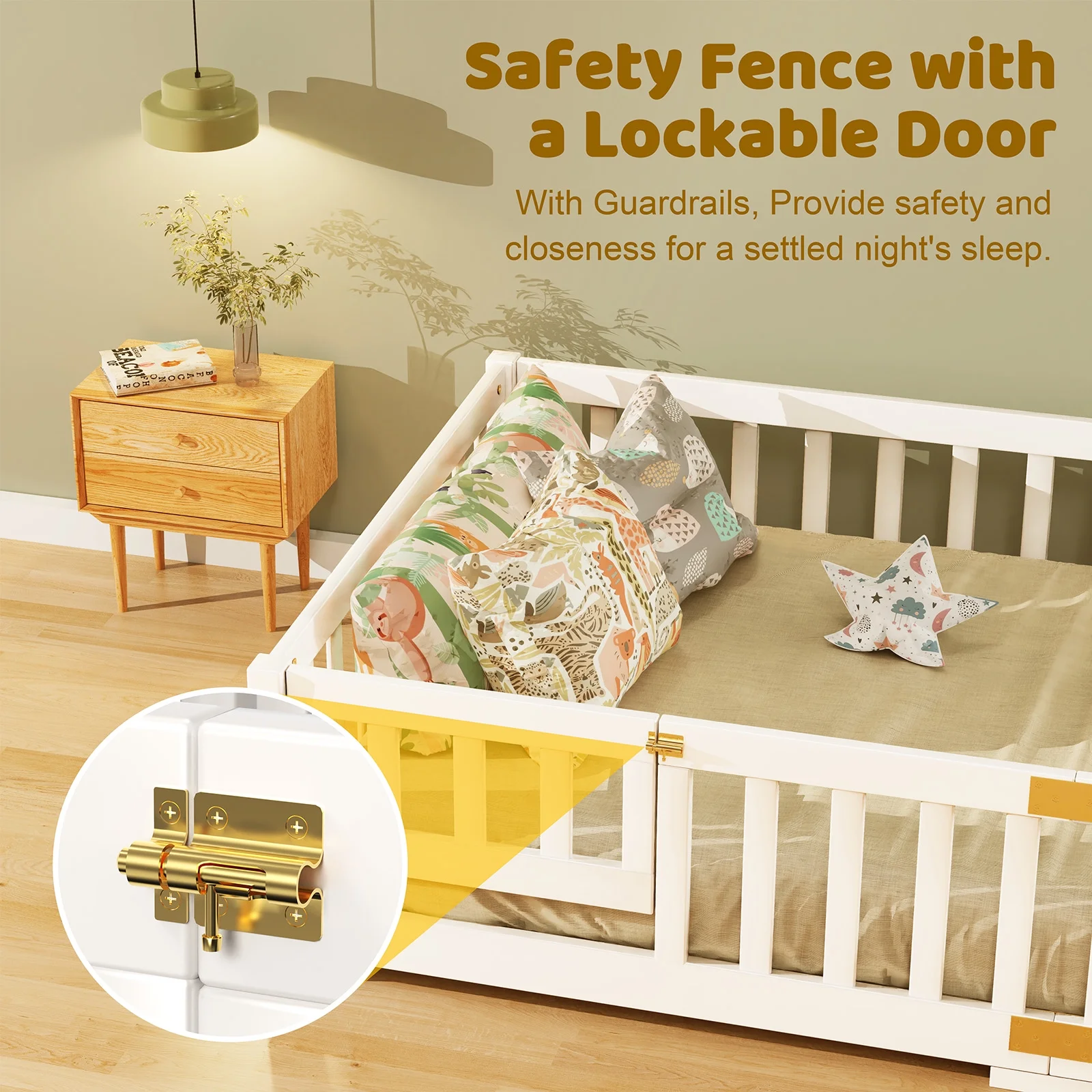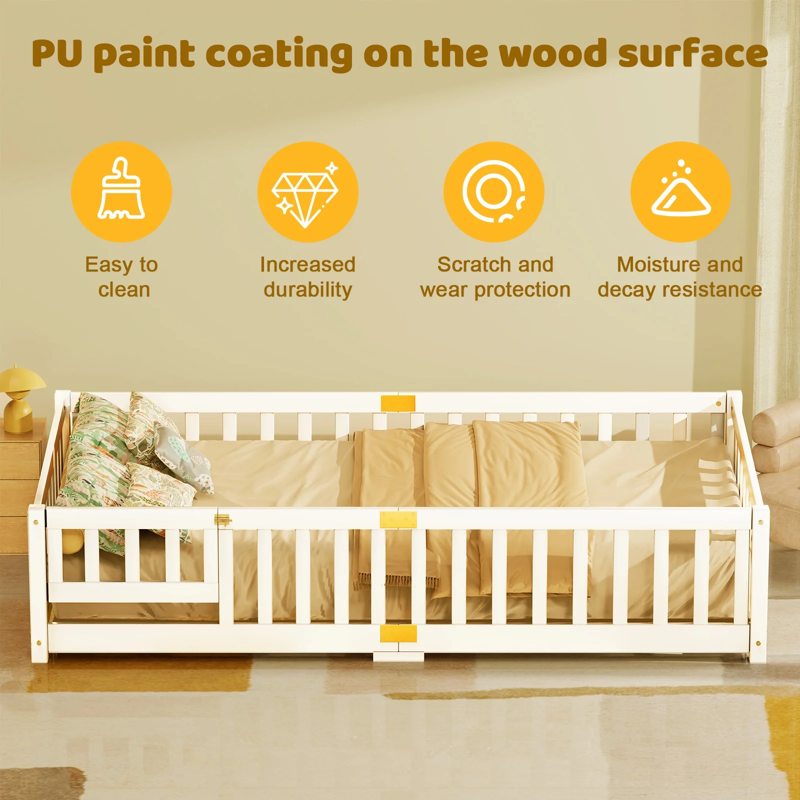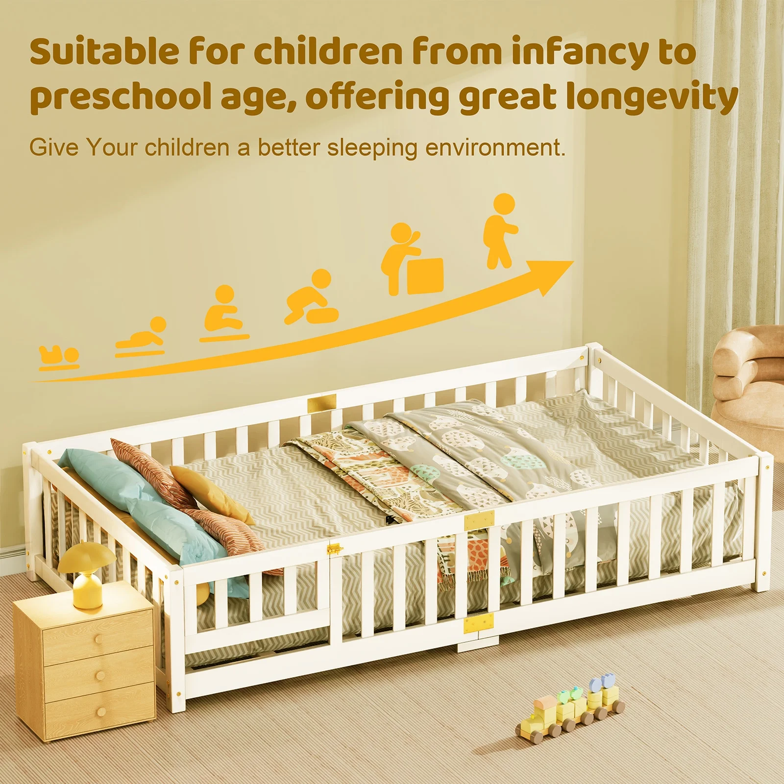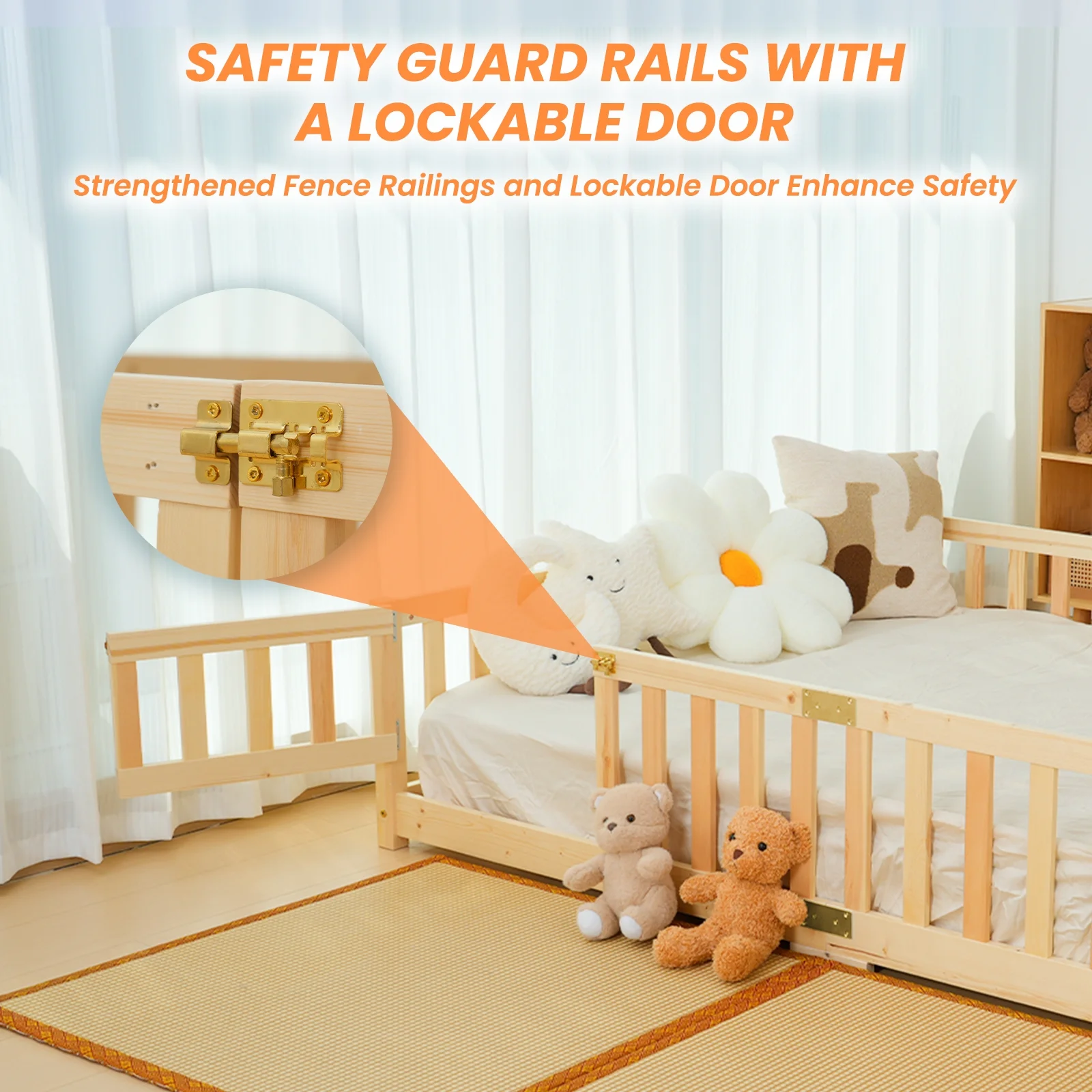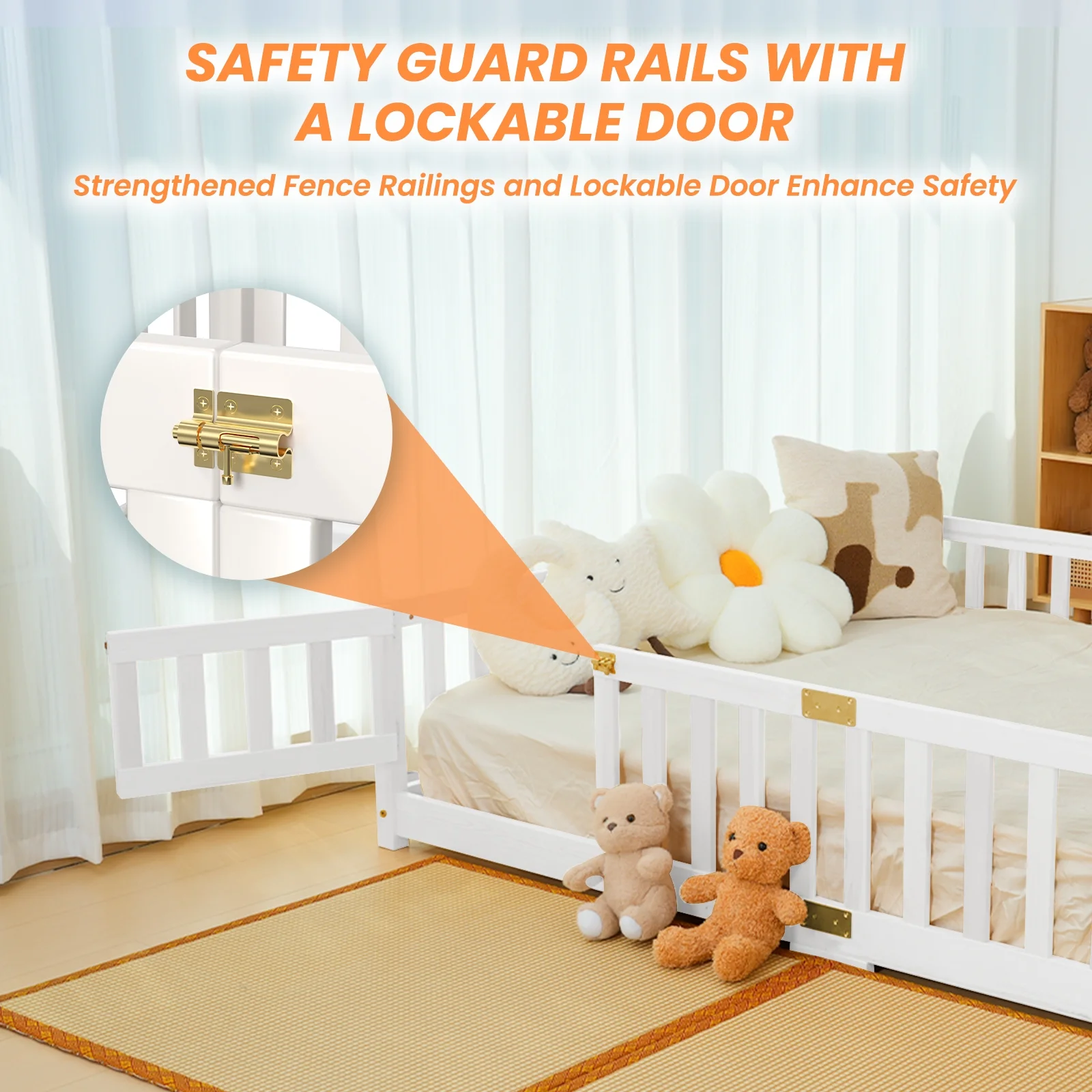【Montessori-Inspired Bed with Fence & Lockable Door�?/b>The 17.5-inch guardrail ensures your child’s safety, while the built-in lockable door (with 2 hinges and a steel latch) adds a fun, interactive element. Kids can easily get in and out of the bed, making bedtime more enjoyable.