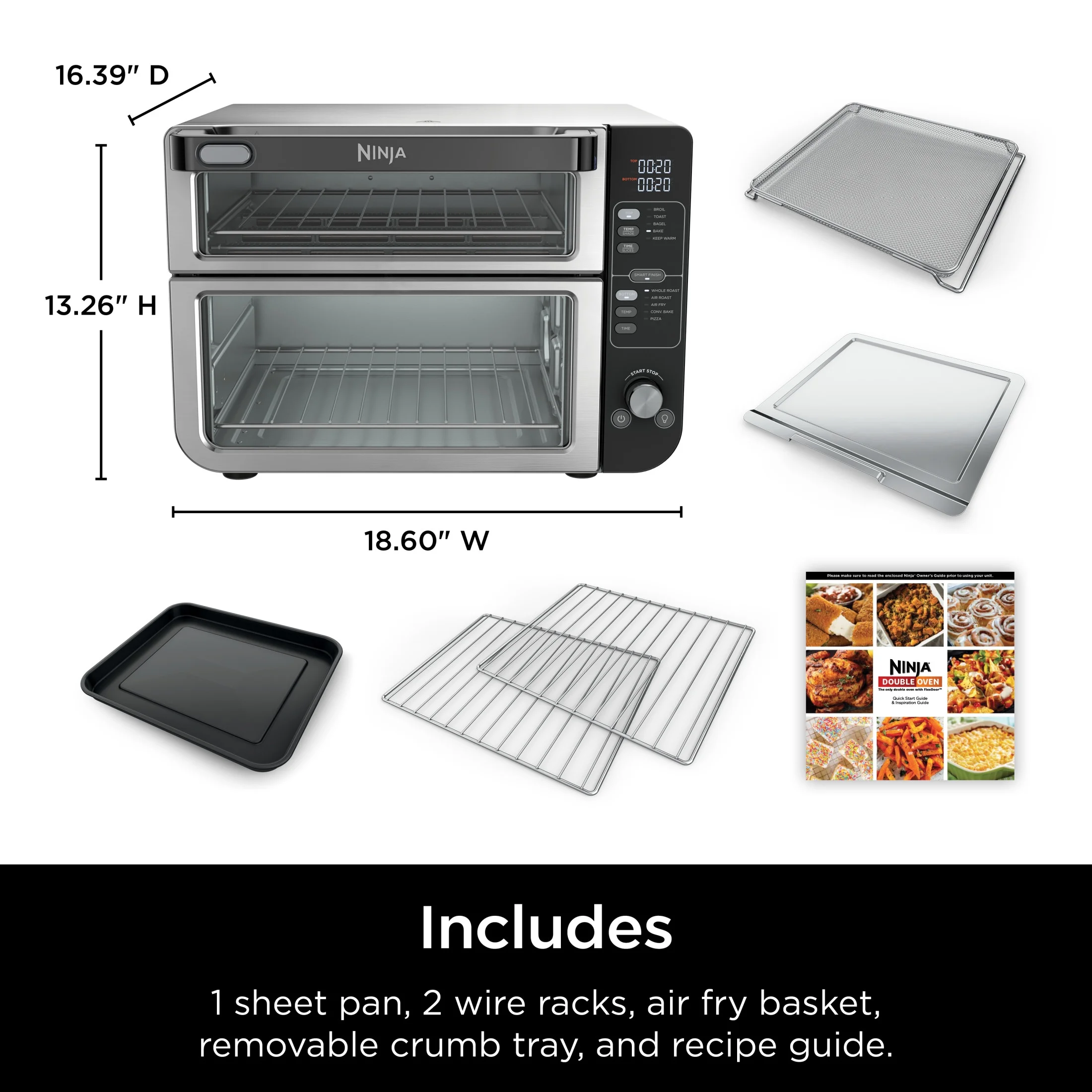 - WHAT'S INCLUDED: Countertop oven, 1 sheet pan, 2 wire racks, air fry basket, removable crumb tray, and chef-created recipe book with 15 recipes and cooking charts.