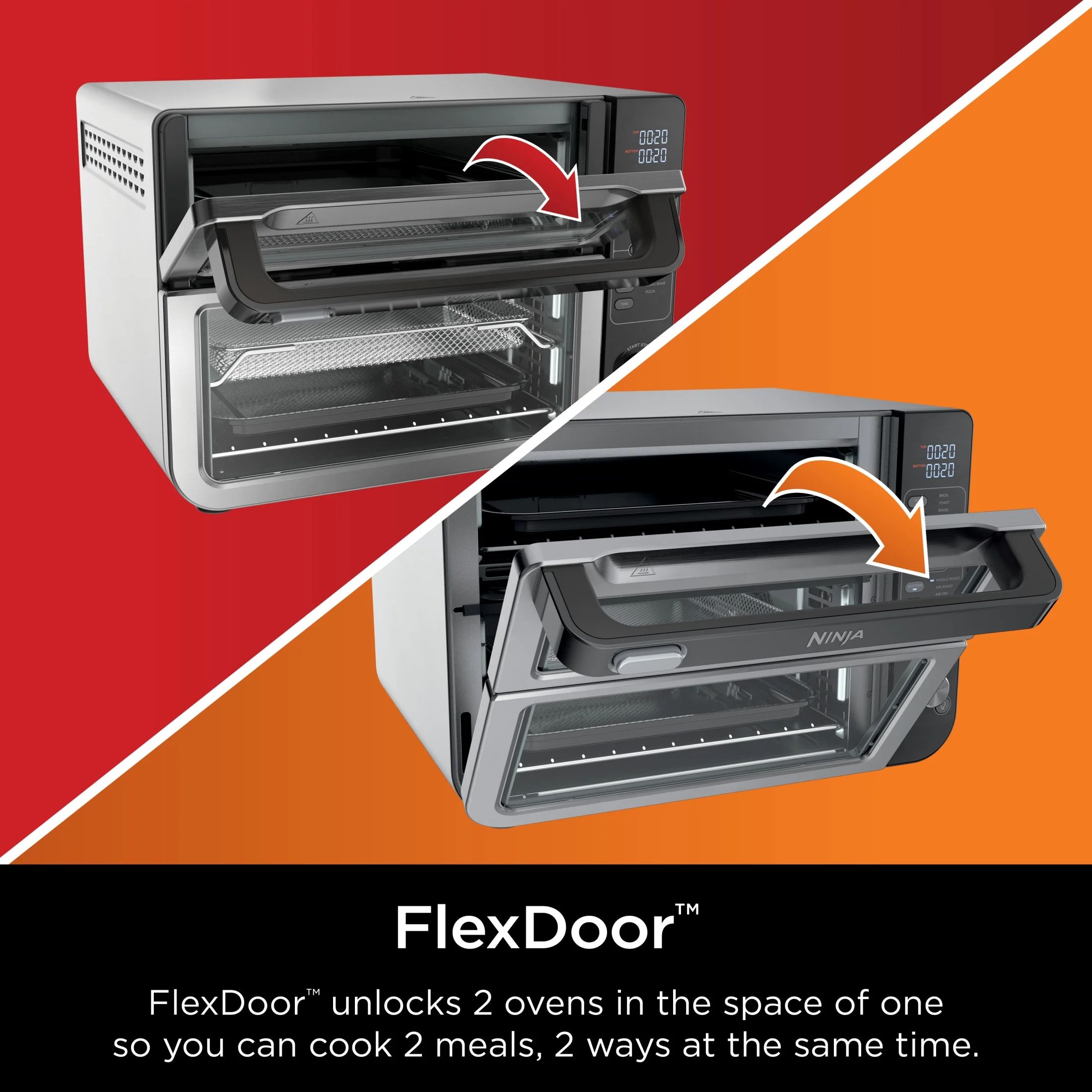 - FLEXDOOR: Creates two separate ovens. Access just the top for quick meals and snacks, or open the full door so you can cook 2 meals, 2 ways on the top and bottom.
