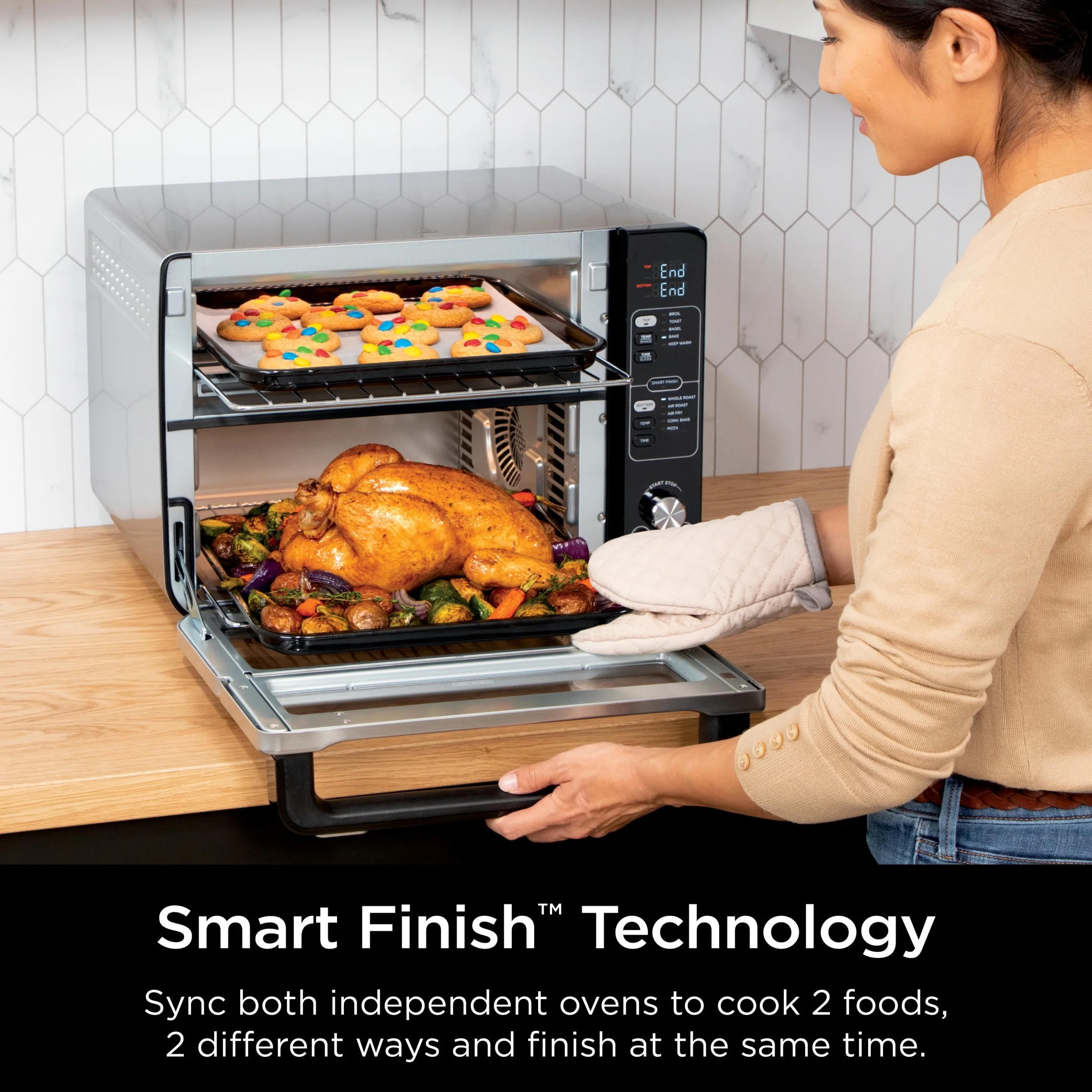 - SMART FINISH TECHNOLOGY: Sync both independent ovens to cook 2 meals, 2 different ways that finish at the same time.