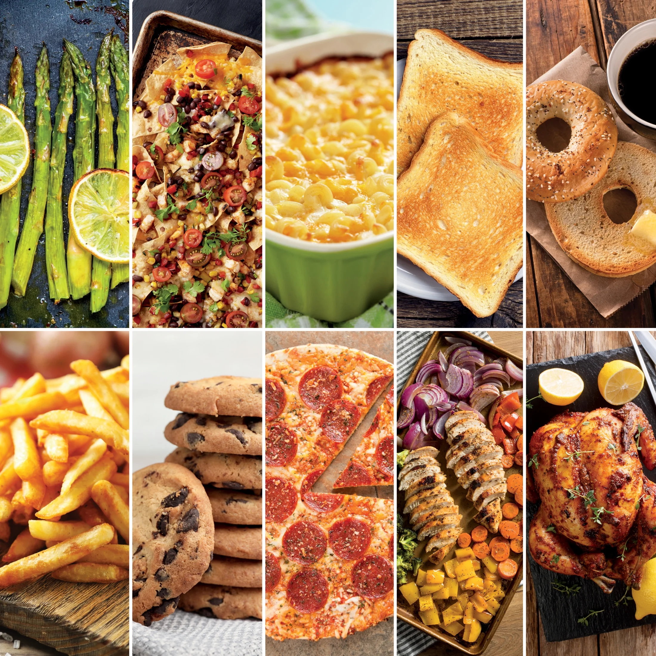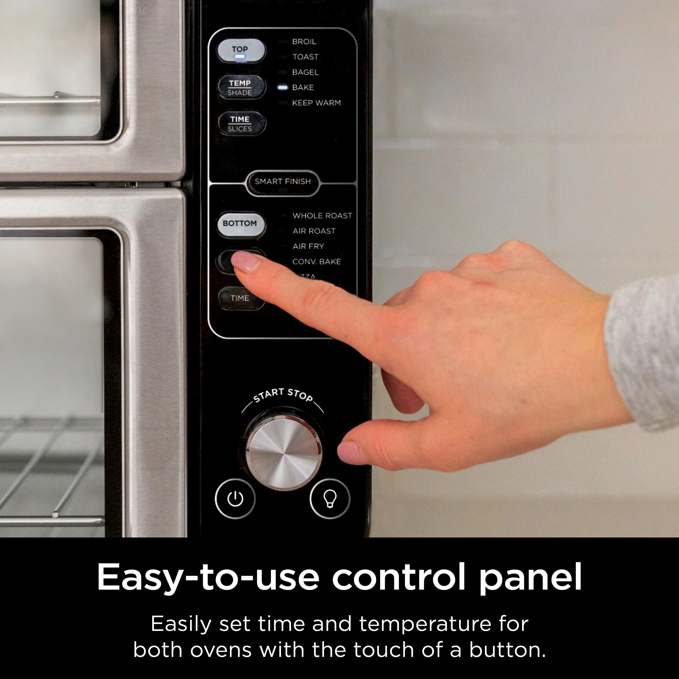 - 10 COOKING FUNCTIONS: Bake, broil, keep warm, bagel, and toast in the Top Rapid Oven. Air fry, convection bake, pizza, air roast, and whole roast in the Bottom Convection & Air Fry Oven.