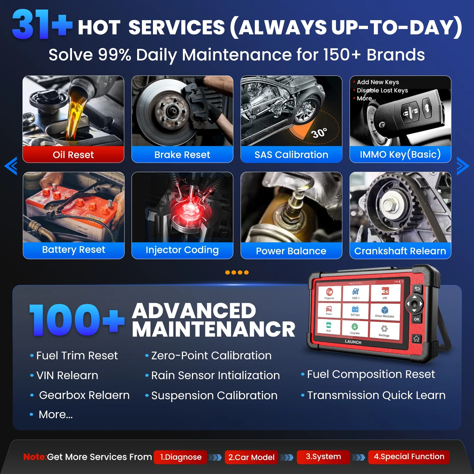 Widely integrate adaptation, calibration, initialization, relearn and matching to meet your need in the most degree. Along with all the common maintenance functions, it also comes with advanced special functions including Cam/Crank Sensors Relearn, Idle Relearn, Zero-Point Calibration, Fuel Trim Reset, Power Balance, etc. (Get More 100+ Repair Function for Specific Models from "1.Diagnose" > "2.Car Model" > "3.System" > 4."Special Funciton".) - OE-level Full Systems Diagnosis