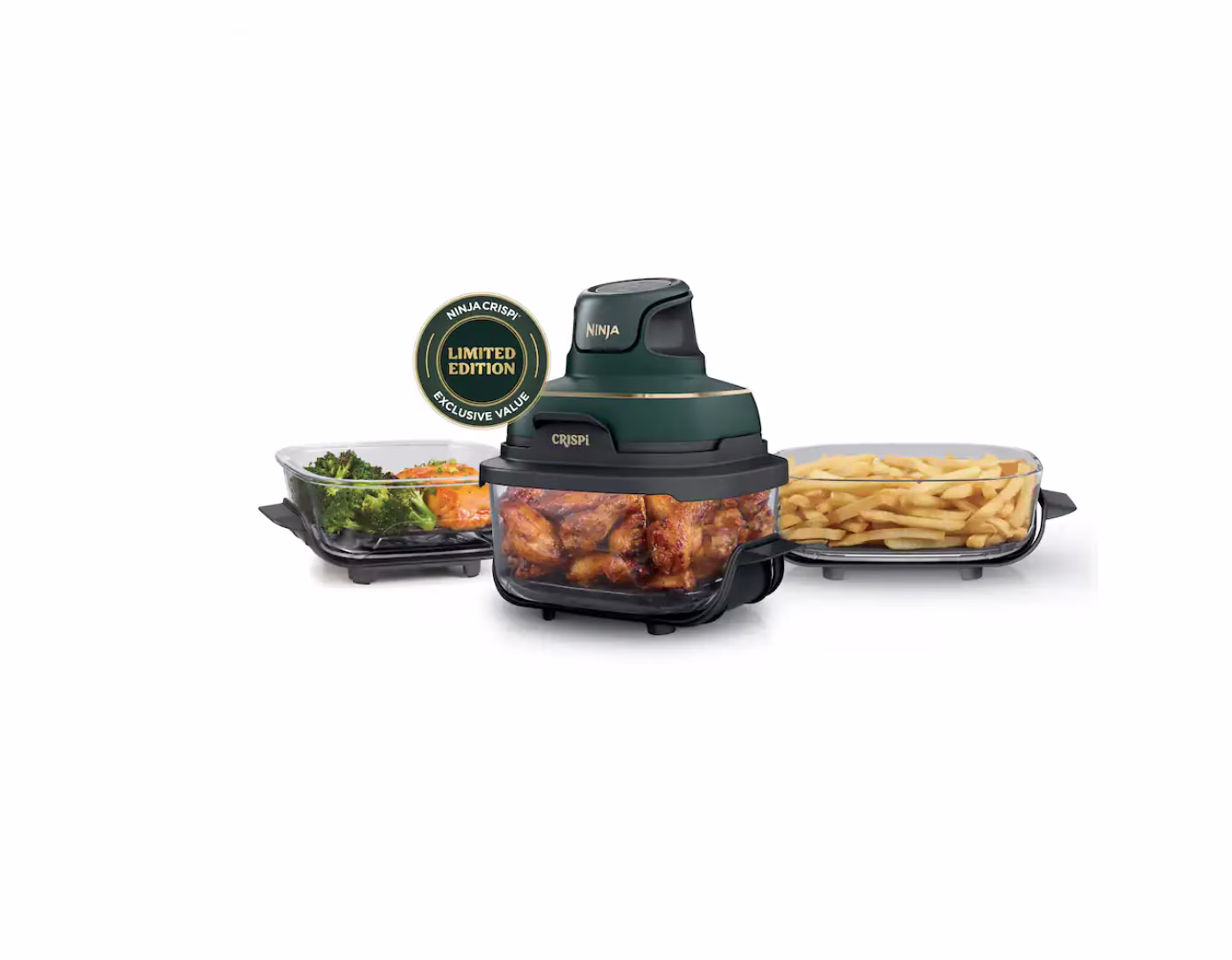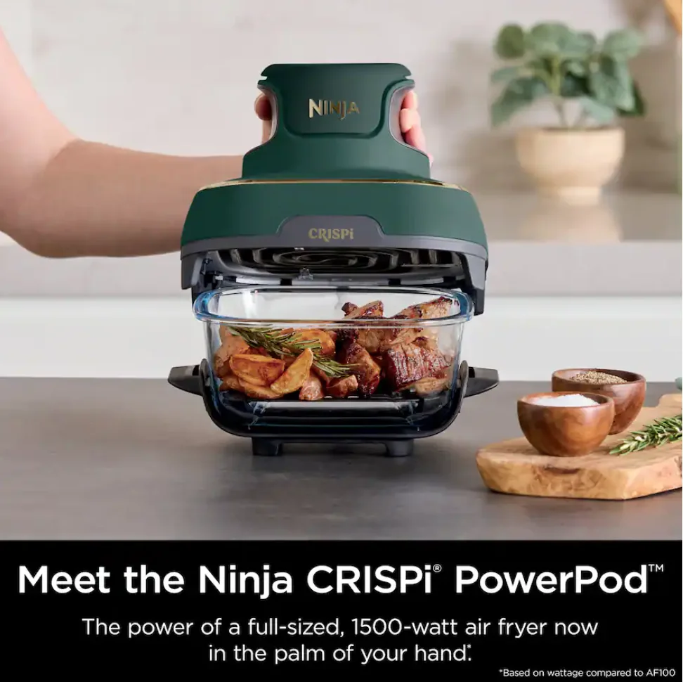 - 5-in-1 multifunction system: Air Fry, Bake, Recrisp, Max Crisp, and Keep Warm modes Portable all-glass design with fixed heat-safe base for countertop cooking anywhere Three glass containers with leak-proof lids (6-cup, 4-qt, 2.5-qt) for cooking, storage, and travel PowerPod�?cover ensures even heat distribution and compact storage High-performance 1500 W heating up to 450 °F for crispy results with less oil Dishwasher-safe parts for effortless cleanup Premium British Racing Green with Soft Gold Trim finish adds a modern, elegant look Quiet, efficient operation ideal for apartments, dorms, or offices Fast & Free U.S. Shipping from New Jersey �?ships same or next business day