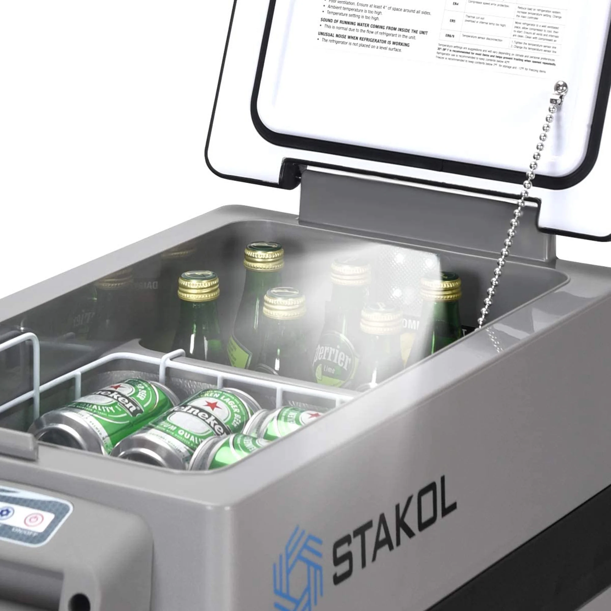 Our portable refrigerator is your best choice for chilling drinks and storing foods in the open air. 11 gallon ( 42L ) large capacity is more than enough to accommodate all your stuff including snacks, fruits, beer, soda and etc, while the basket inside will help you to sort it out as well as saving your storage space. The compact size along with 35lbs light weight also makes it much more easier to carry. Moreover, the high efficiency offers you a more flexible choice from -4 °F to 50 °F, and the LED display with digitalized adjustment makes it easy to chose your favorite temperature and mode. Equipped with battery protection and shockproof design, the cooler is very safe to use. It's perfect for camping, picnic, barbecue and etc.
