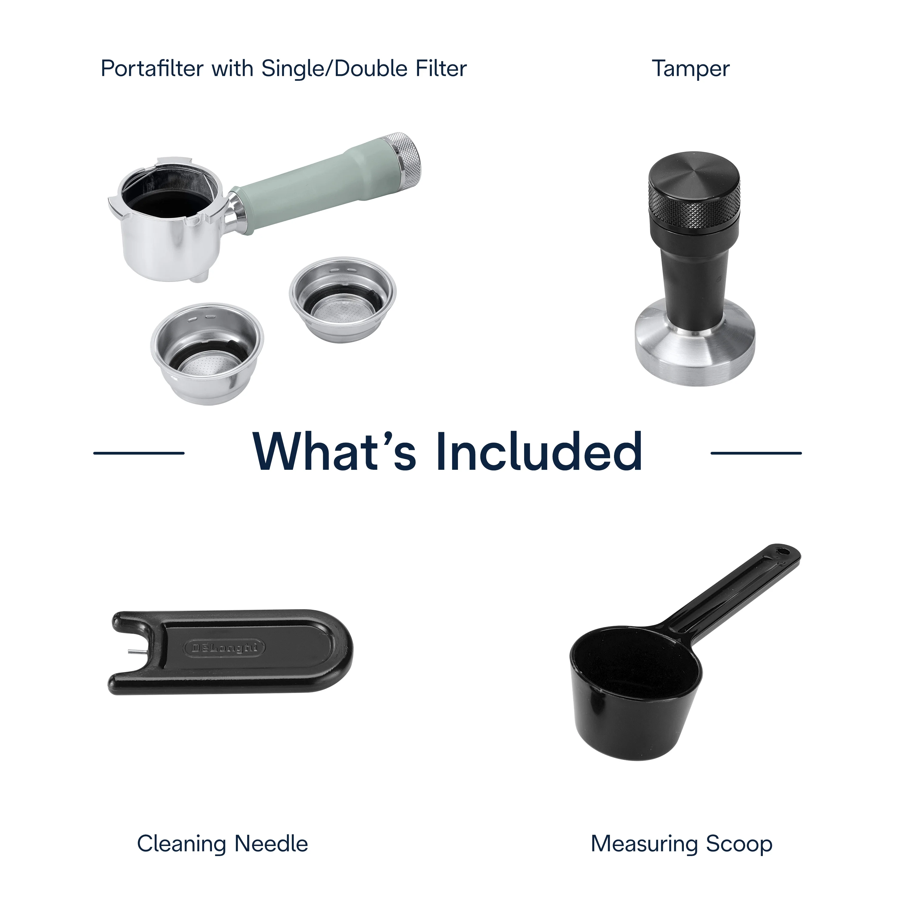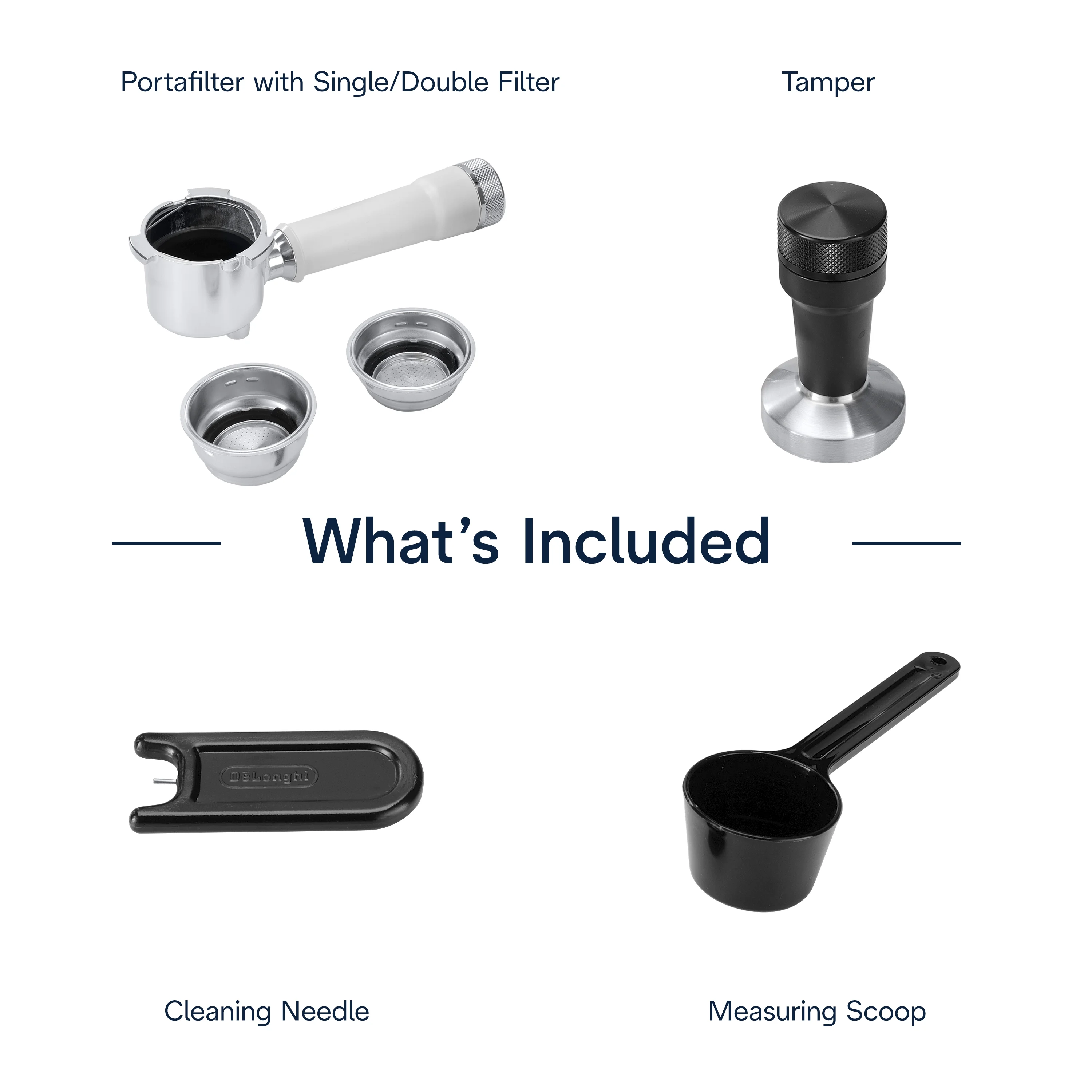- PROFESSIONAL BARISTA KIT INCLUDED Equip your countertop with everything you need to be your own barista: portafilter, professional tamper, measuring scoop and single and double filter baskets included.