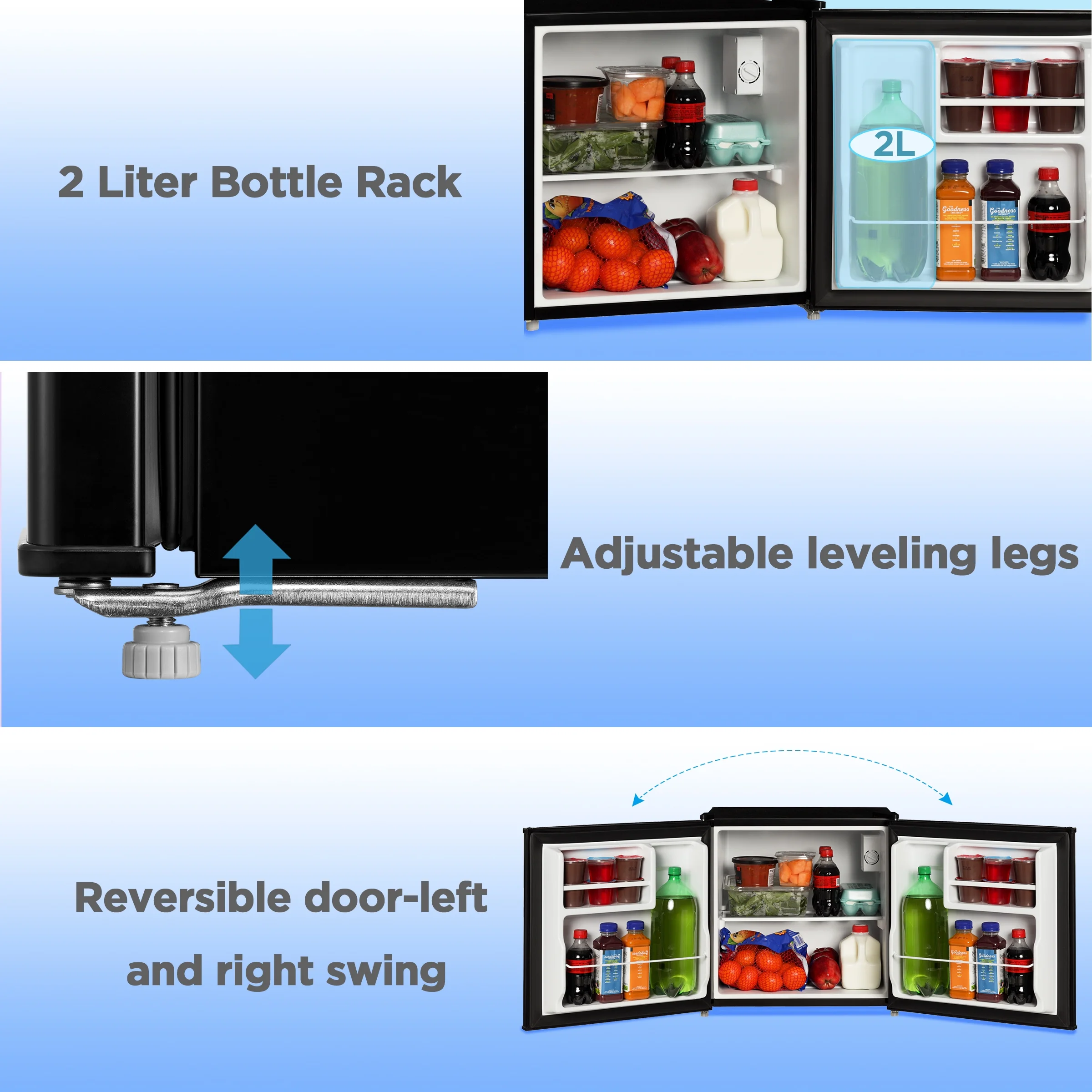 - 2-Liter Bottle Rack: Built-in storage for large bottles and drinks