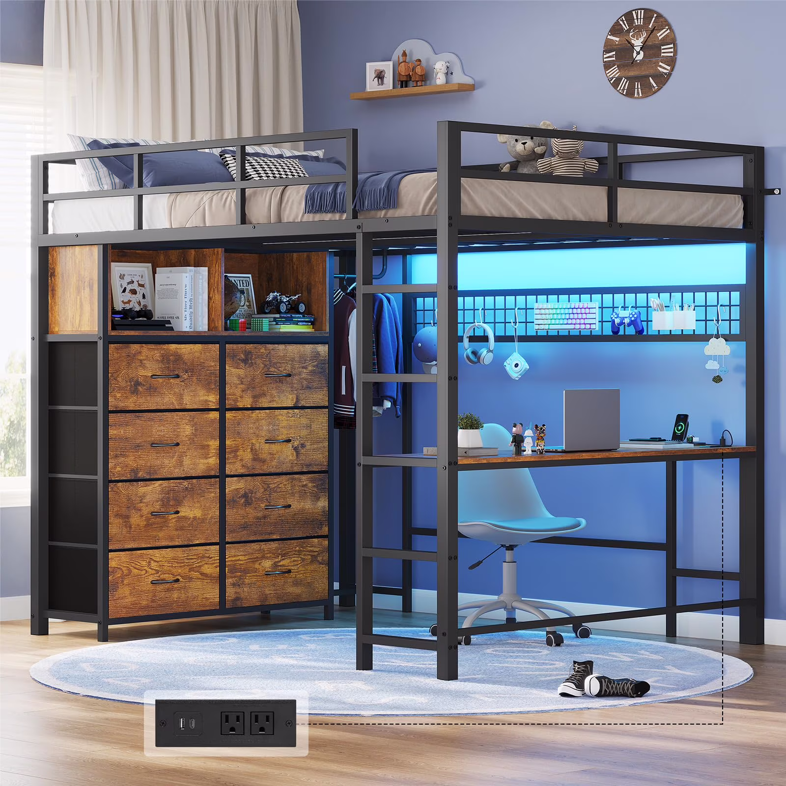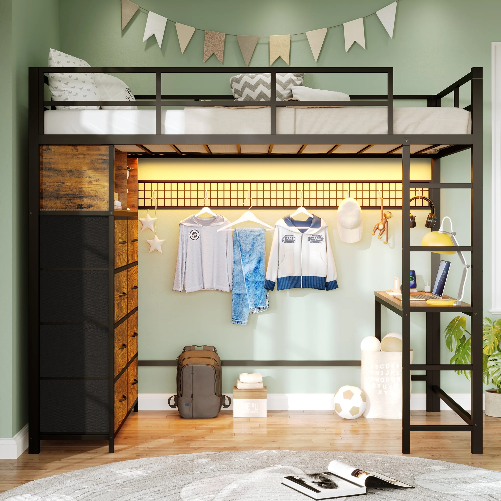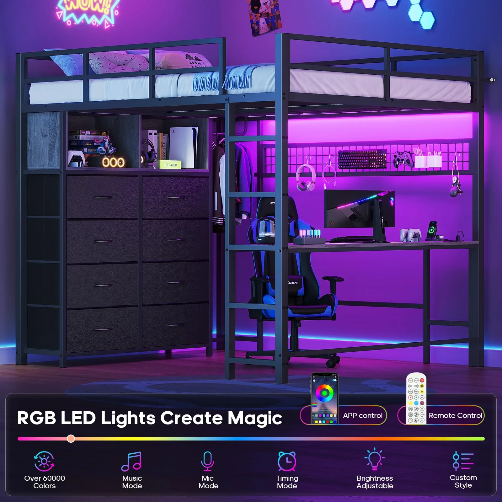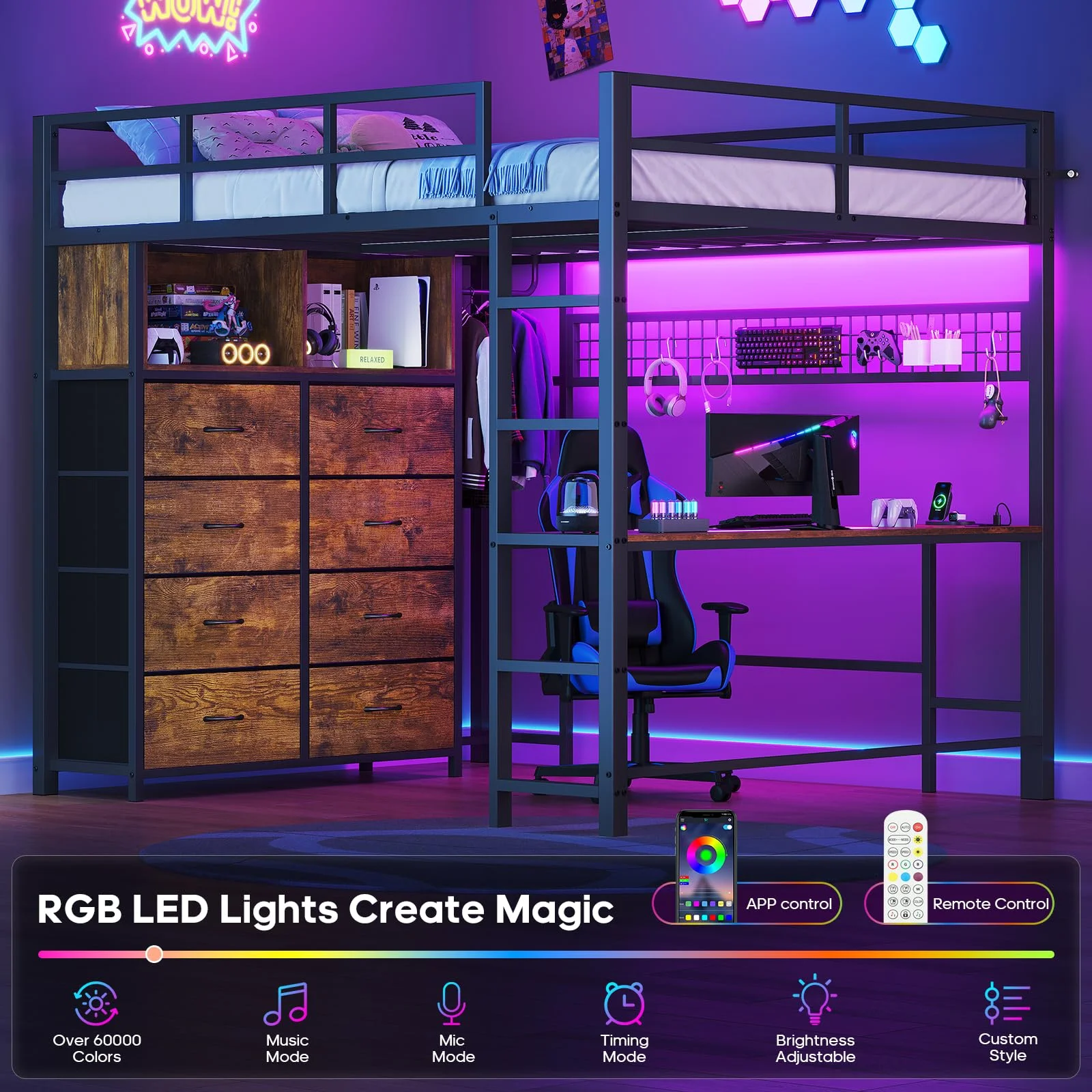 Special Feature�?No Box Spring Needed, With 8 Large Fabric Drawers and 2 Storage Shelves,With Safety Guardrail and Stairs, Loft Bed With Desk,Charging Station and LED Lights