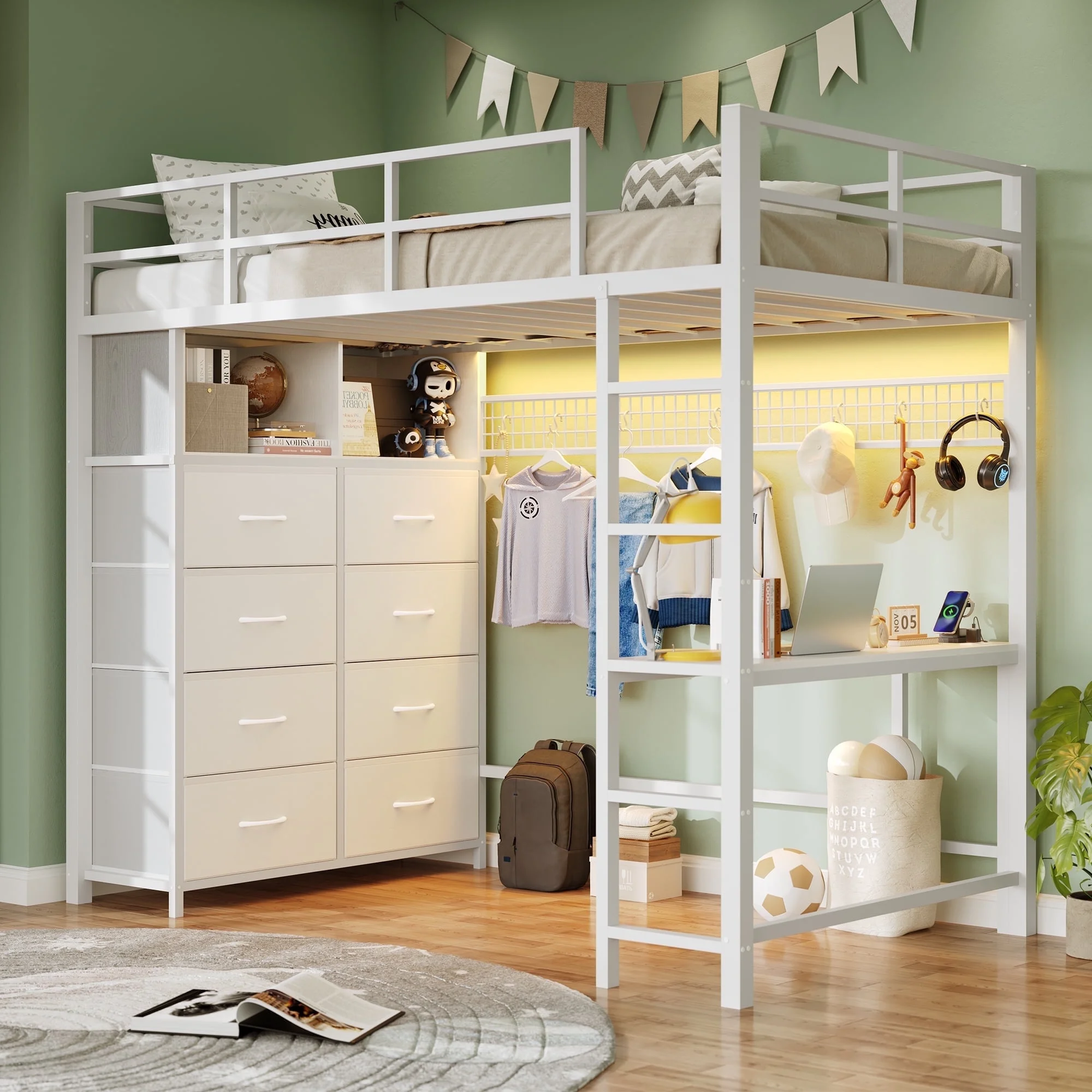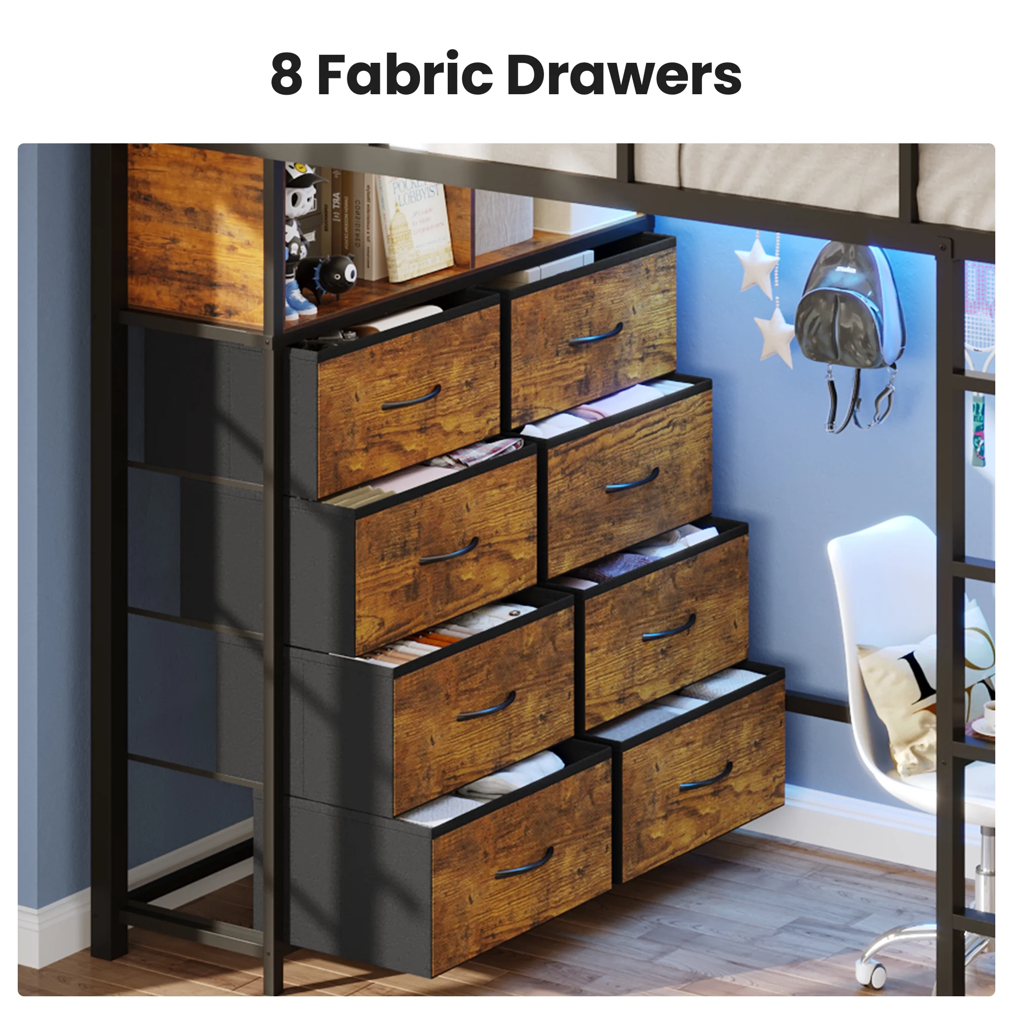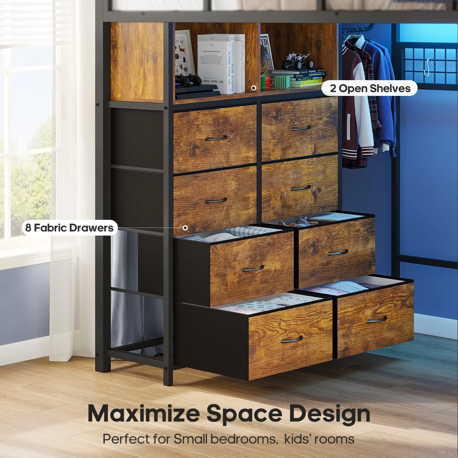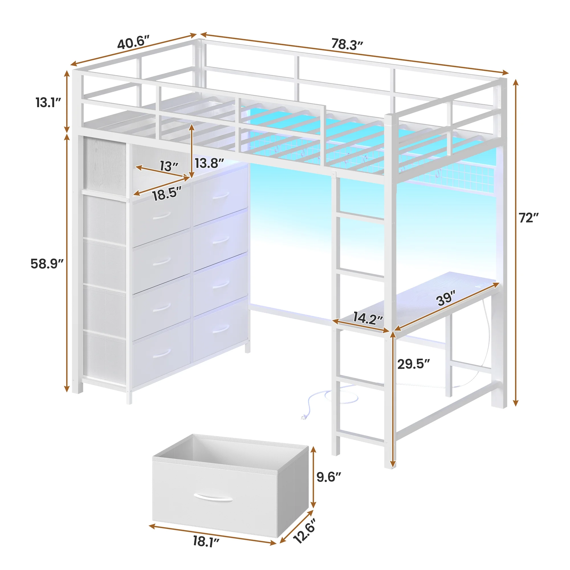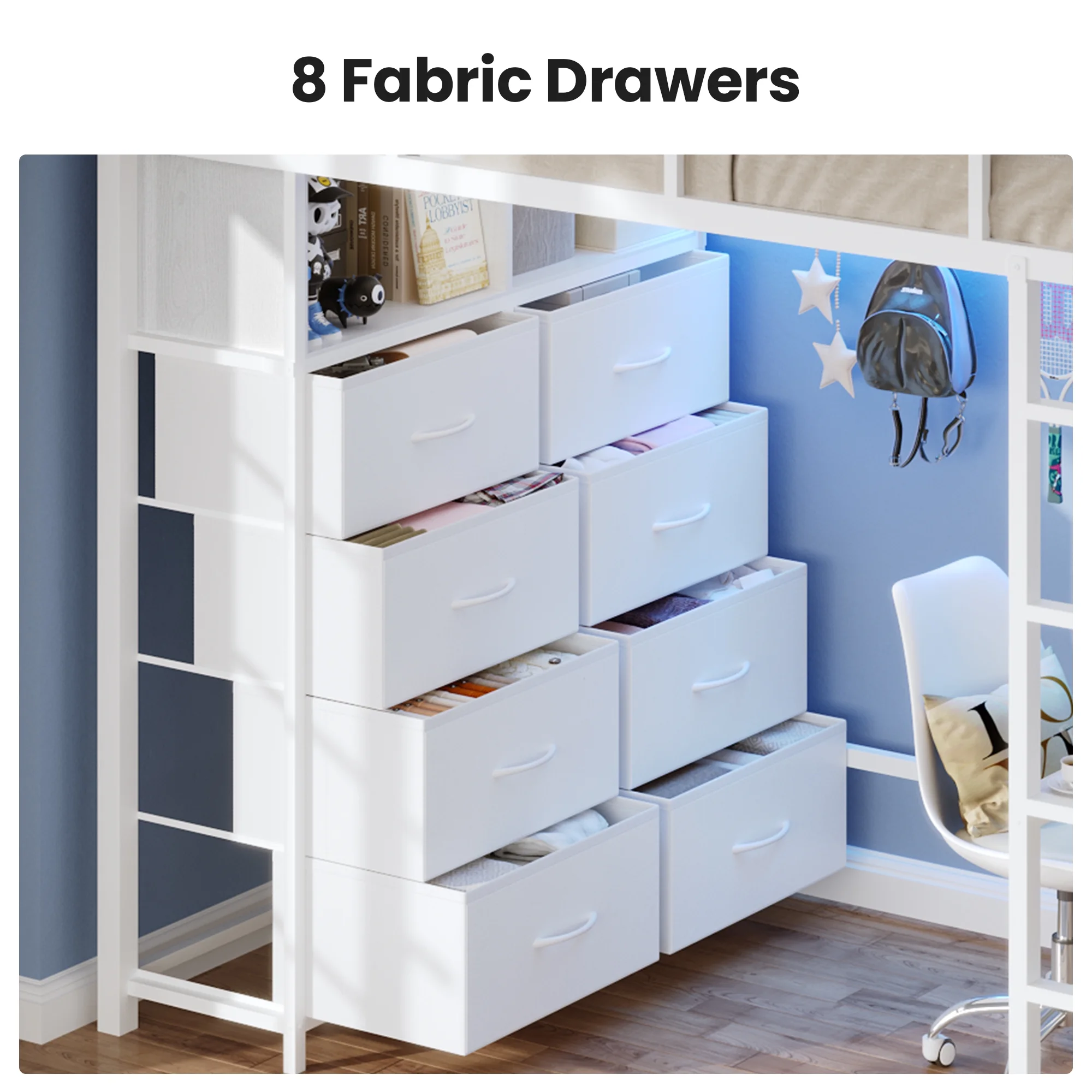 Twin Size Loft Bed with Desk and 8 Storage Drawers, Metal Loft Bed Twin with LED Lights & Charging Station, Storage Shelves, 13.1" H Safety Guard & Ladder, No Box Spring Needed,