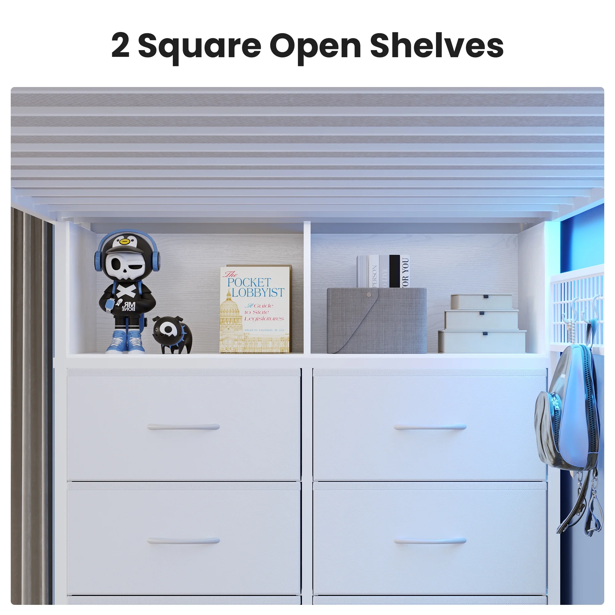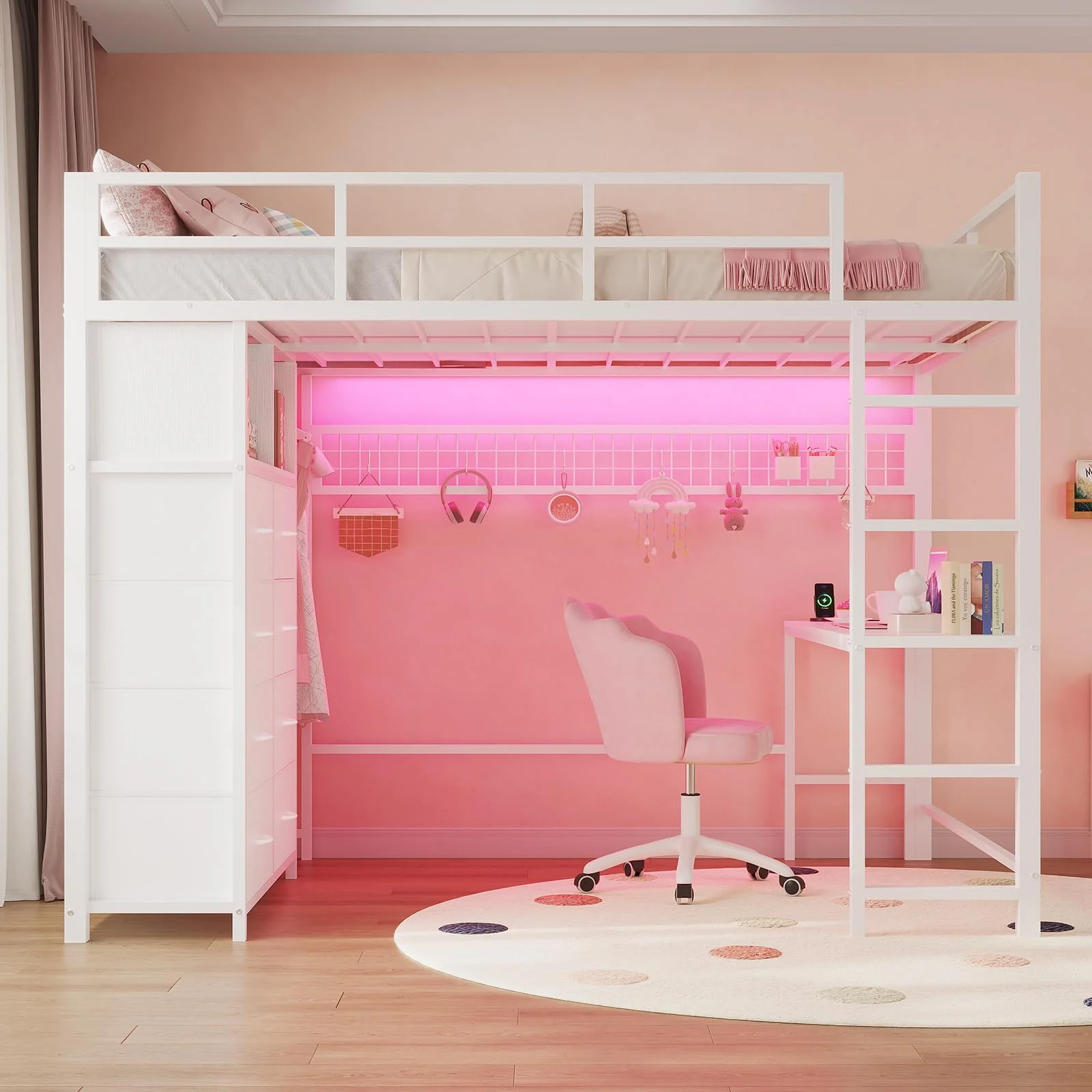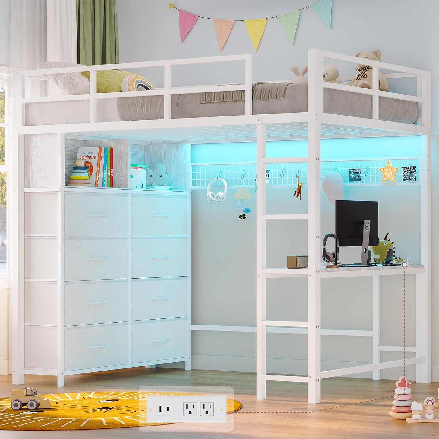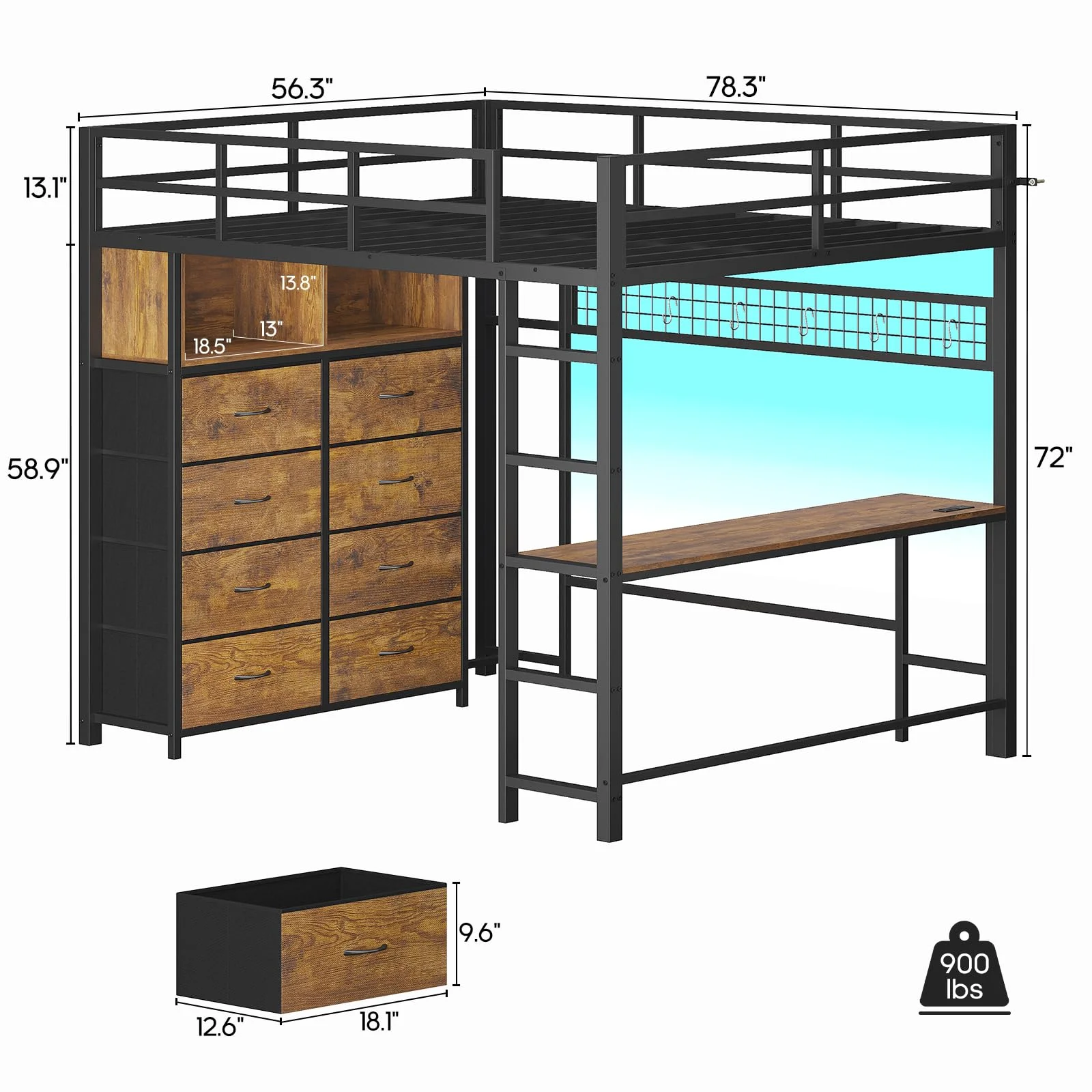 Twin Size Loft Bed with Desk and 8 Storage Drawers, Metal Loft Bed Twin with LED Lights & Charging Station, Storage Shelves, 13.1" H Safety Guard & Ladder, No Box Spring Needed,