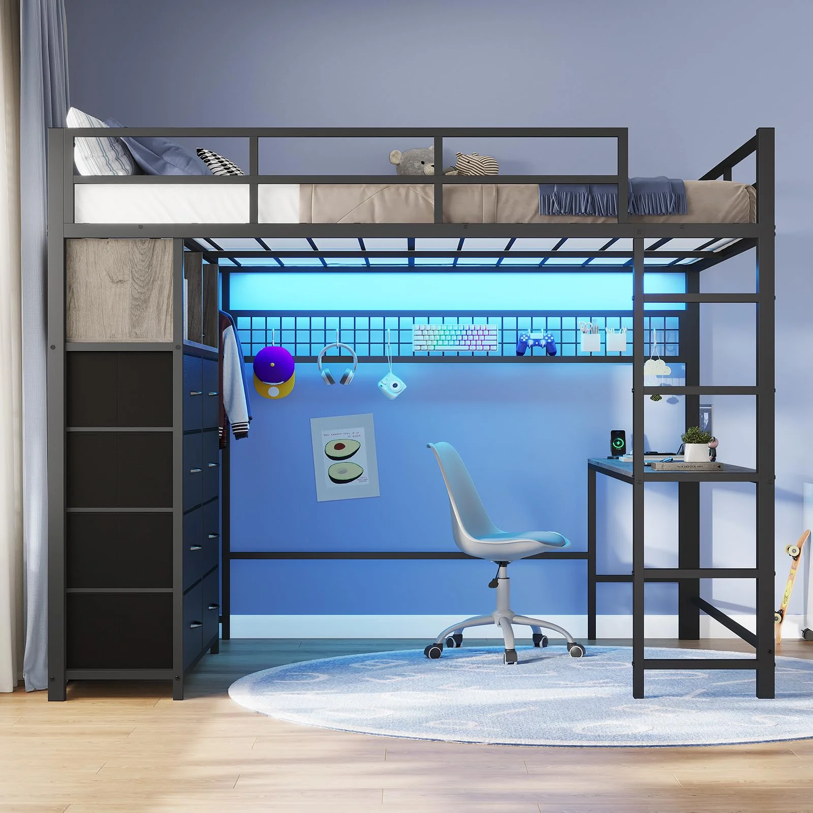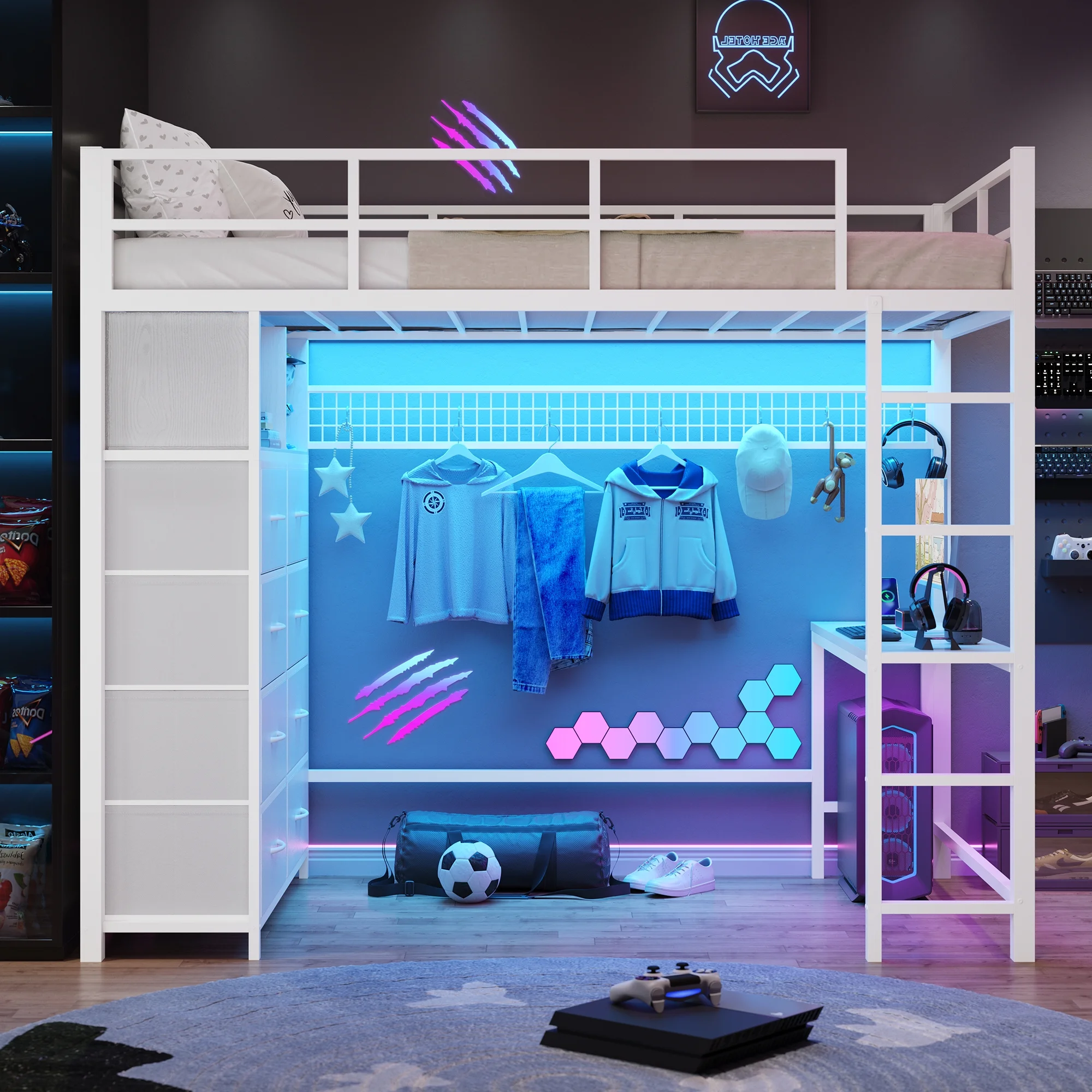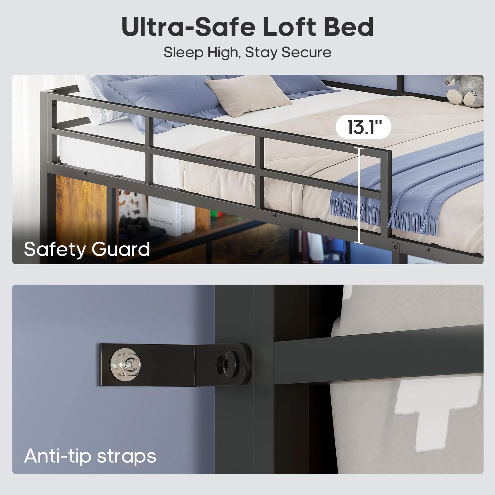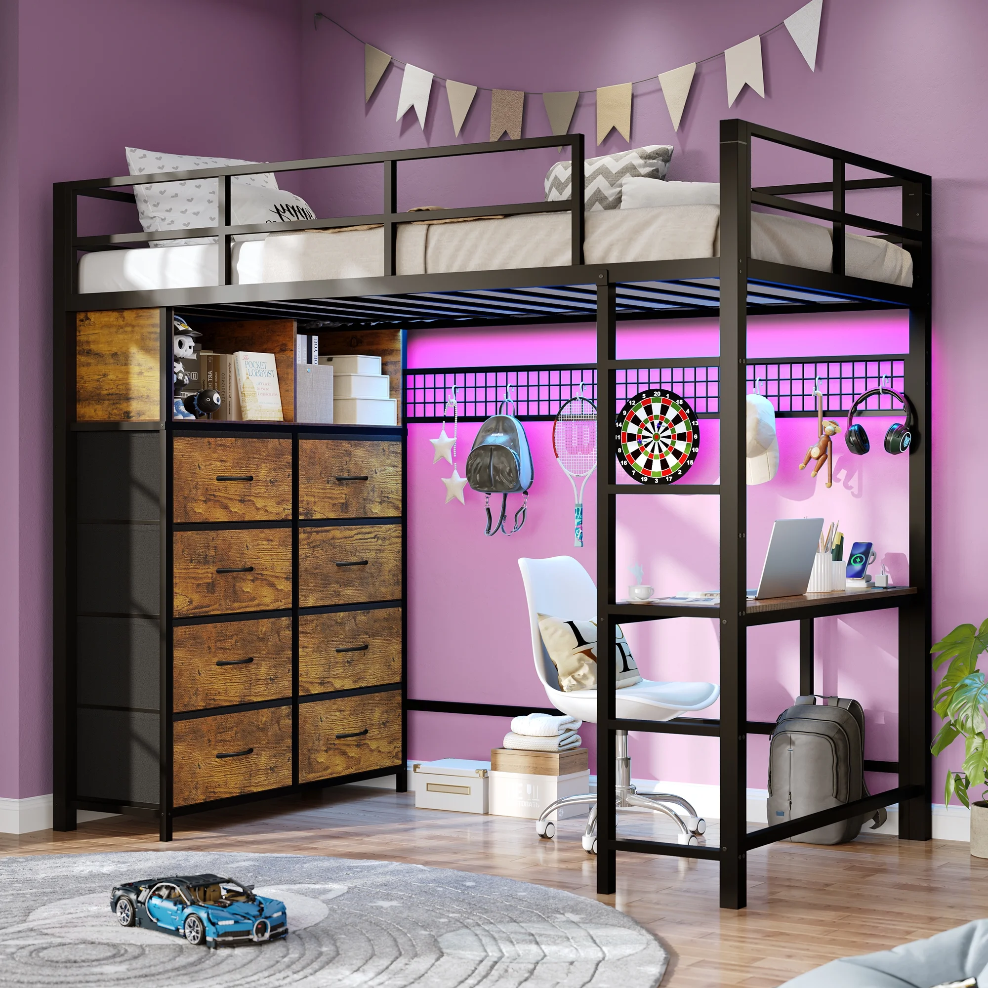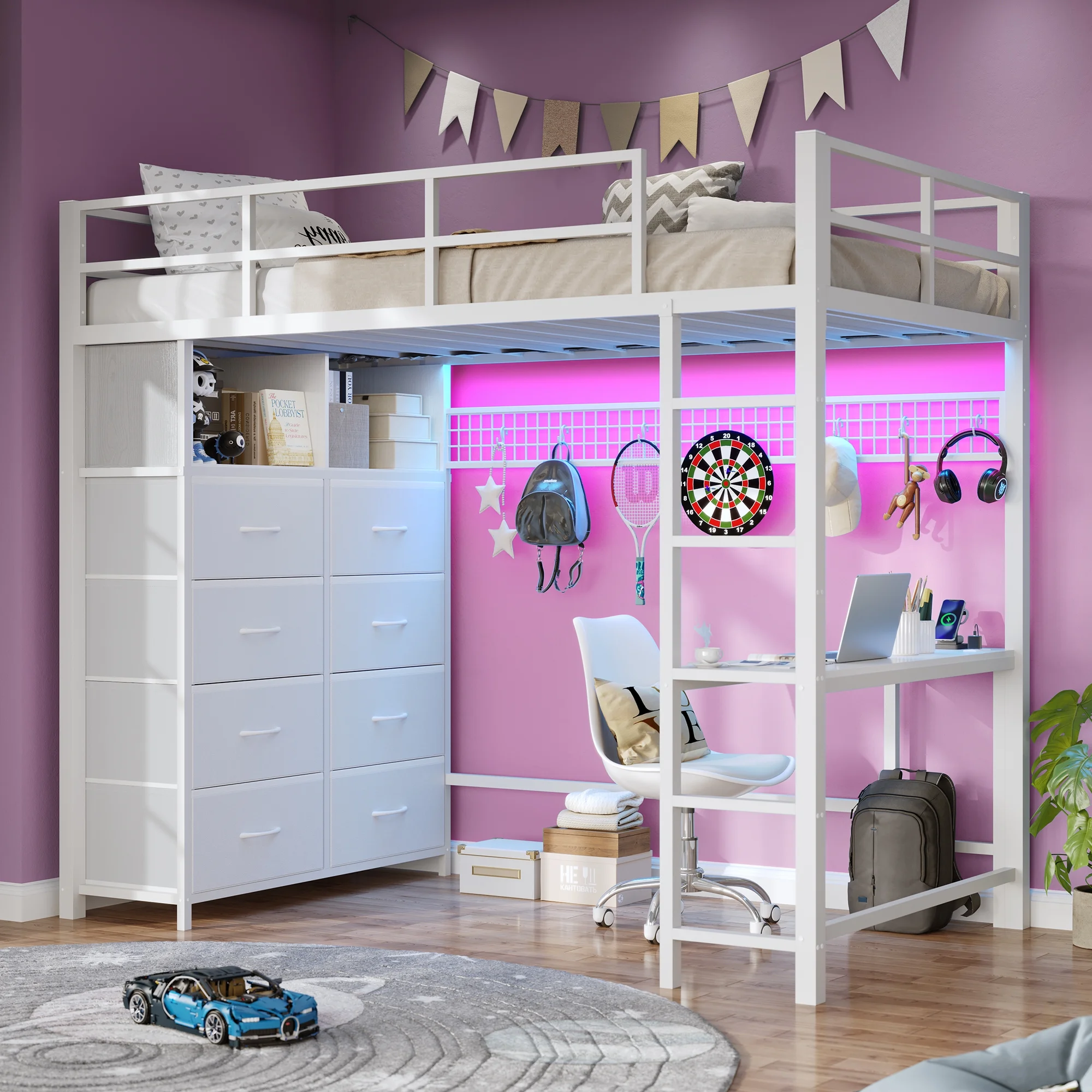 Twin Size Loft Bed with Desk and 8 Storage Drawers, Metal Loft Bed Twin with LED Lights & Charging Station, Storage Shelves, 13.1" H Safety Guard & Ladder, No Box Spring Needed,