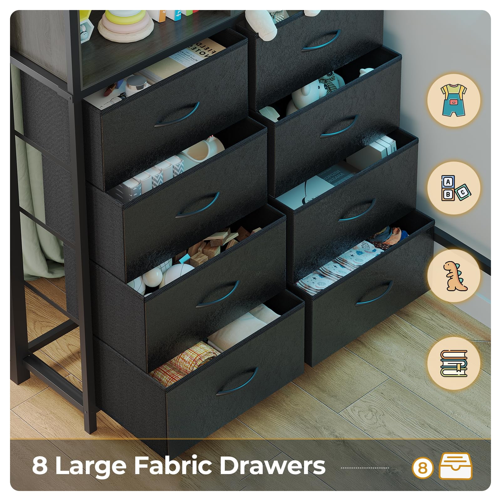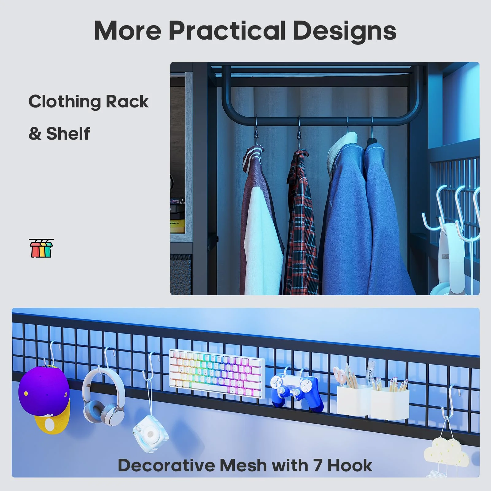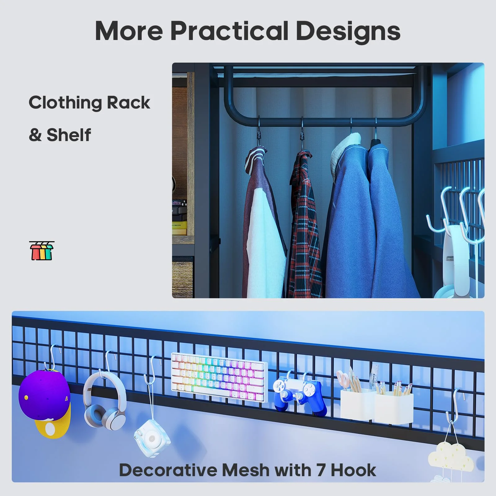 - The double loft bed frame has powerful storage space, with 8 oversized fabric drawers for organizing books, files, clothes, toys and decorations, 2 open storage shelves for quick access to necessities, and 7 S-shaped hooks for easy storage of small items.