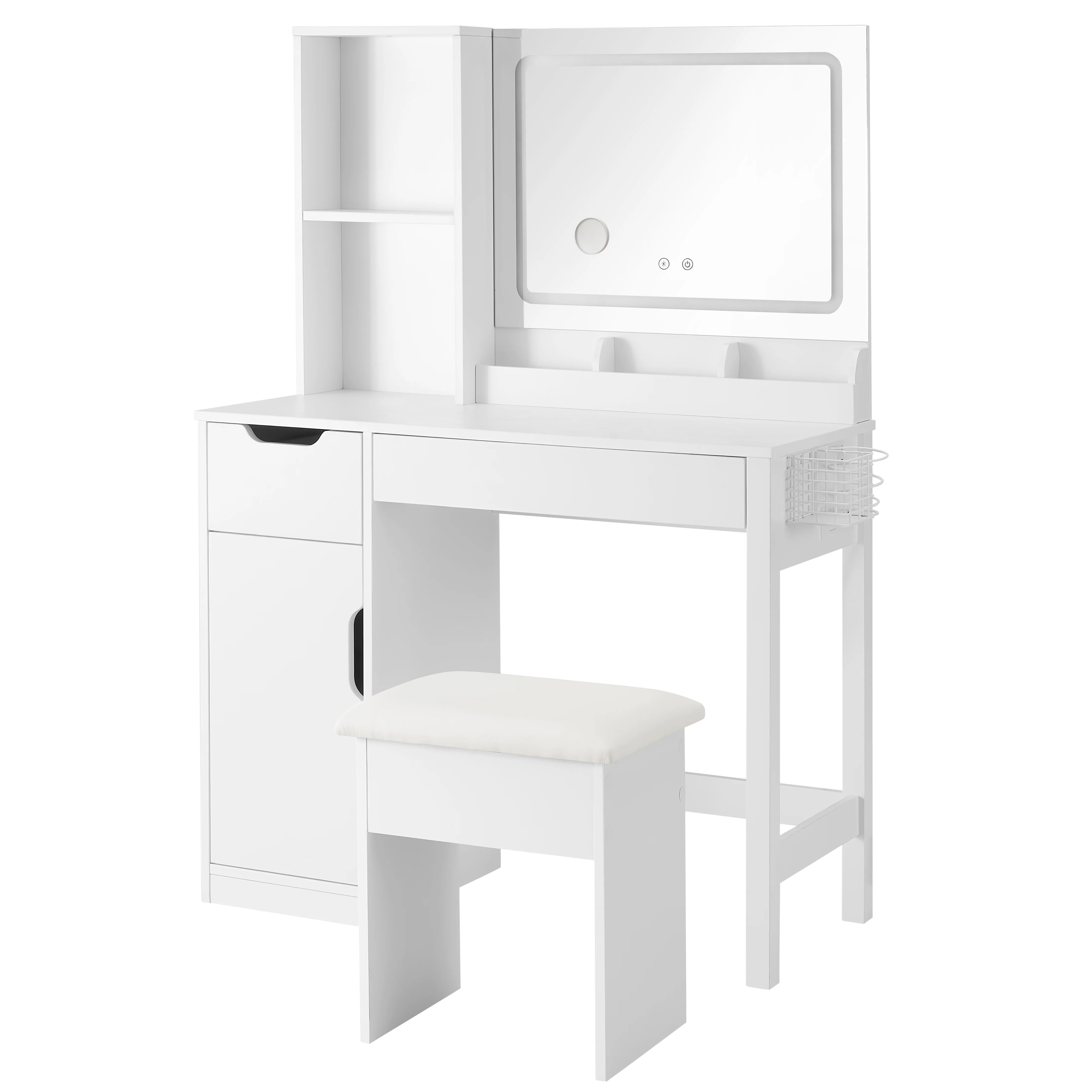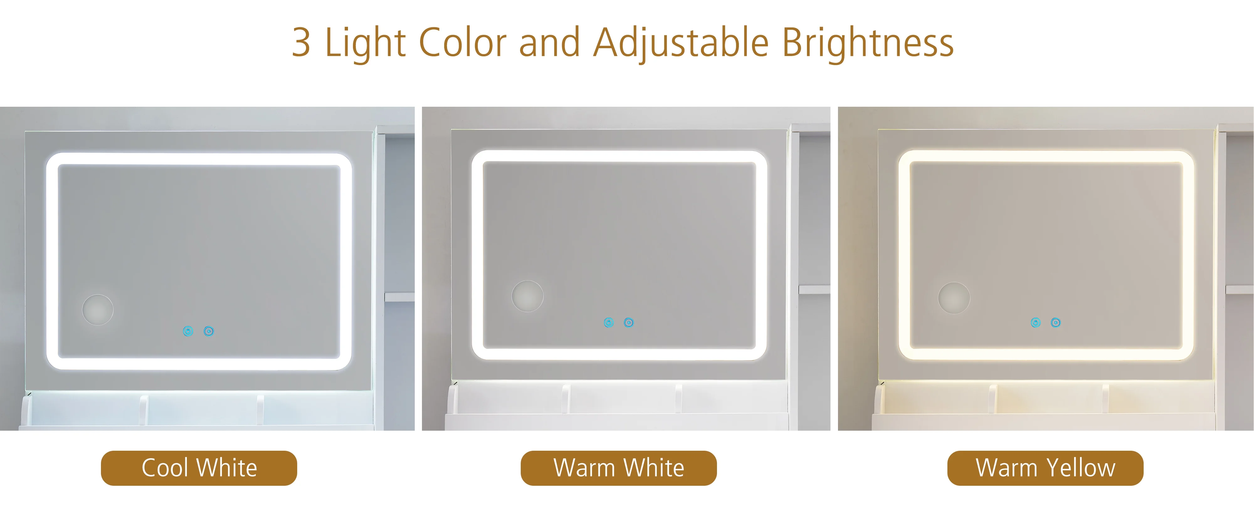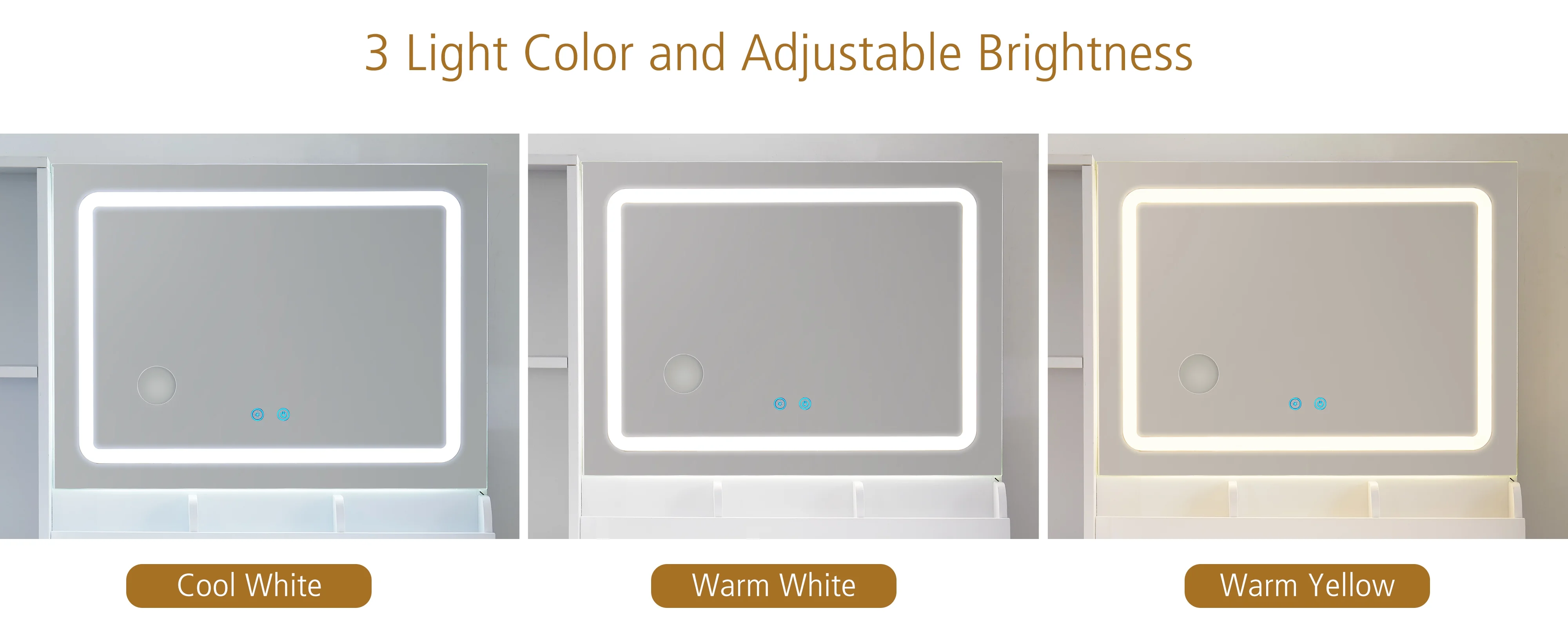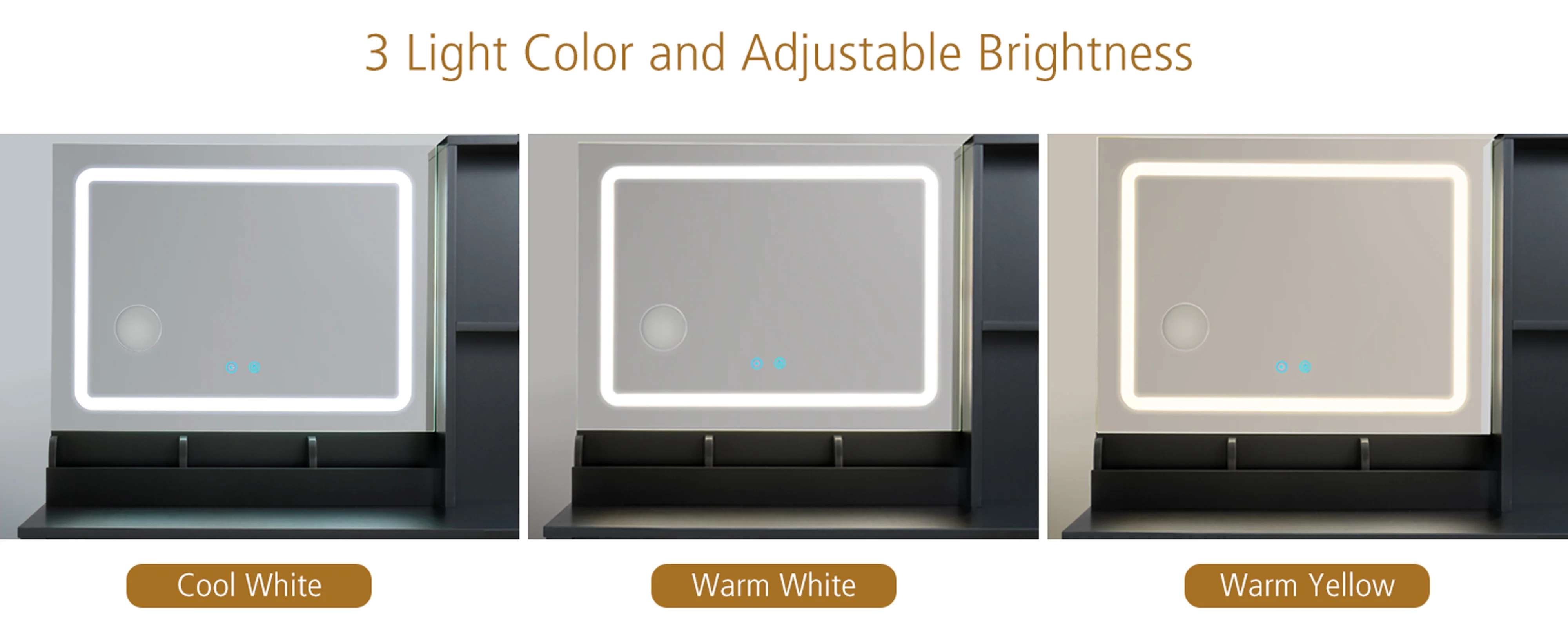 - Vanity with Makeup Mirror & LED Light-with a Large HD mirror providing a wider field of view. LED light with 3 color modes allows you to customize your lighting scheme. & Touch switch, lights can be switched with just a touch. The lightness will be adjustable if you press the button. & You can do your makeup in different angle. It can accurately illuminate skin color and complexion during the day or at night, allowing you to enjoy every detail of makeup.