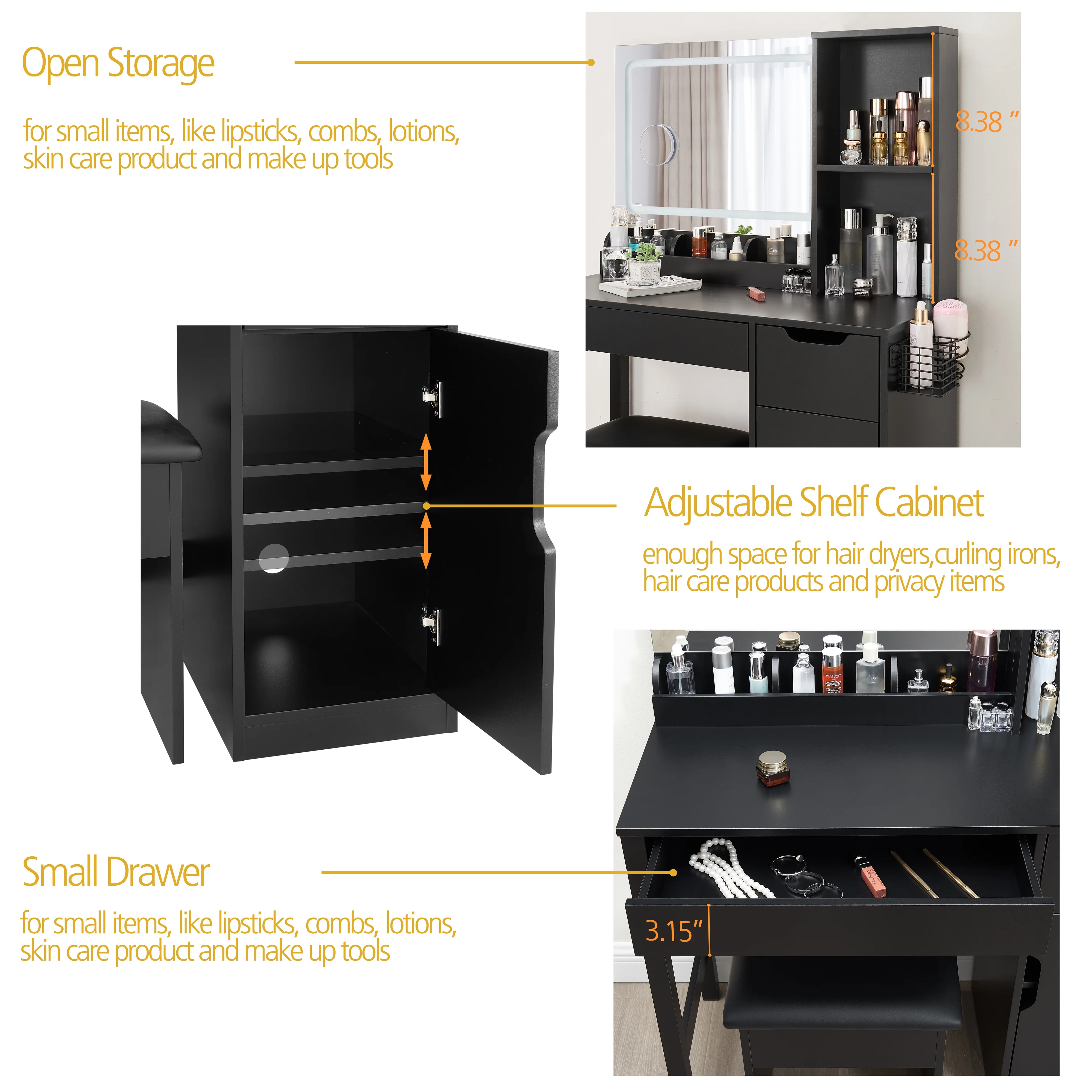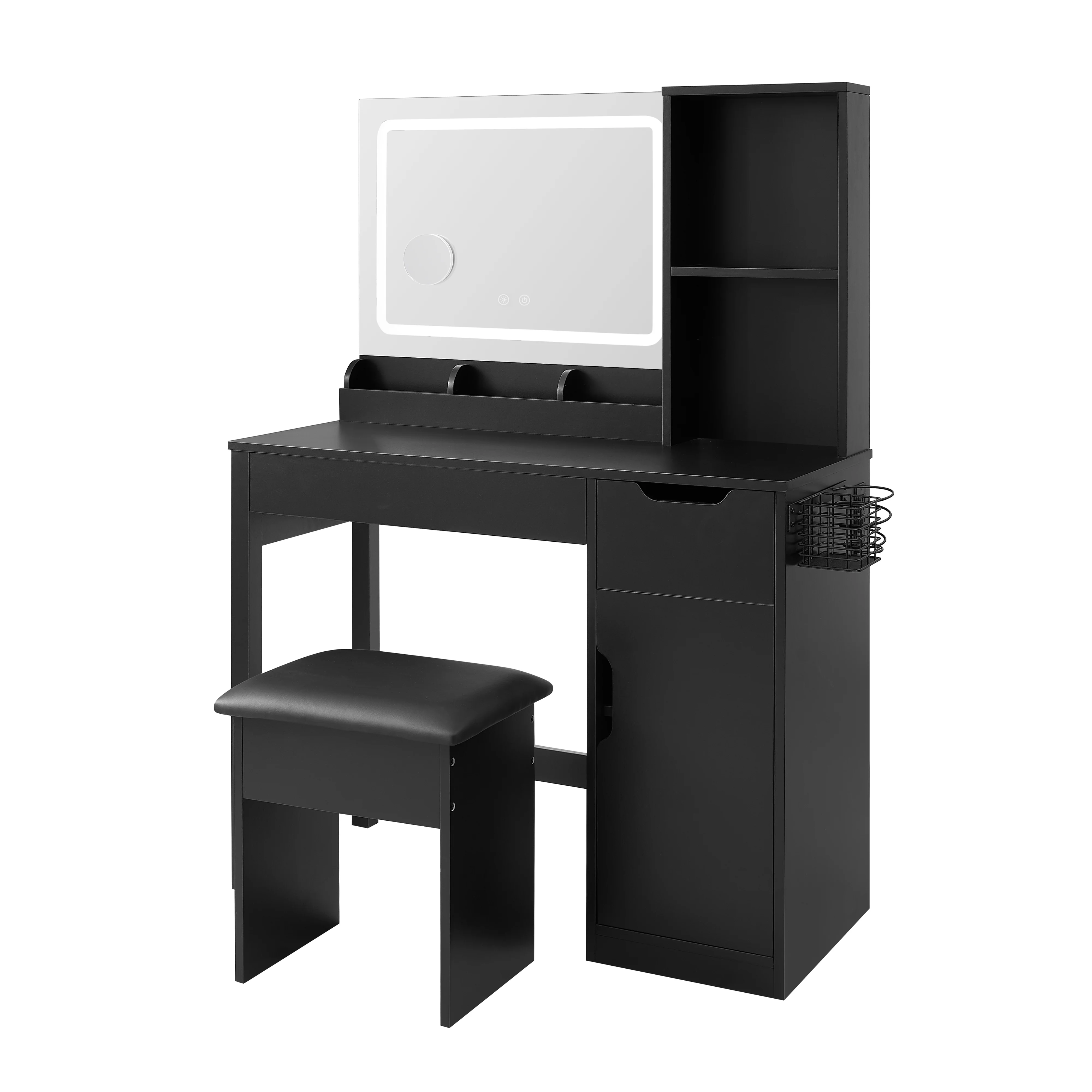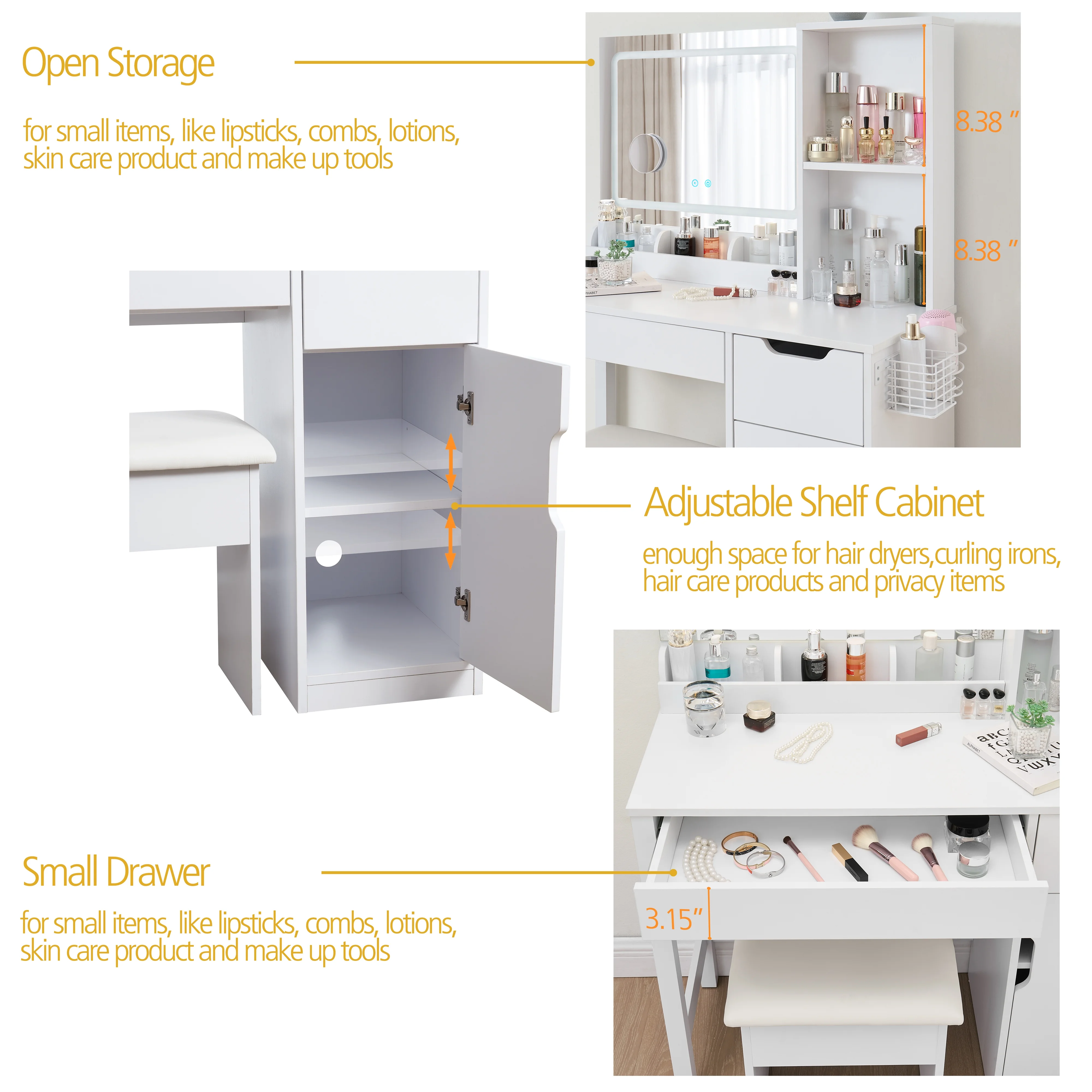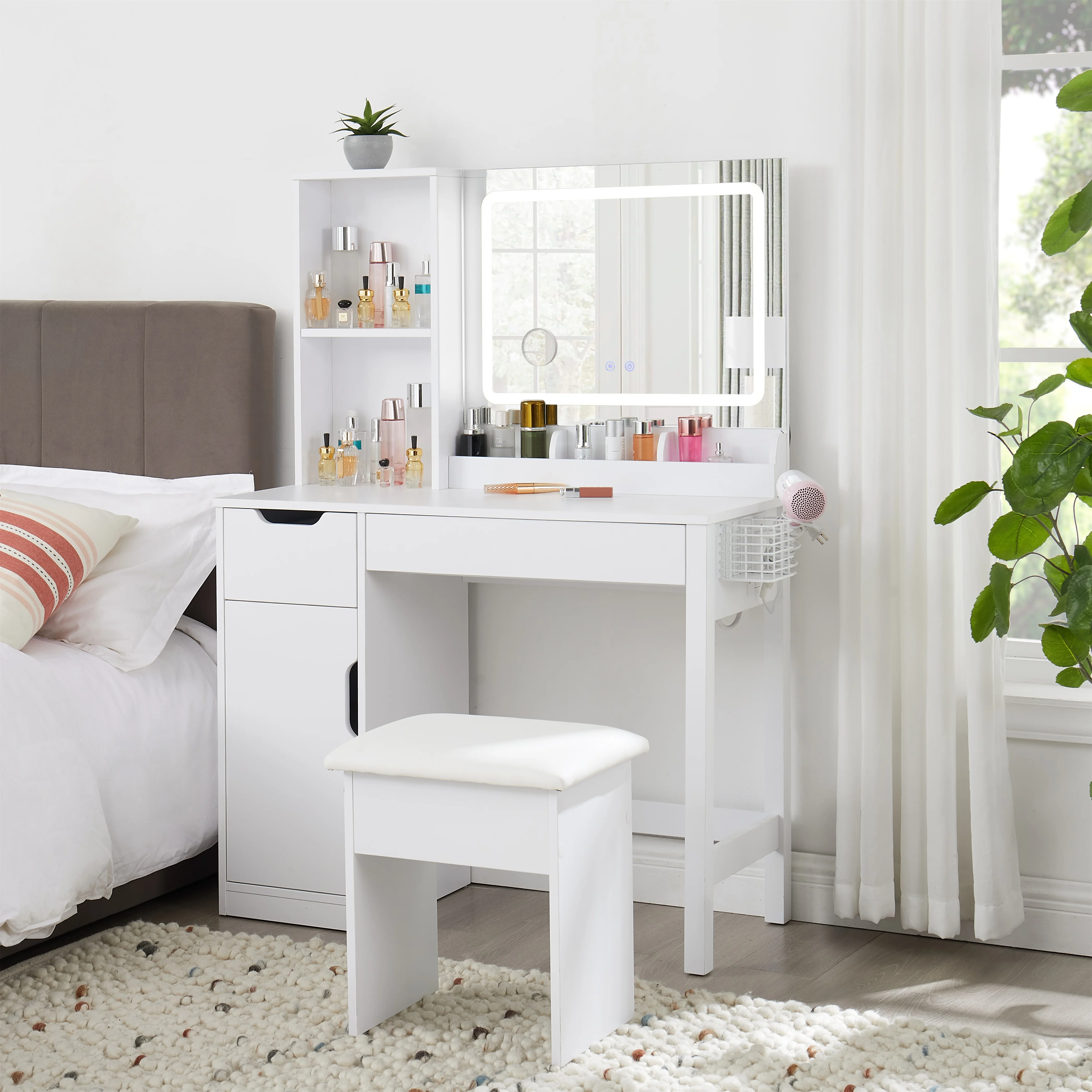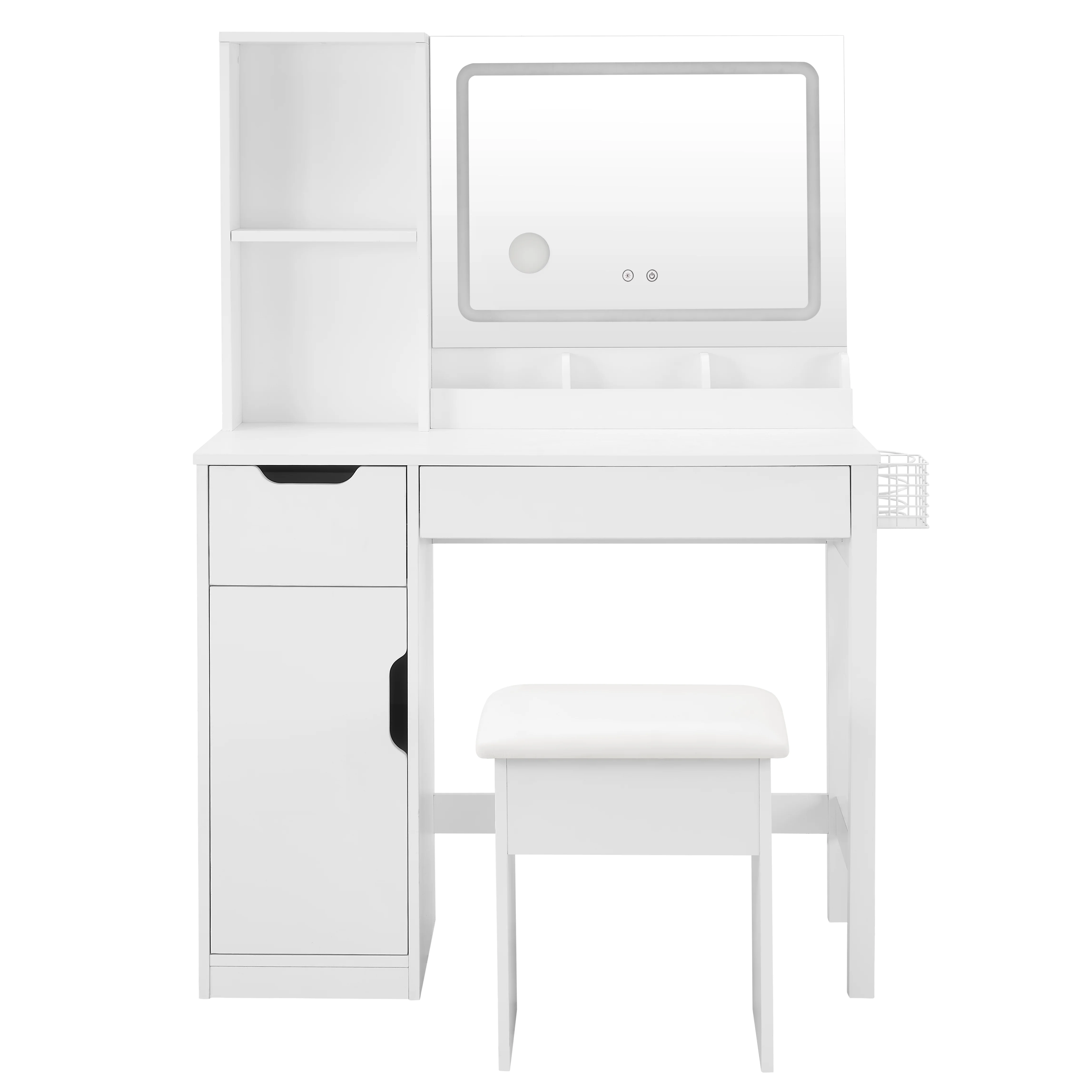 - Vanity with Makeup Mirror & LED Light-with a Large HD mirror providing a wider field of view. LED light with 3 color modes allows you to customize your lighting scheme. & Touch switch, lights can be switched with just a touch. The lightness will be adjustable if you press the button. & You can do your makeup in different angle. It can accurately illuminate skin color and complexion during the day or at night, allowing you to enjoy every detail of makeup.