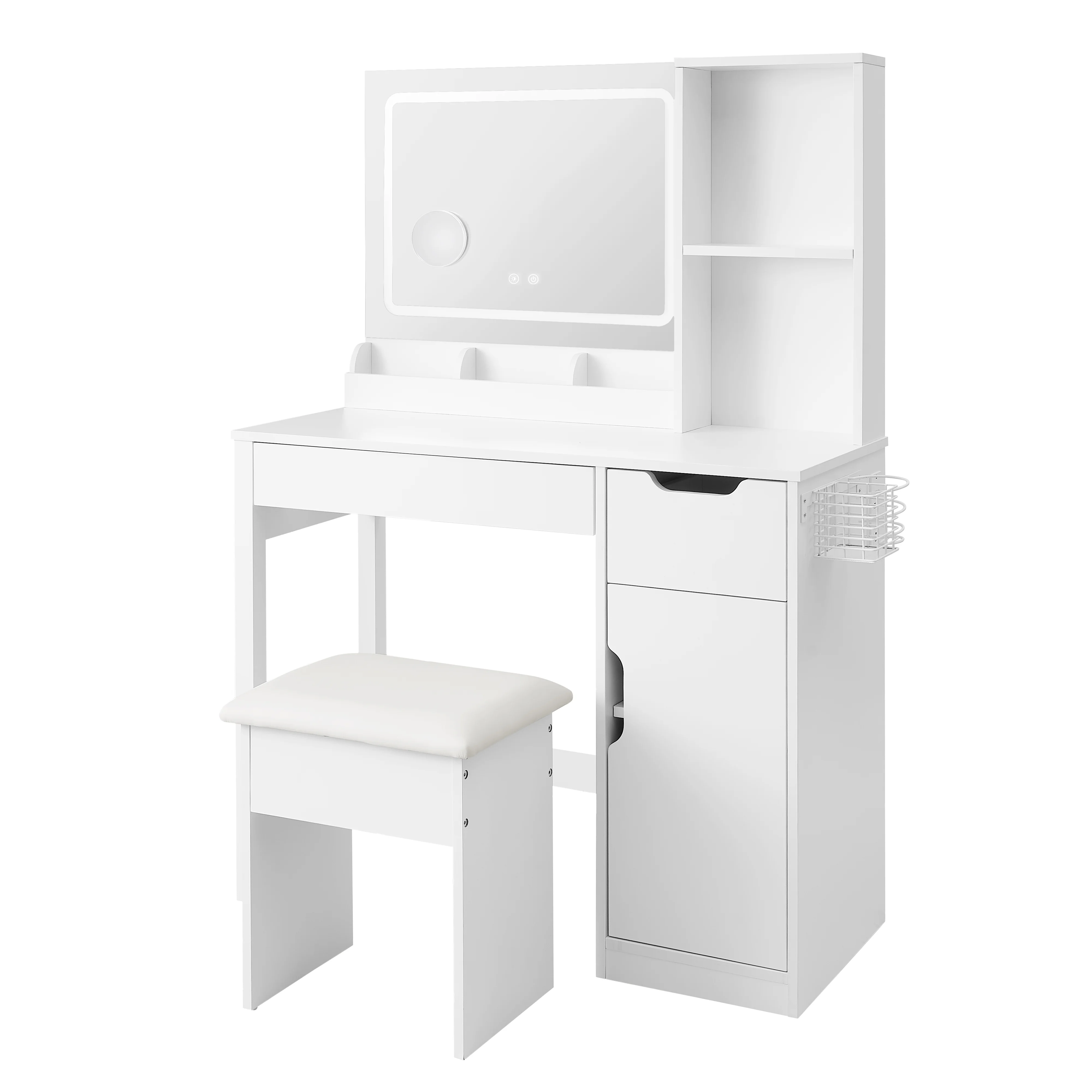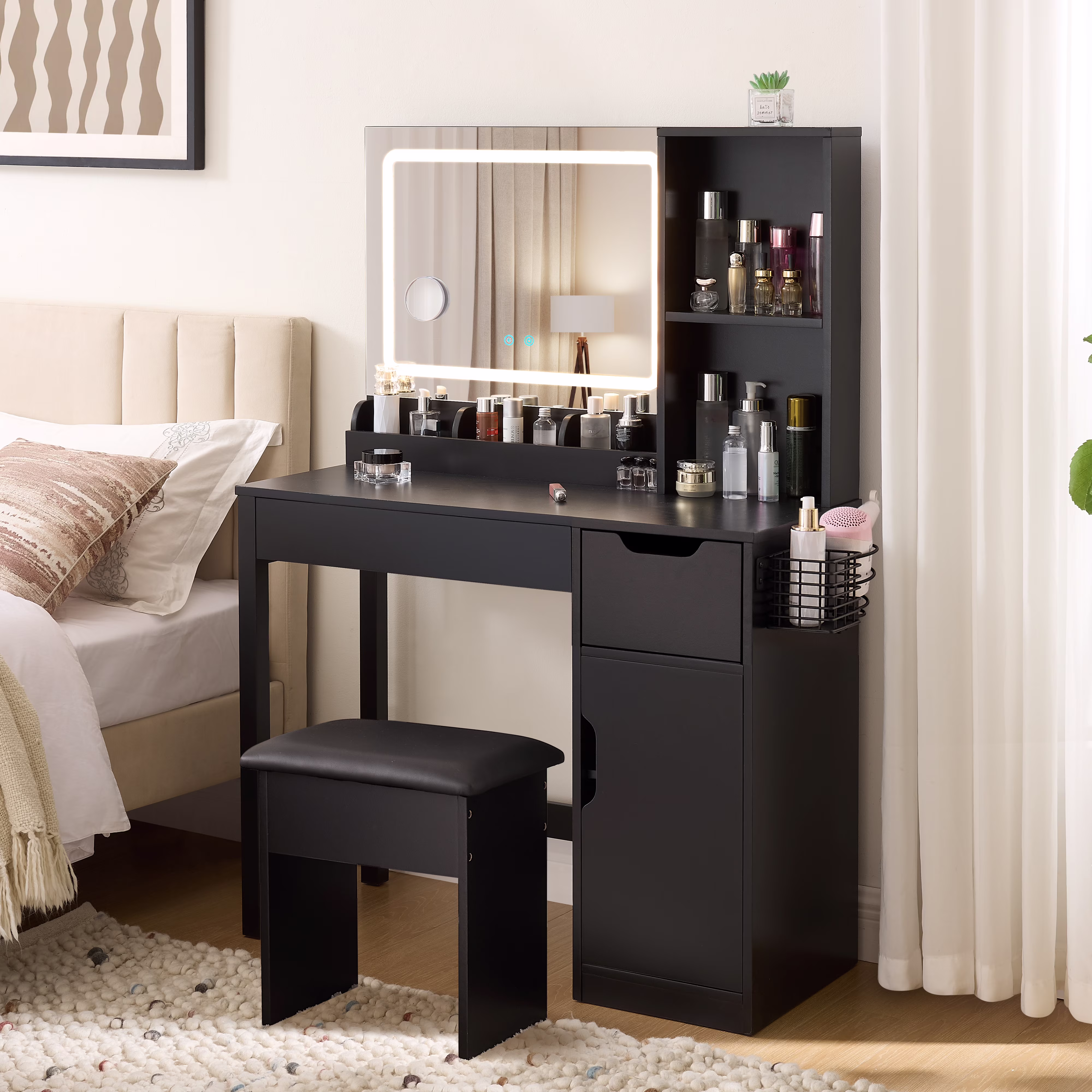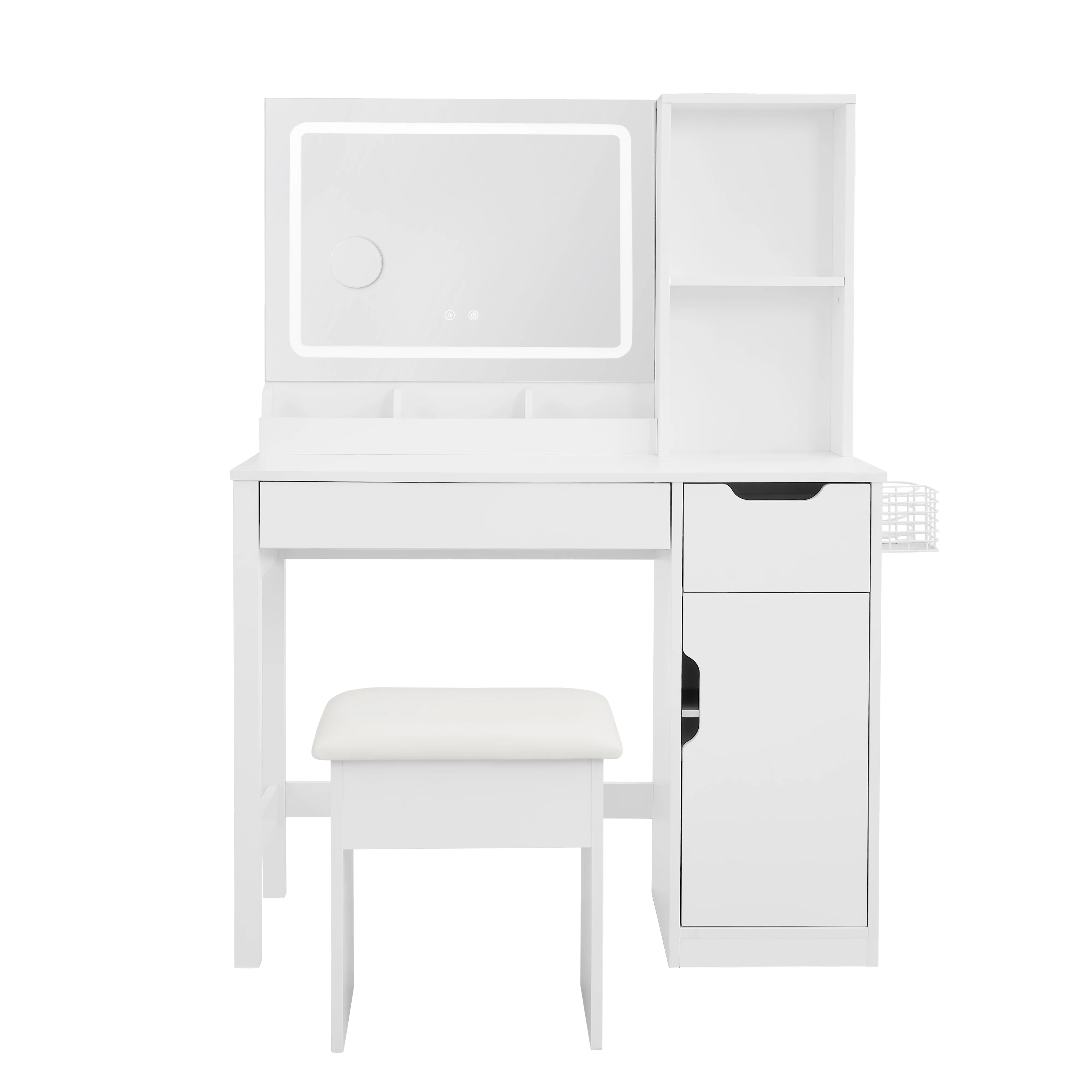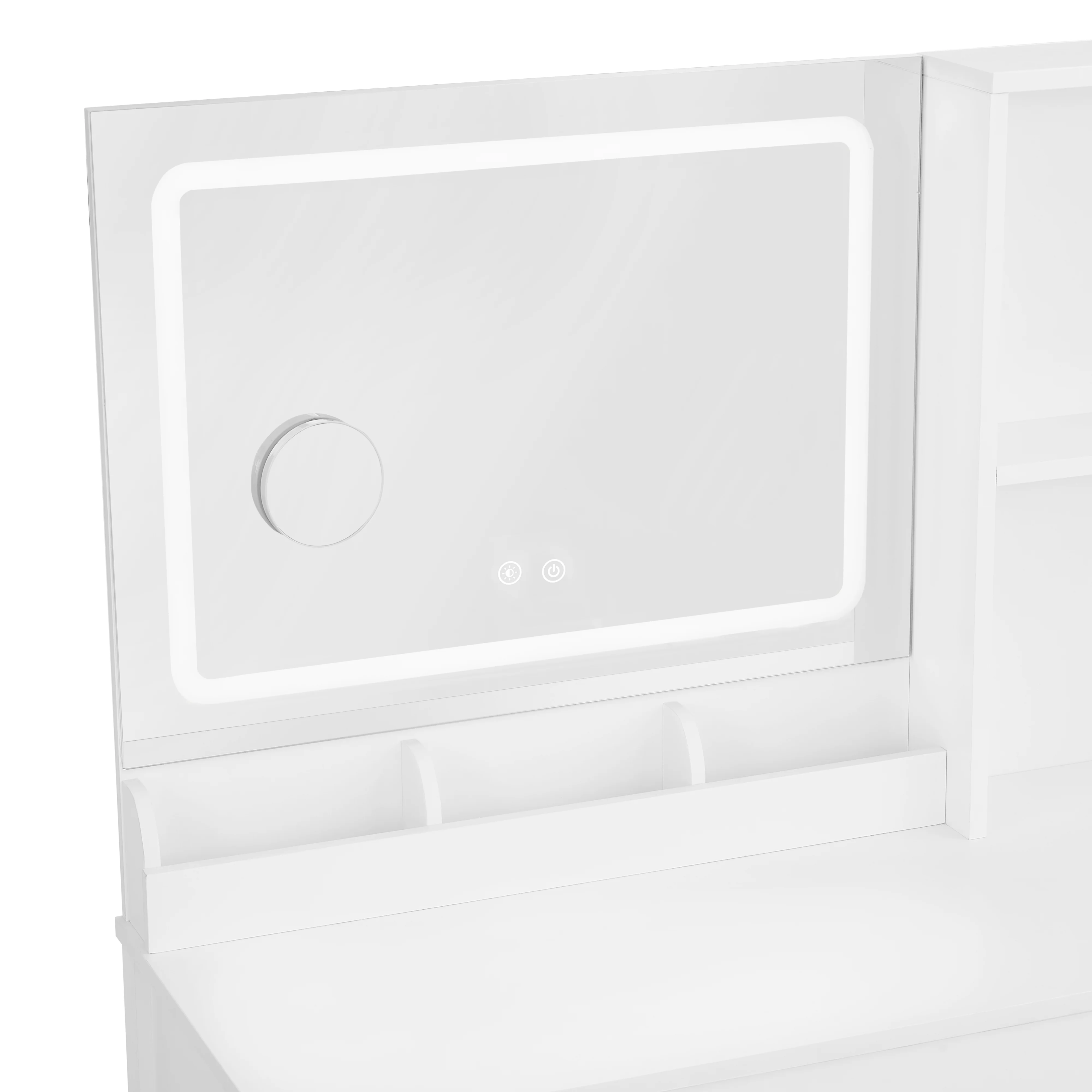 - Vanity with Makeup Mirror & LED Light-with a Large HD mirror providing a wider field of view. LED light with 3 color modes allows you to customize your lighting scheme. & Touch switch, lights can be switched with just a touch. The lightness will be adjustable if you press the button. & You can do your makeup in different angle. It can accurately illuminate skin color and complexion during the day or at night, allowing you to enjoy every detail of makeup.