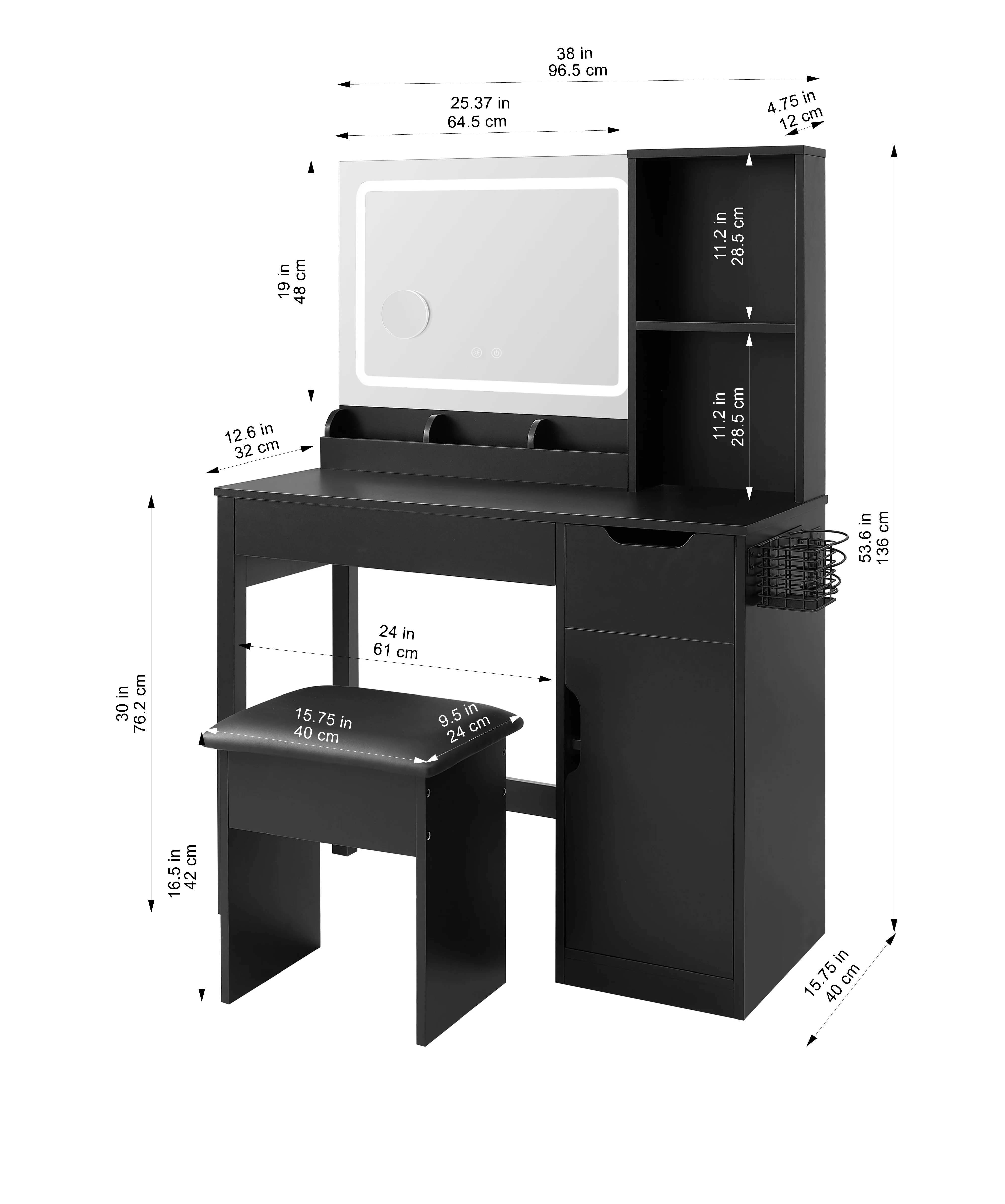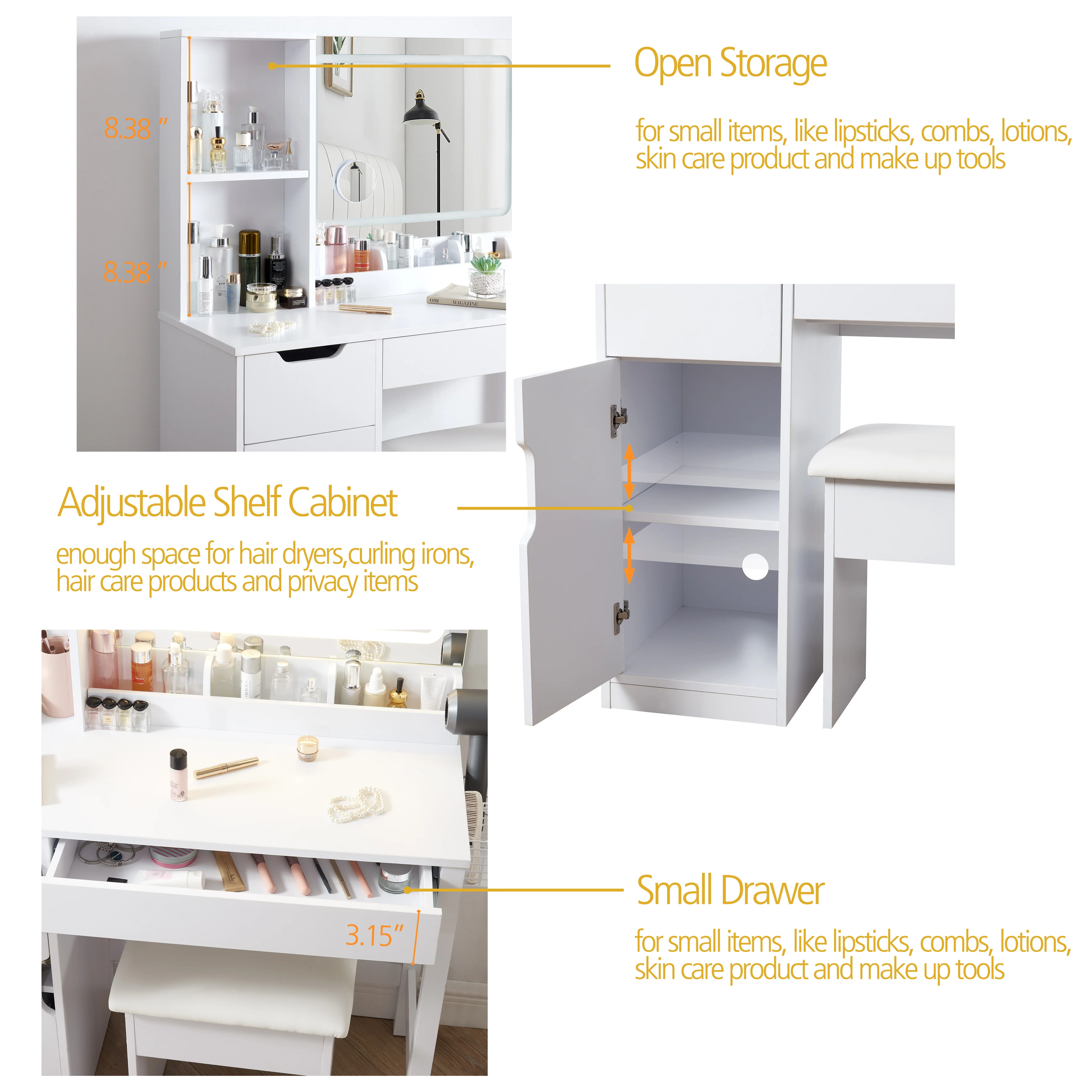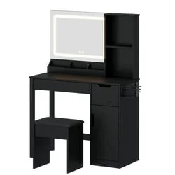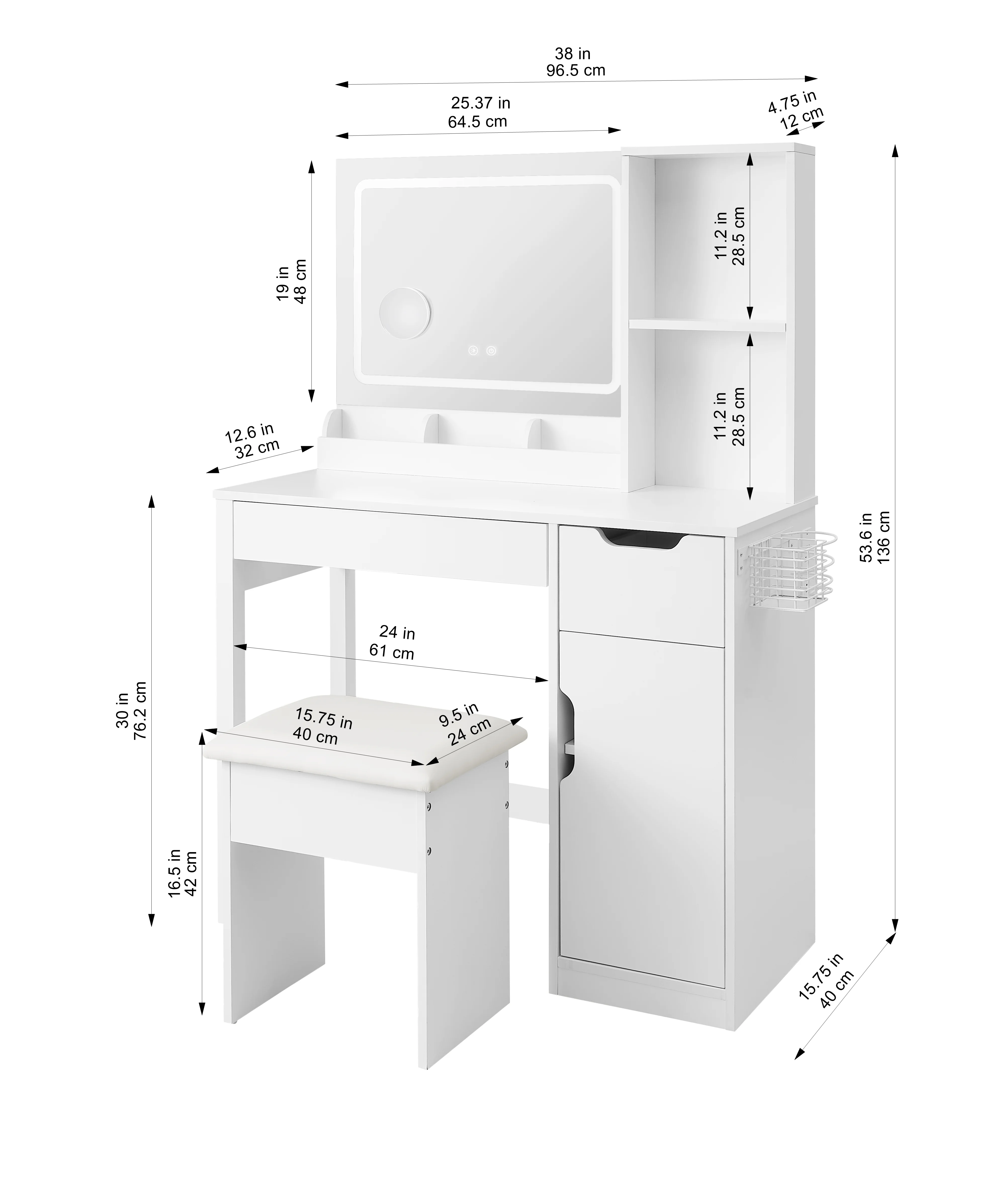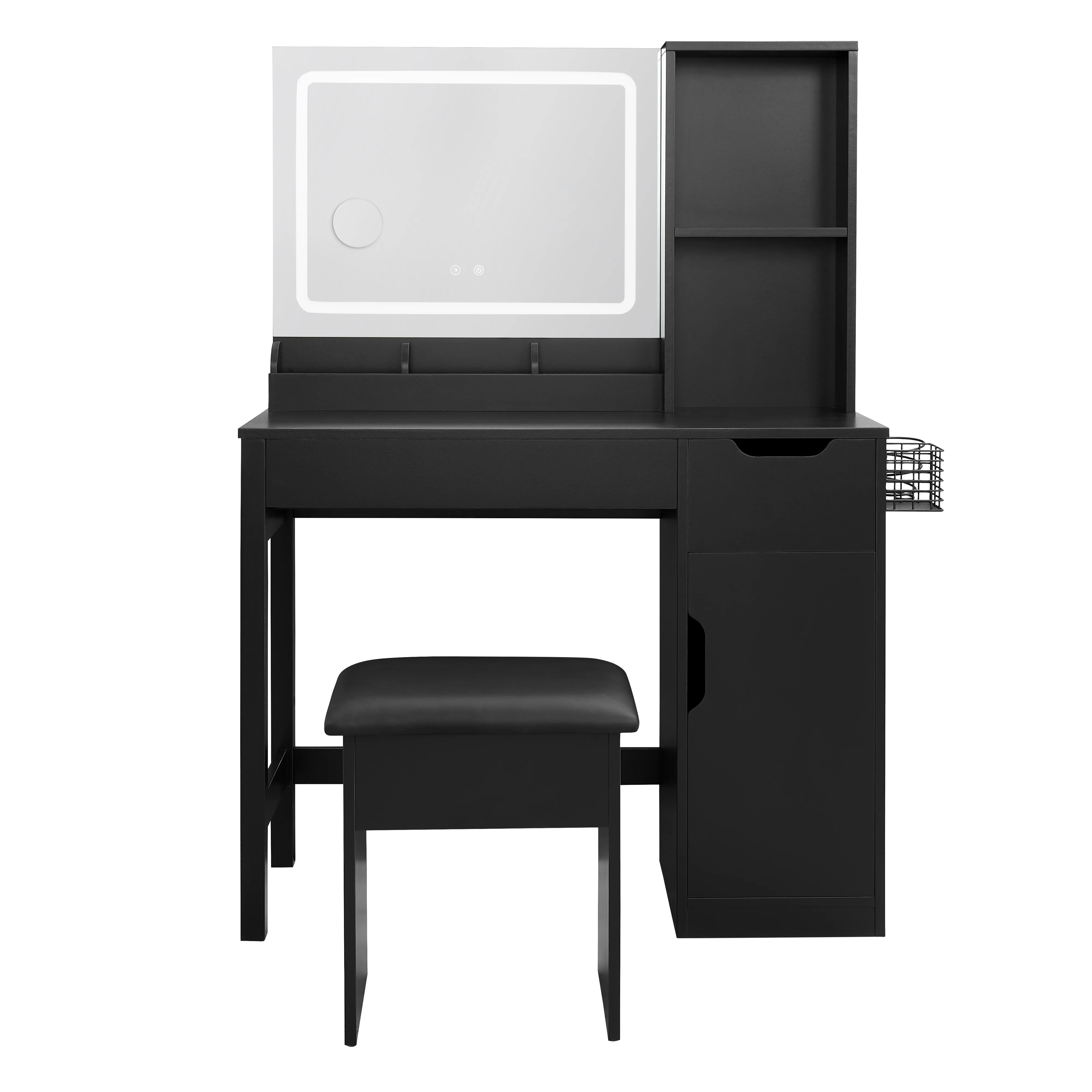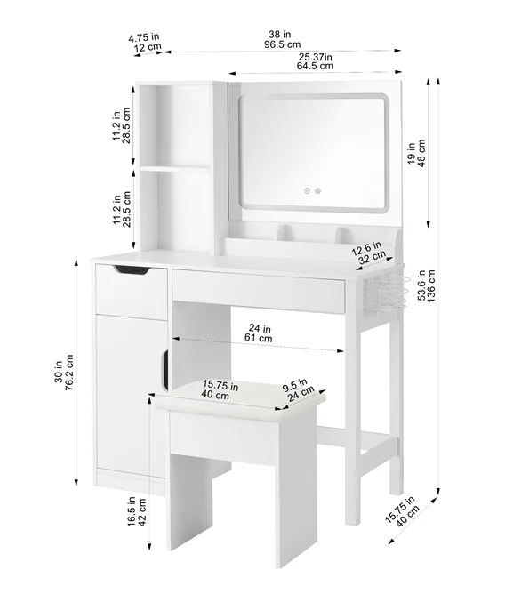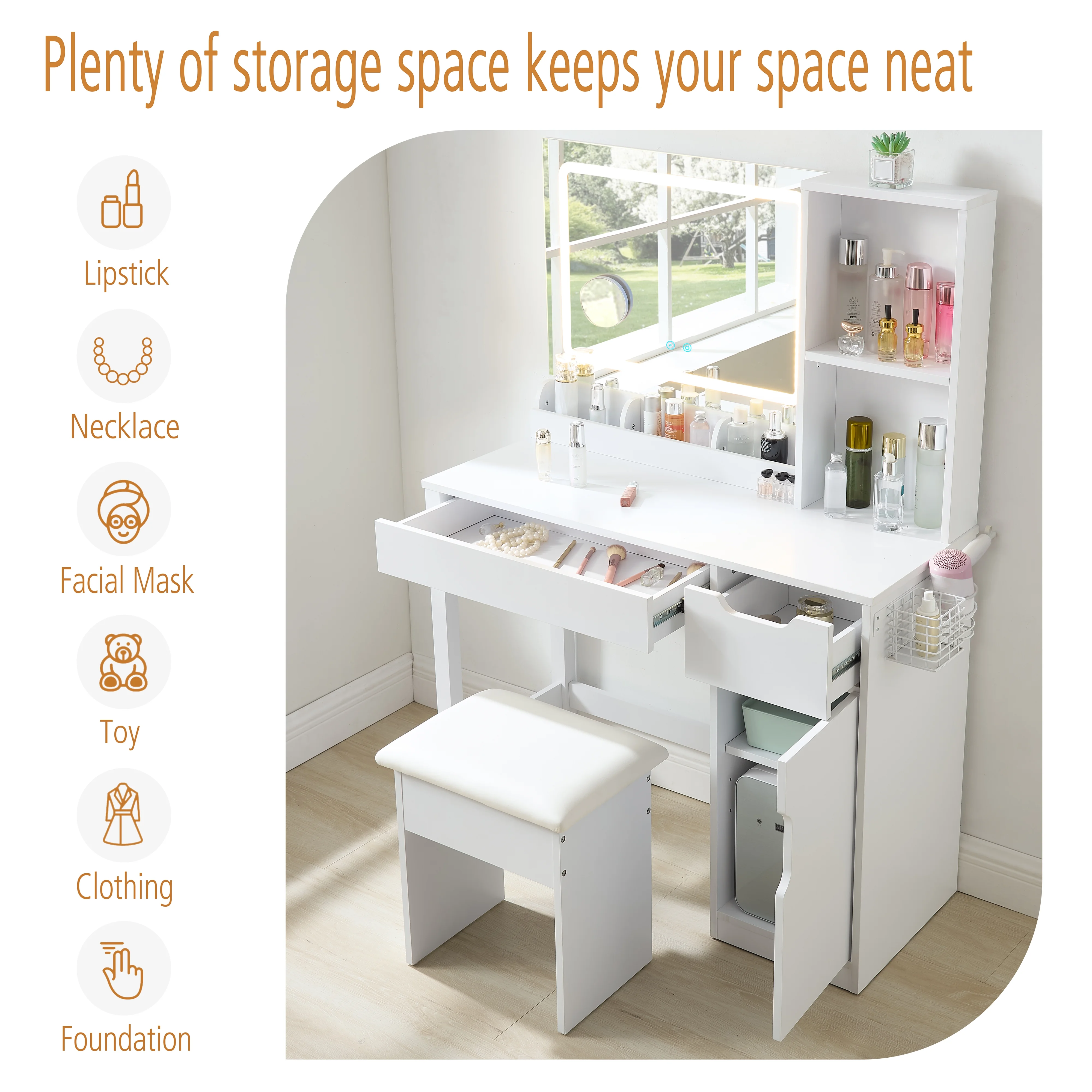 - Vanity with Makeup Mirror & LED Light-with a Large HD mirror providing a wider field of view. LED light with 3 color modes allows you to customize your lighting scheme. & Touch switch, lights can be switched with just a touch. The lightness will be adjustable if you press the button. & You can do your makeup in different angle. It can accurately illuminate skin color and complexion during the day or at night, allowing you to enjoy every detail of makeup.