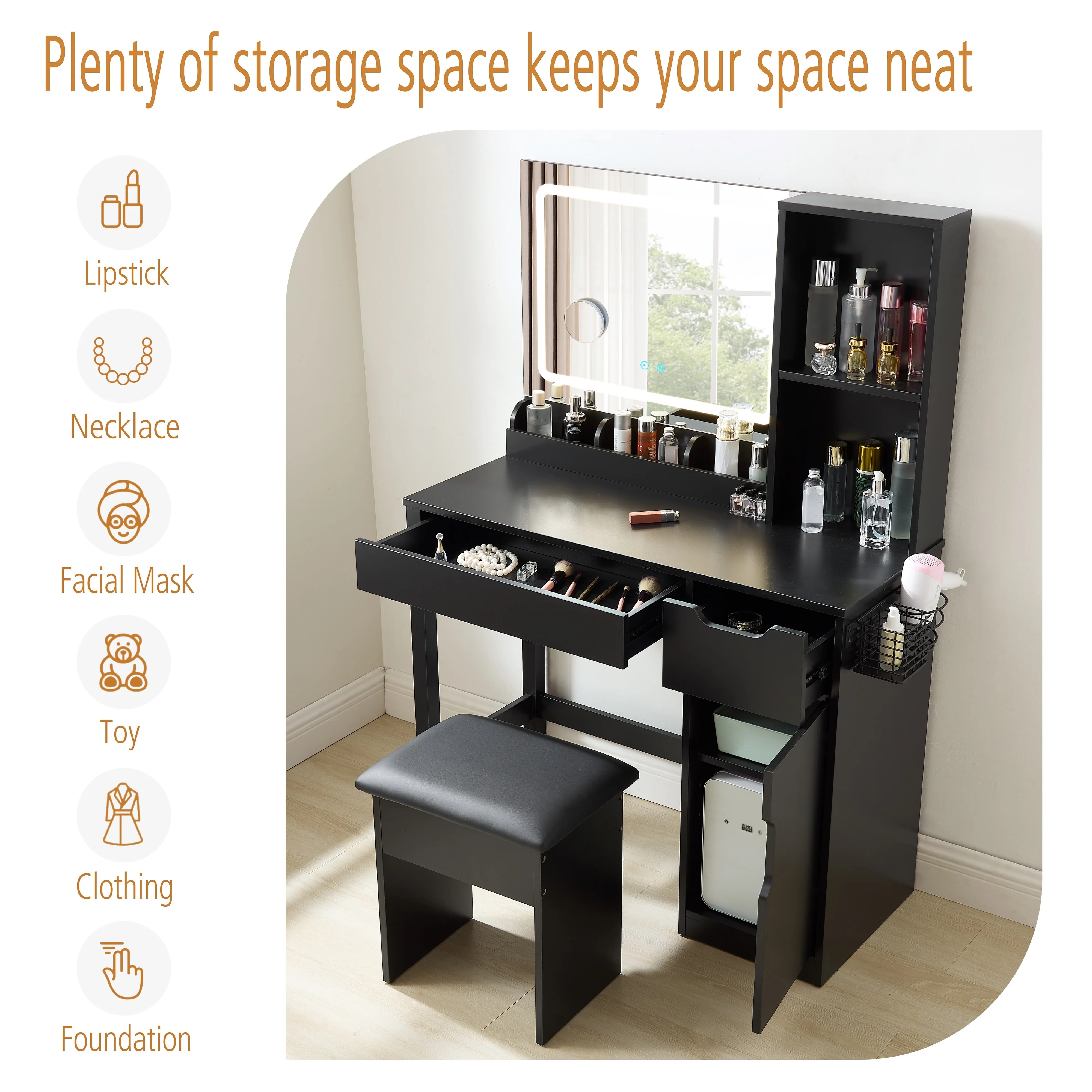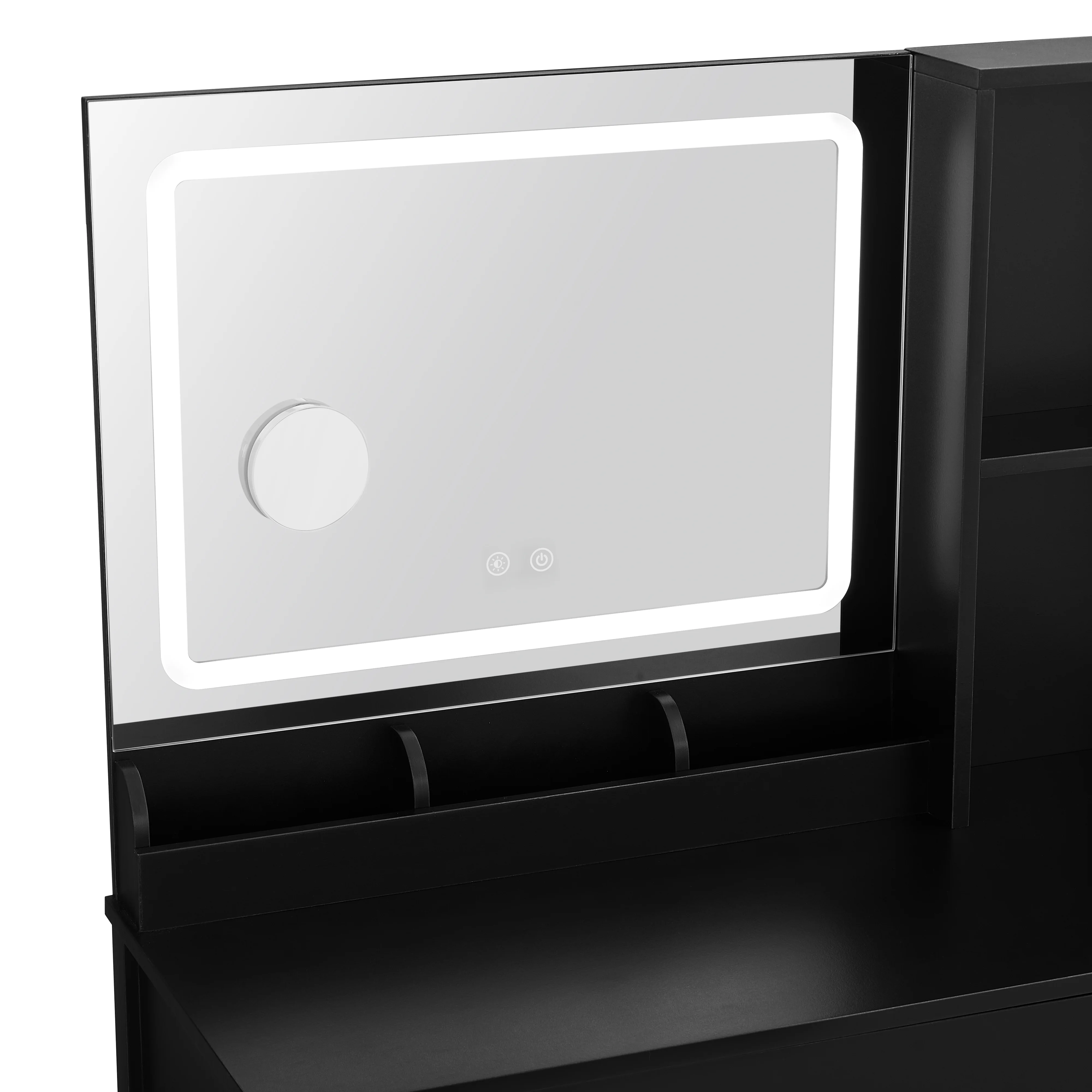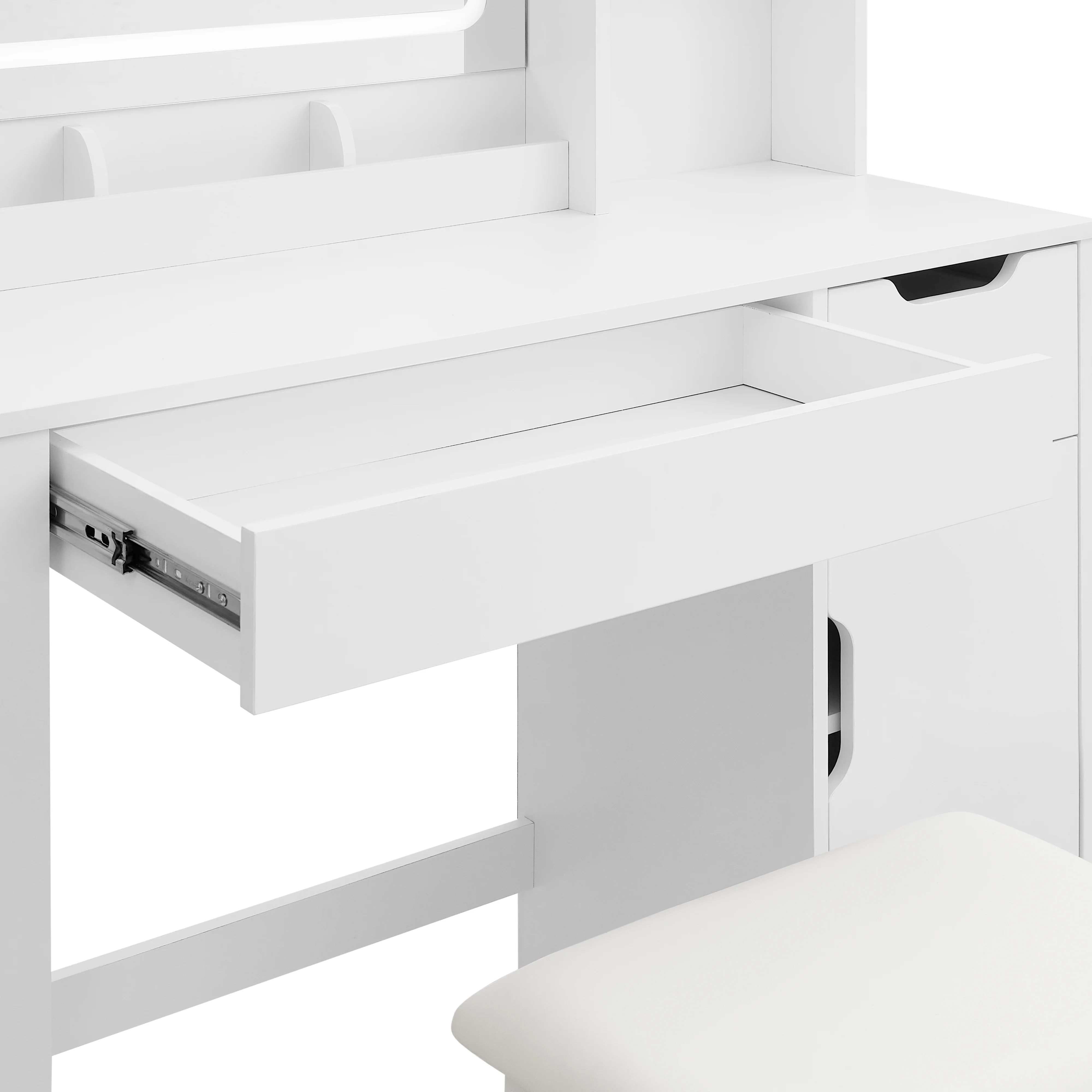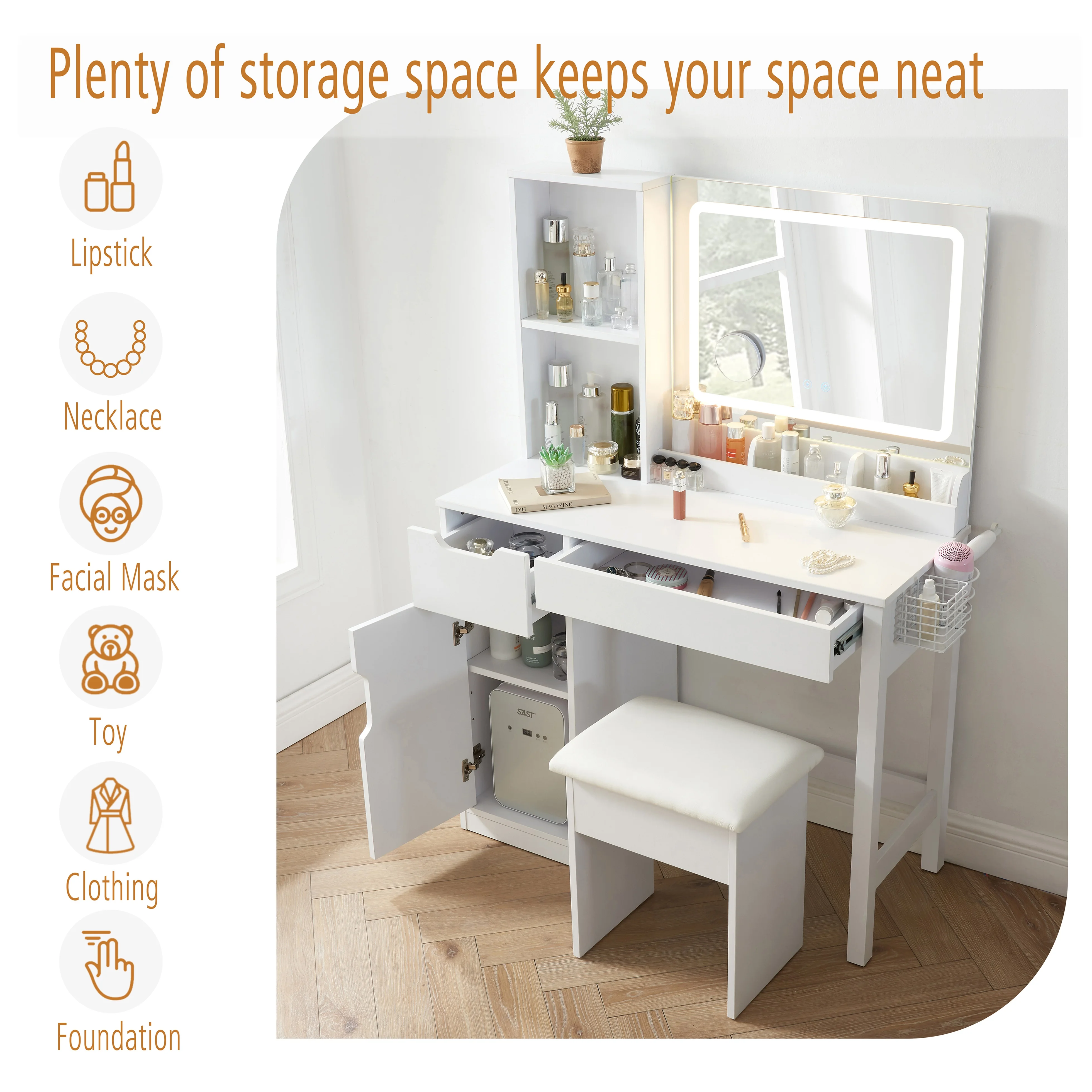 - Vanity with Makeup Mirror & LED Light-with a Large HD mirror providing a wider field of view. LED light with 3 color modes allows you to customize your lighting scheme. & Touch switch, lights can be switched with just a touch. The lightness will be adjustable if you press the button. & You can do your makeup in different angle. It can accurately illuminate skin color and complexion during the day or at night, allowing you to enjoy every detail of makeup.