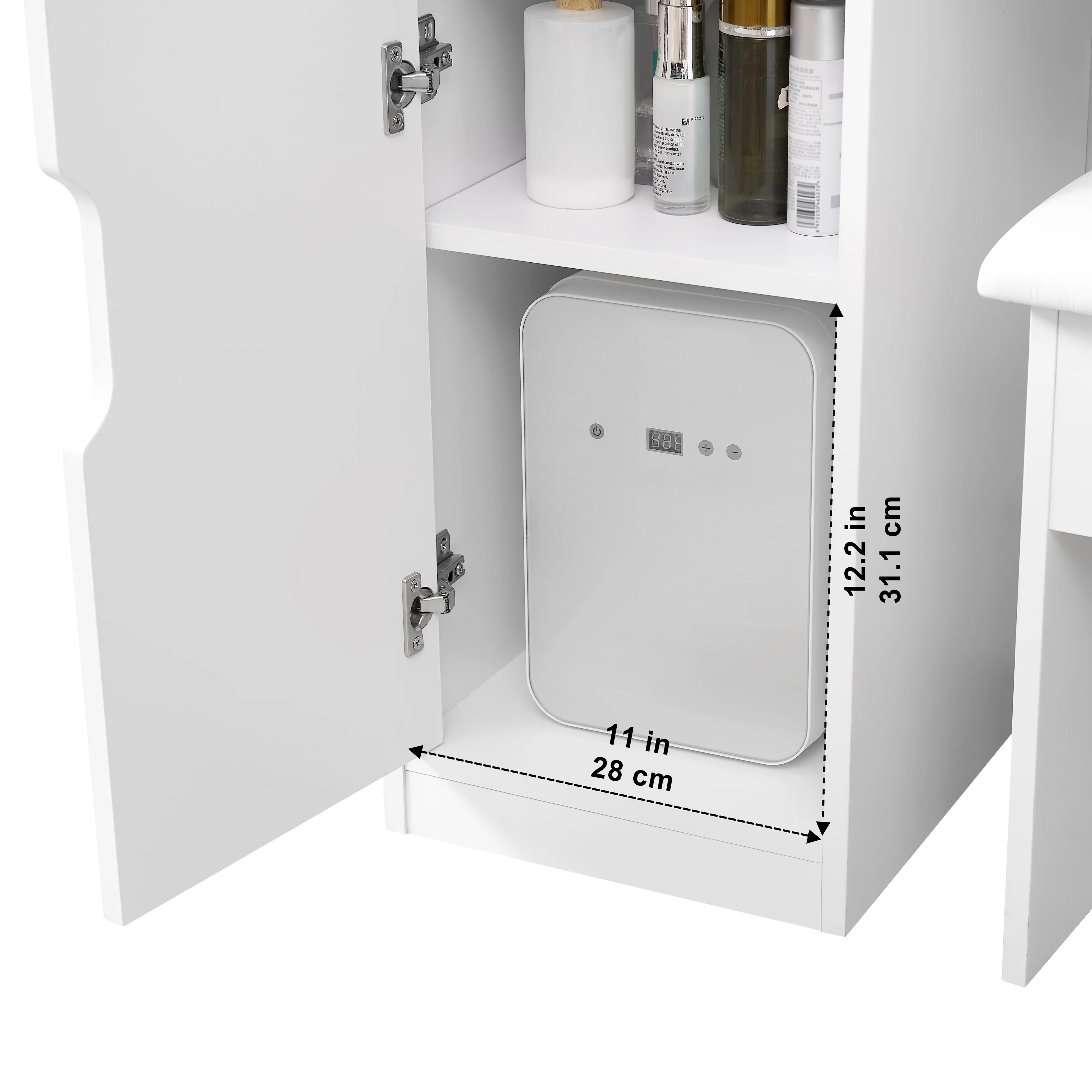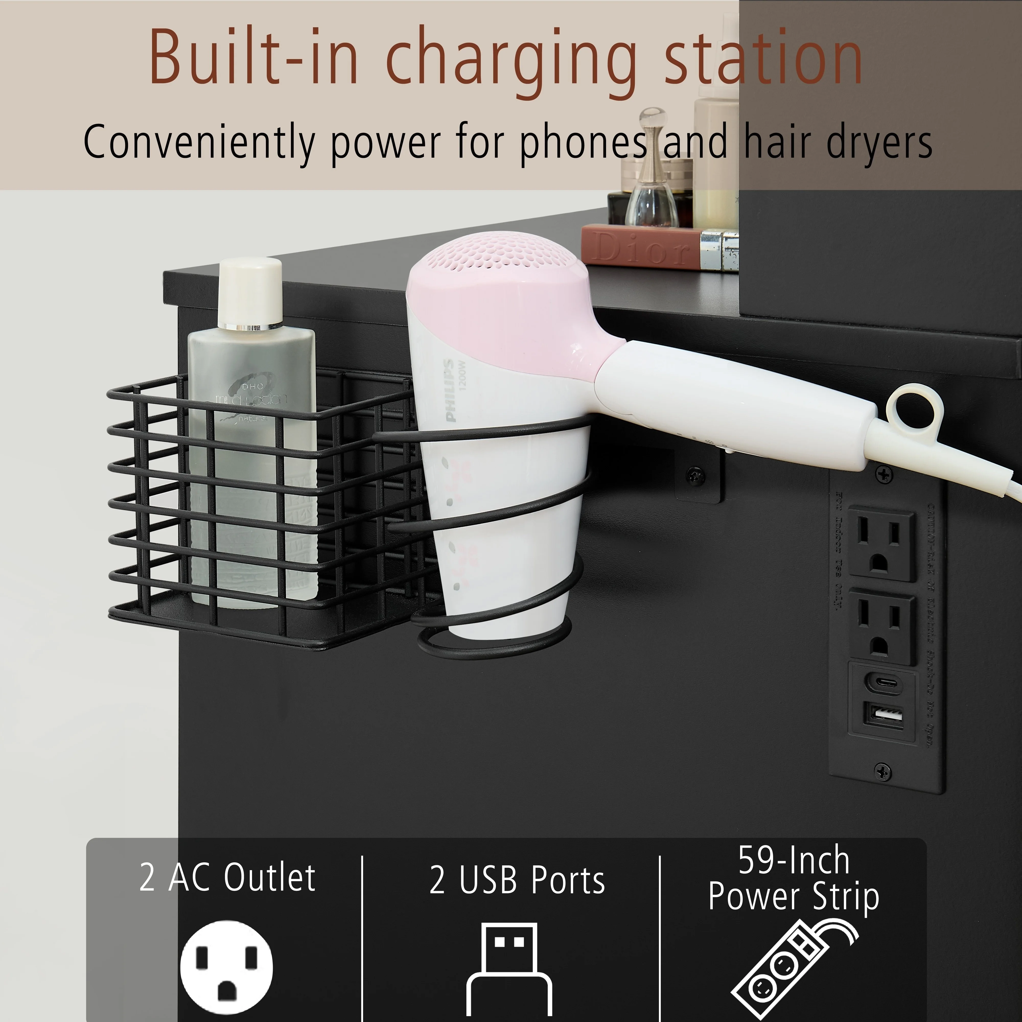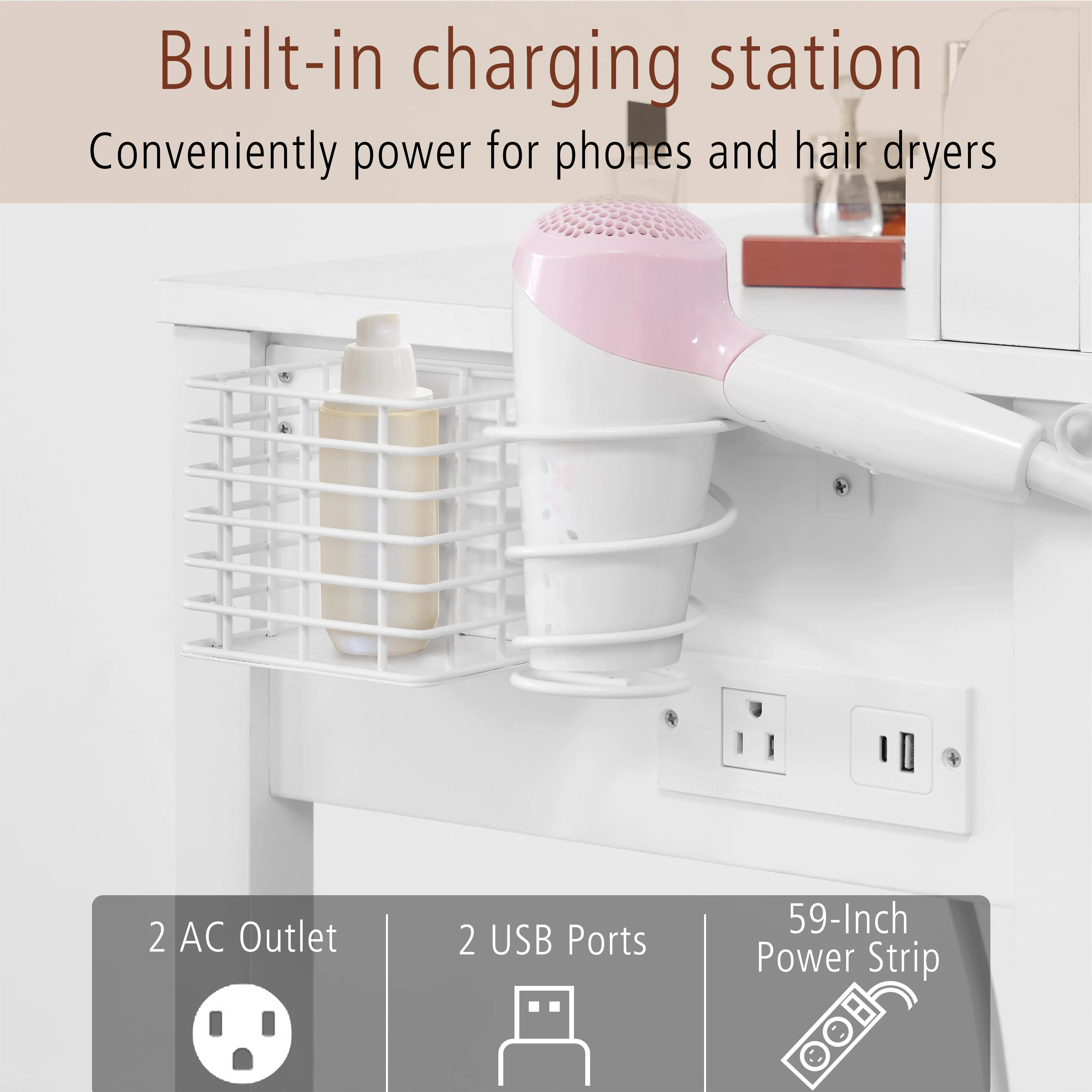 - Make Up Desk with Charging Station-The upgraded make up desk comes with a power outlet, two USB ports, and a hairdryer holder, allowing you to sit at the vanity and easily use your hair dryer or curling iron and charge your phone, tablet, etc.