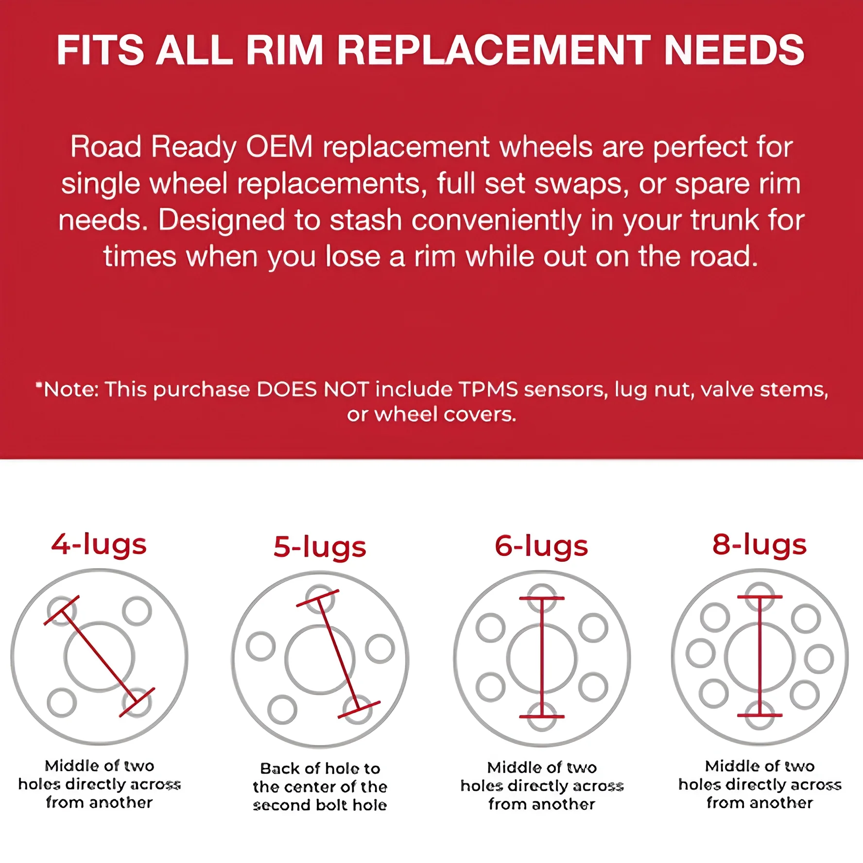 - FITS ALL RIM REPLACEMENT NEEDS - Road Ready OEM replacement wheels are perfect for single wheel replacements, full set swaps, or spare rim needs. Designed to stash conveniently in your trunk for times when you lose a rim while out on the road. *Note: This purchase DOES NOT include TPMS sensors, lug nuts, valve stems, or wheel covers.