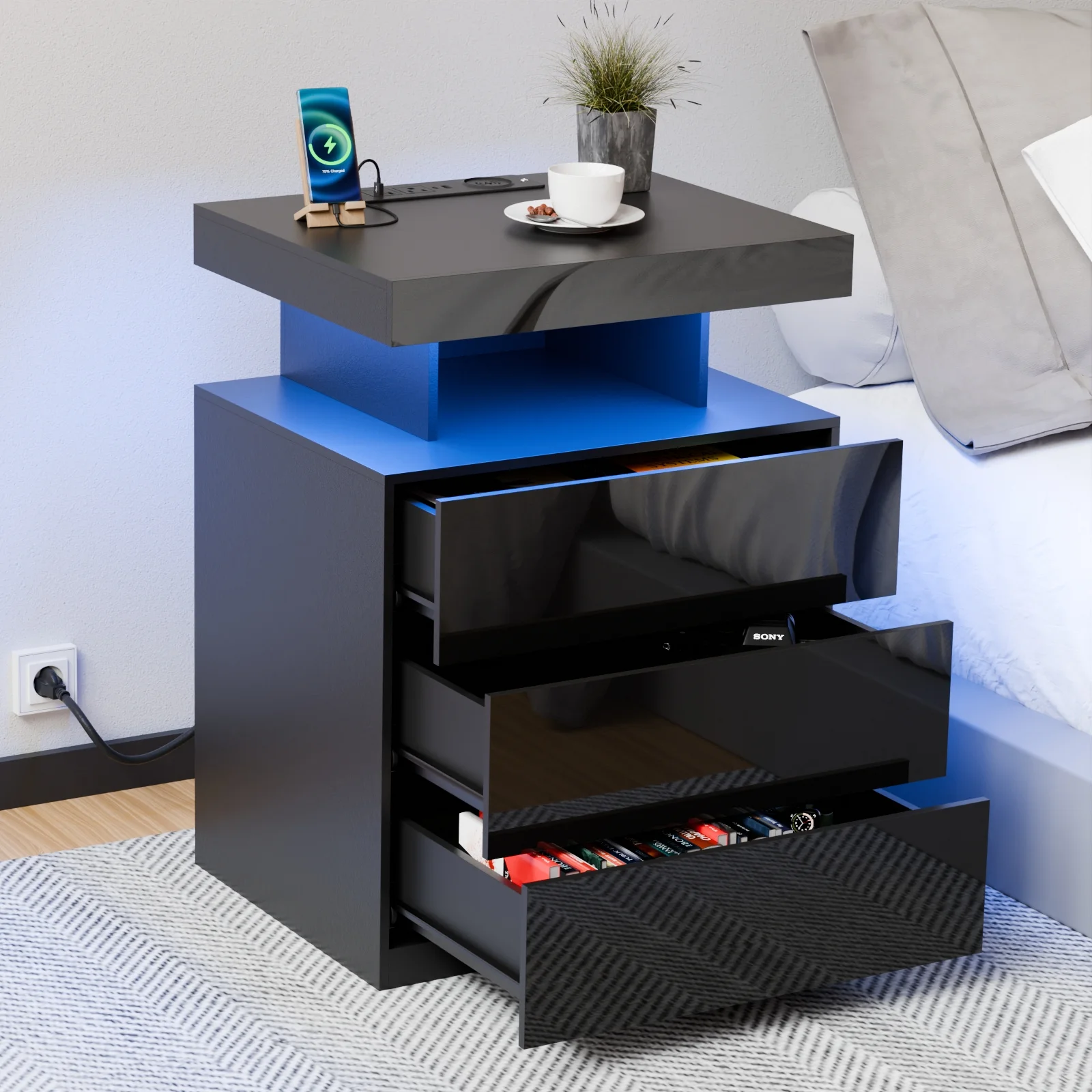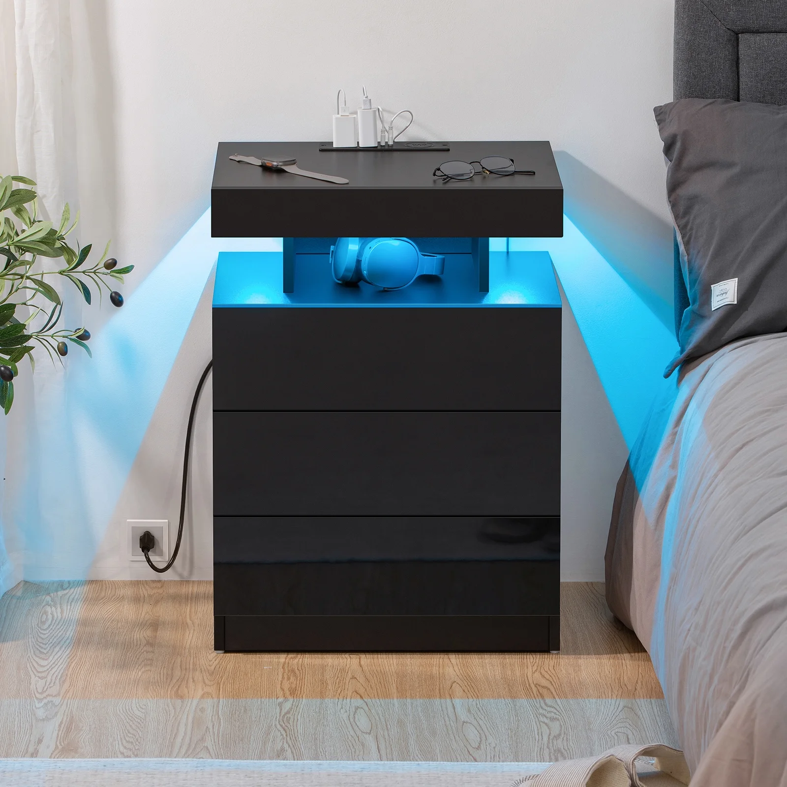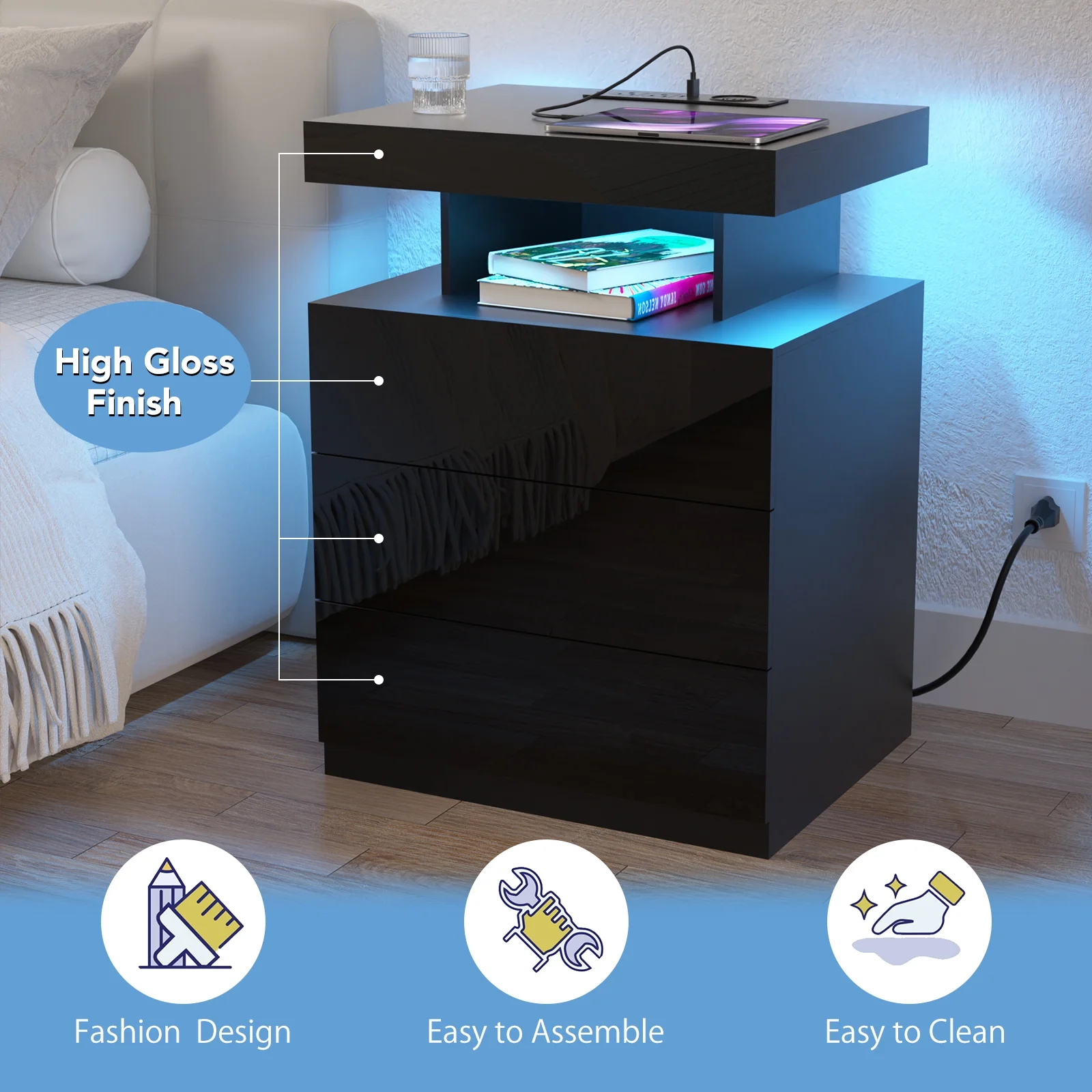 Hommpa LED Nightstand Wireless Charging Station USB Type C Outlets Bedside Table 3 Drawers Black Night Table Modern Smart Nightstand High Gloss End Side Table for Bedroom Furniture 26.8" Tall