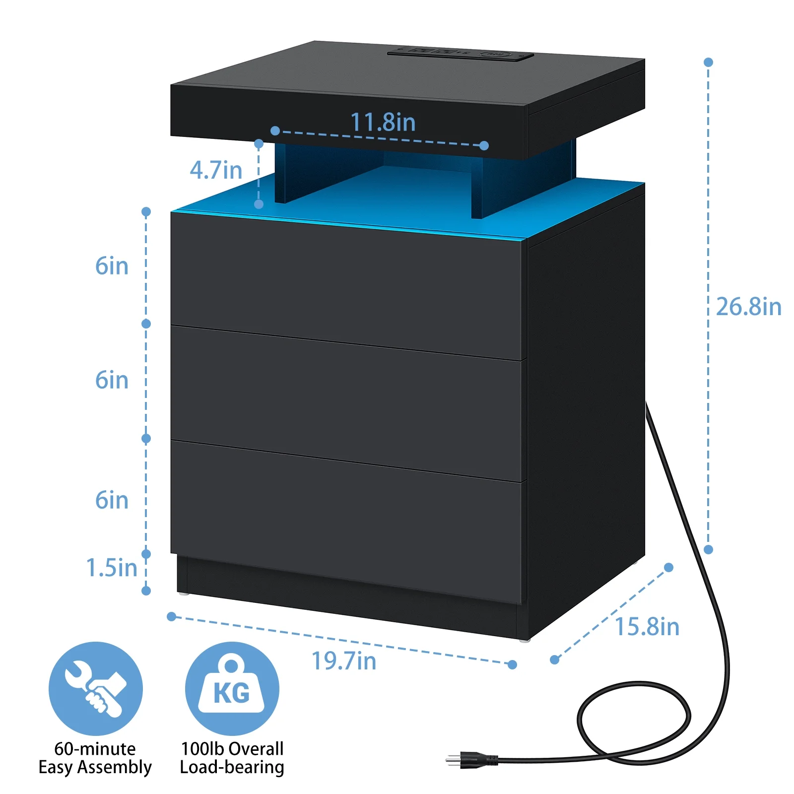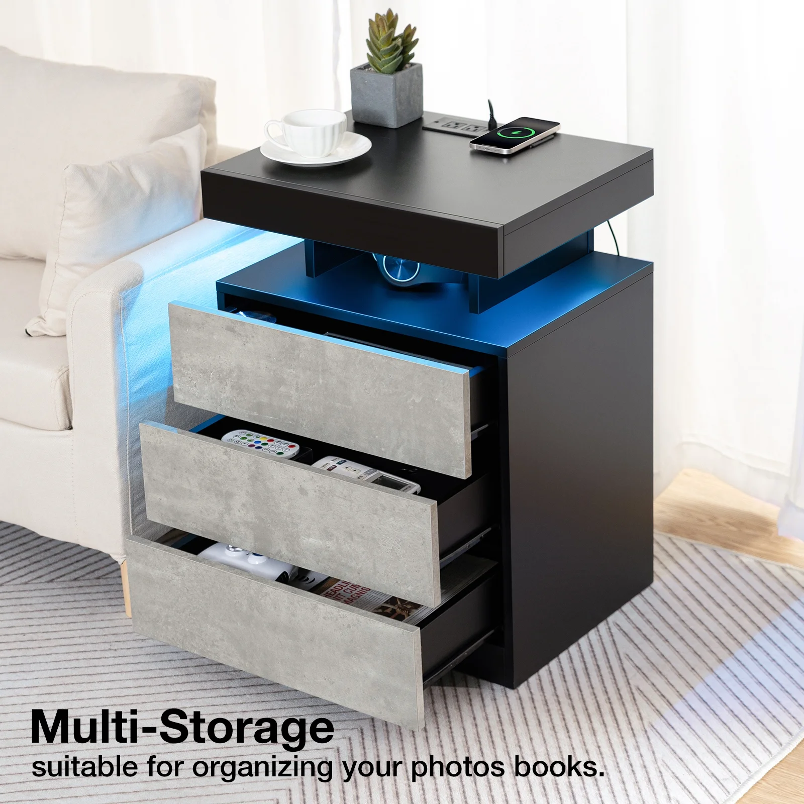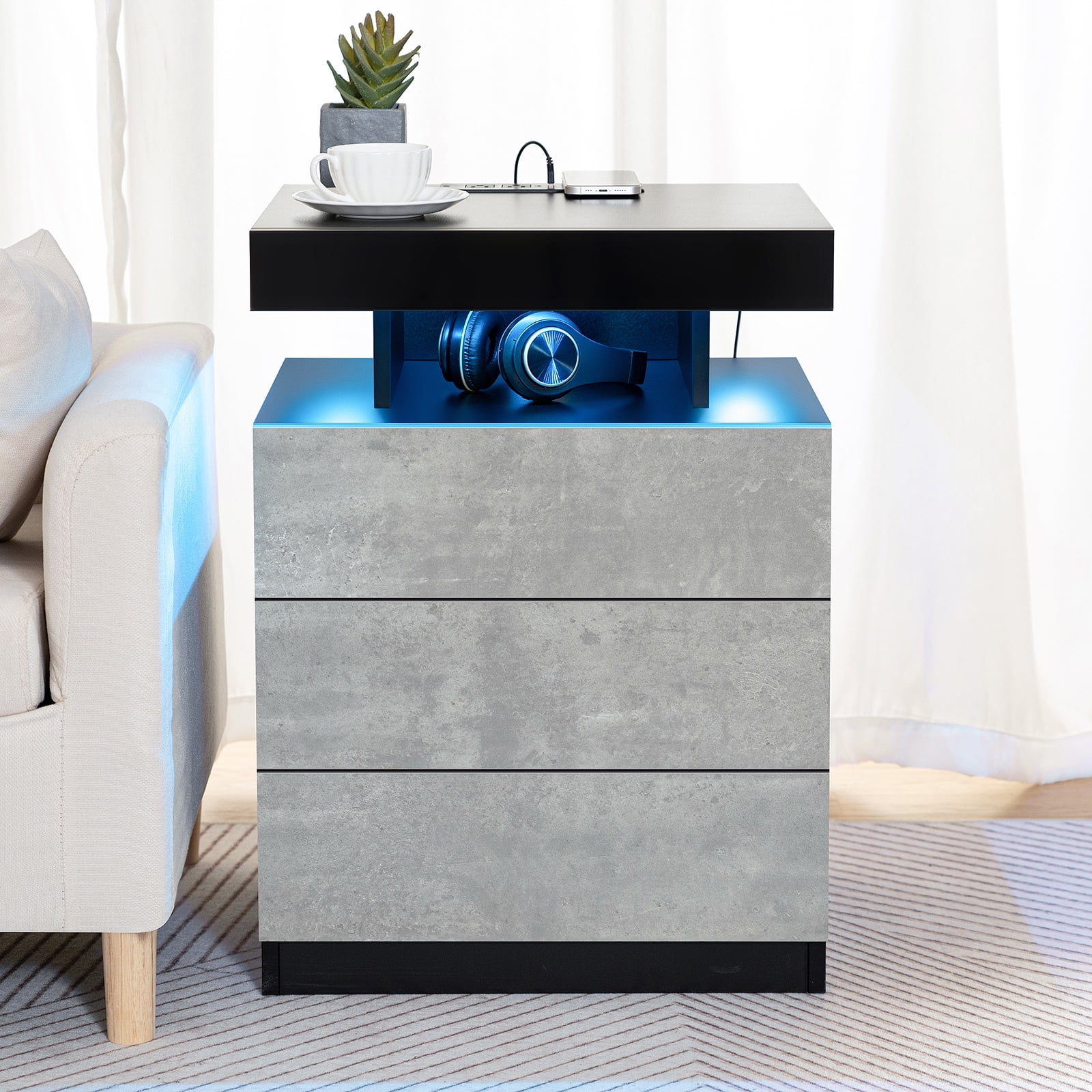 Hommpa LED Nightstand Wireless Charging Station USB Type C Outlets Bedside Table 3 Drawers Black Night Table Modern Smart Nightstand High Gloss End Side Table for Bedroom Furniture 26.8" Tall
