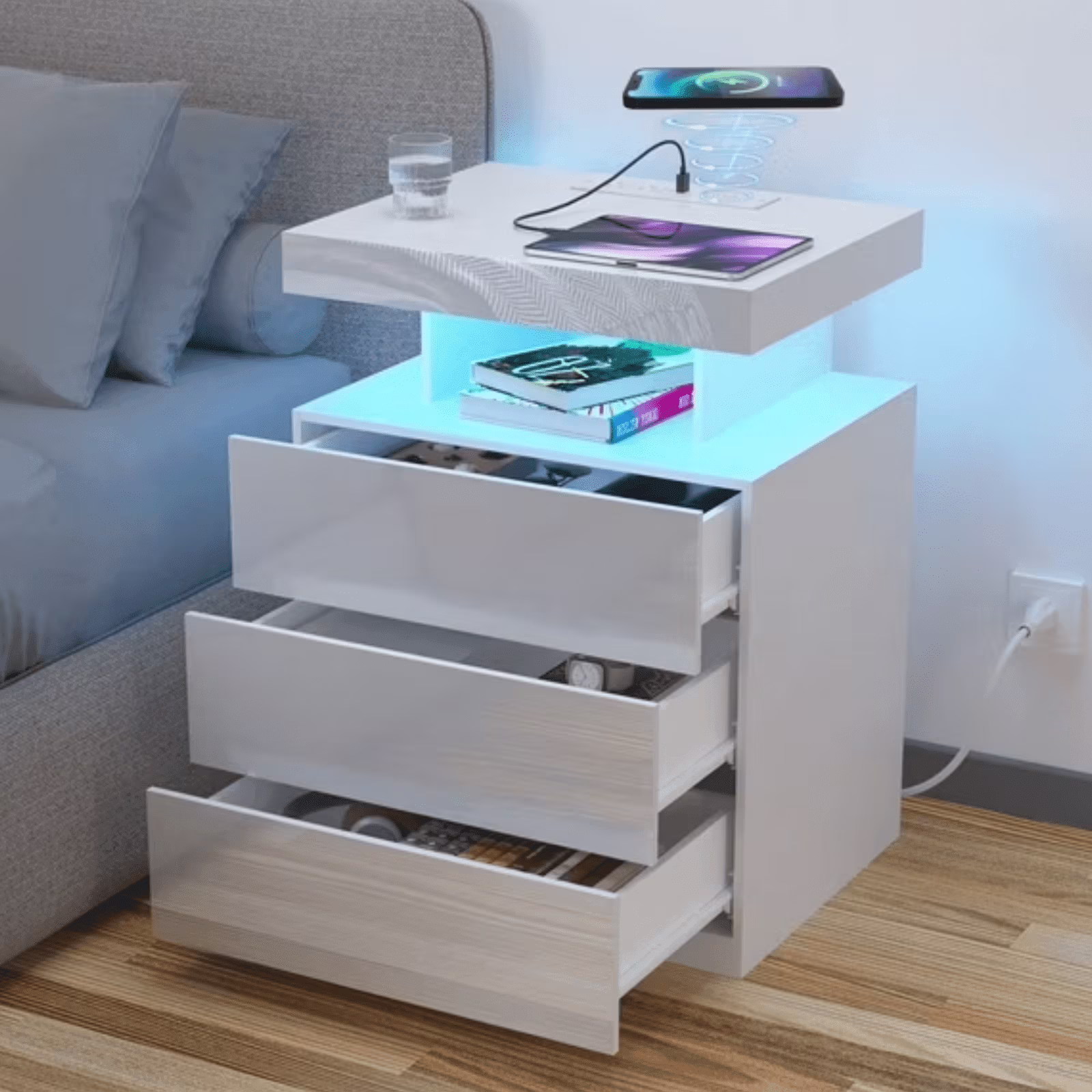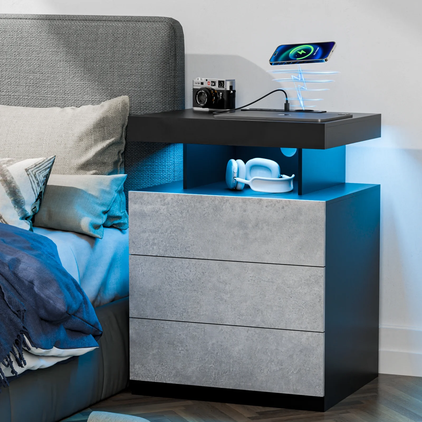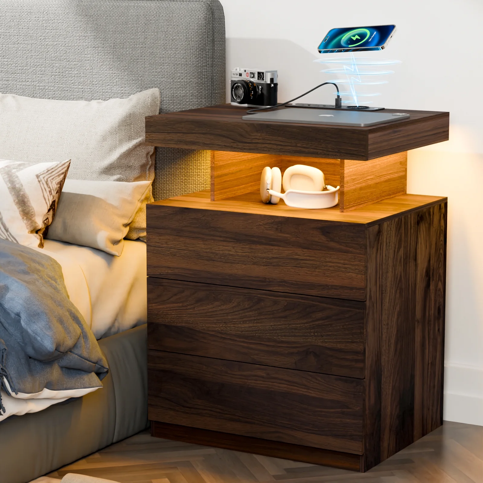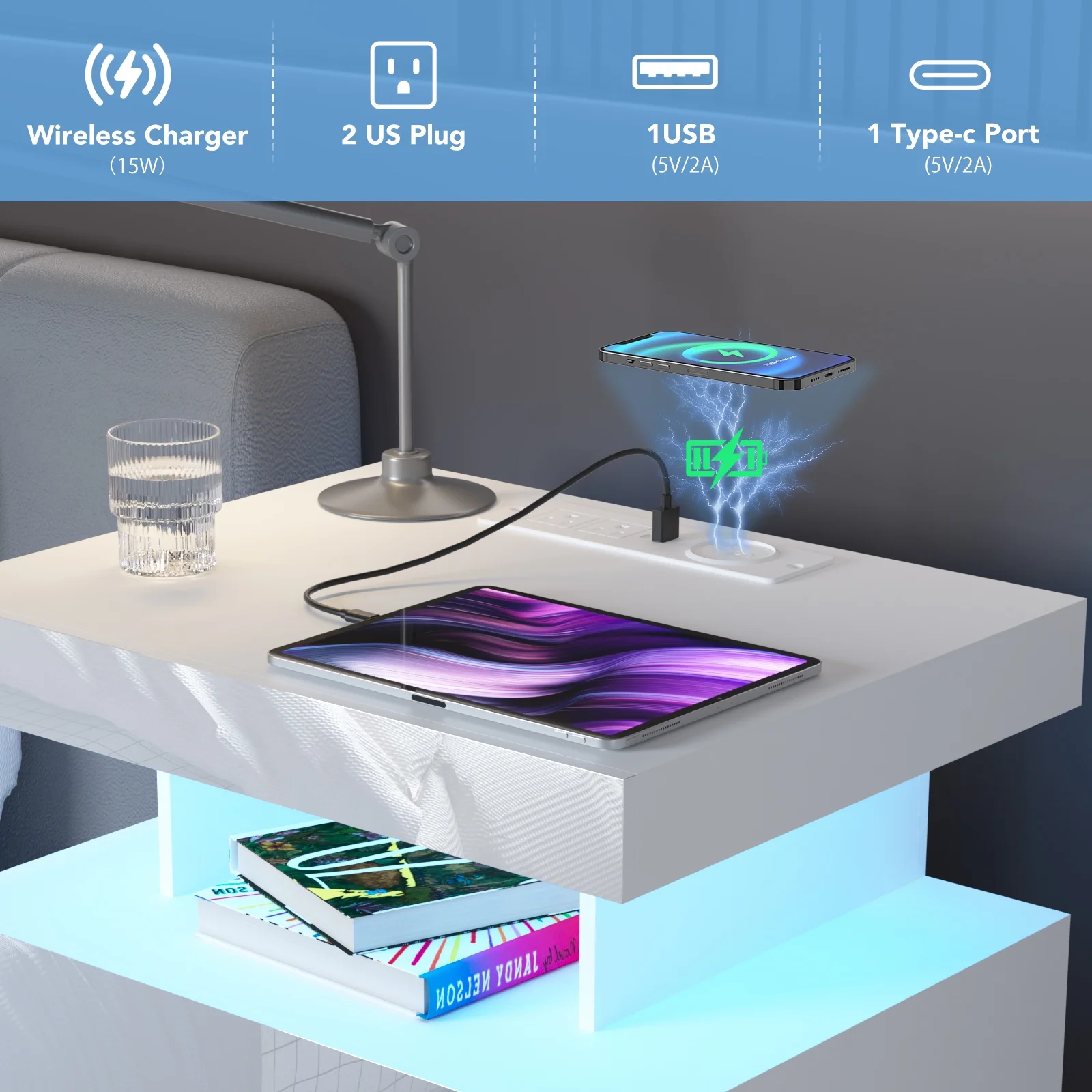 With an upgraded 15W WIRELESS charging station, USB and Type C ports and 2AC outlets , this smart nightstand can charge electronic equipment. -