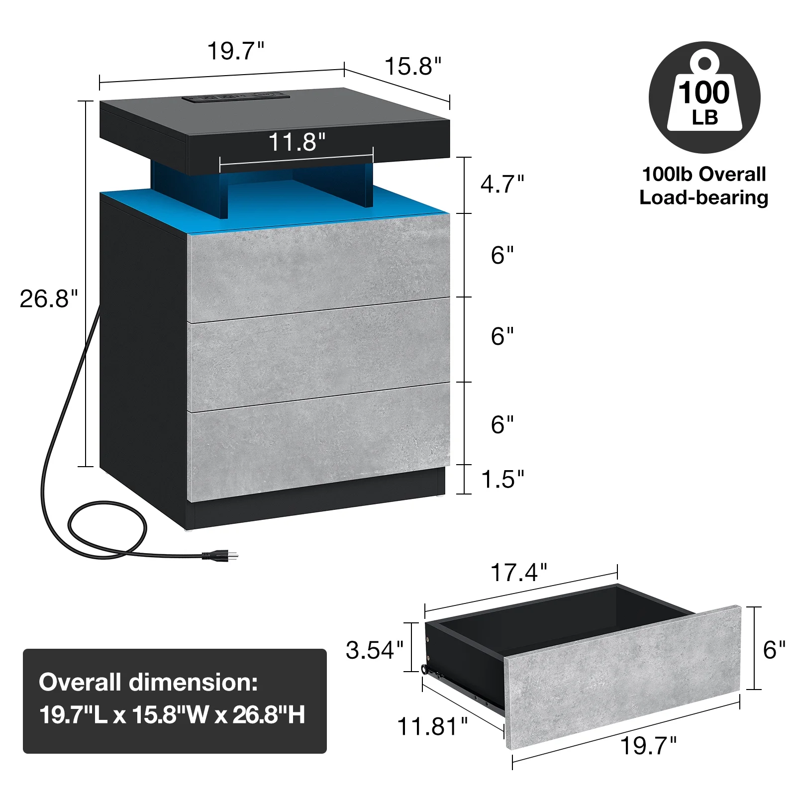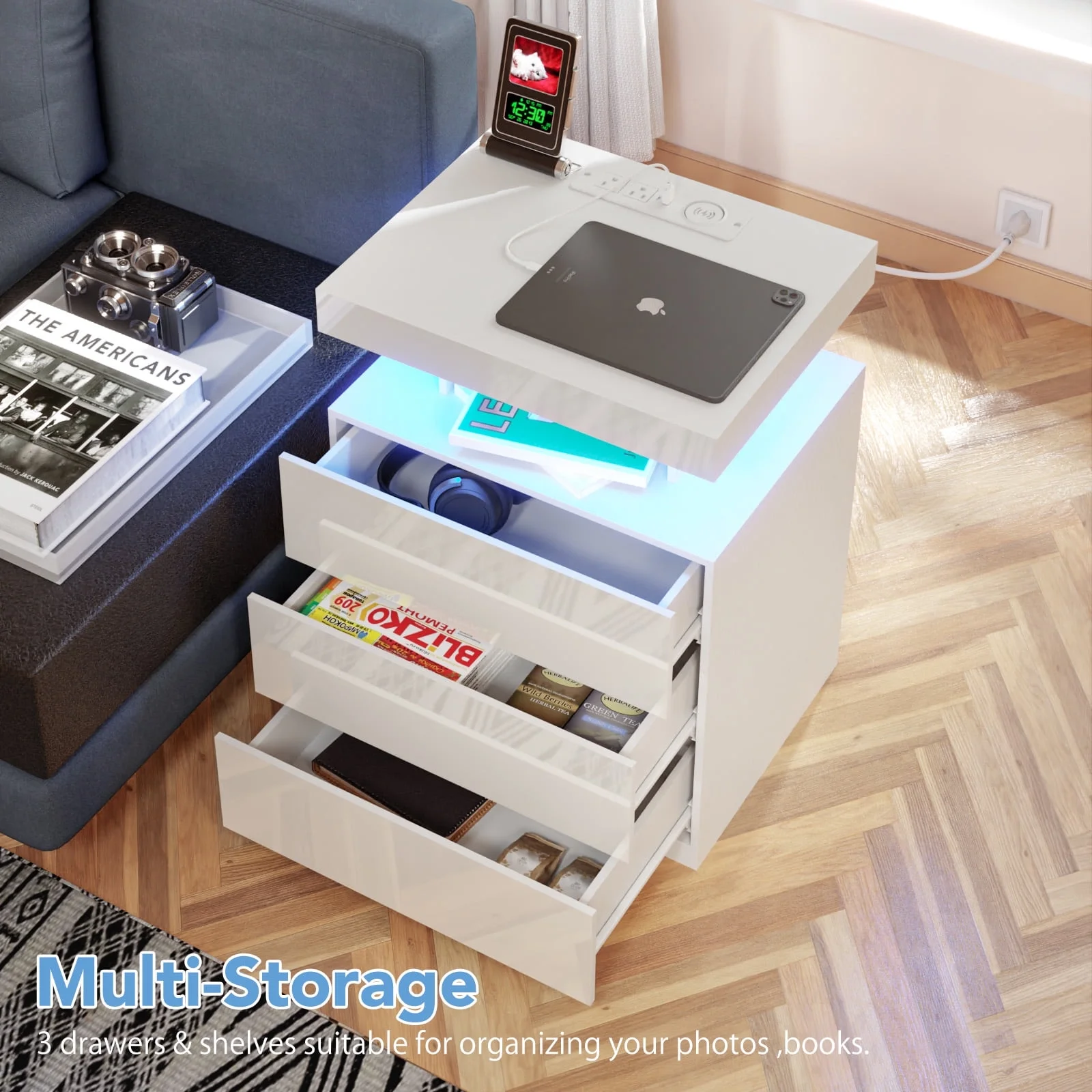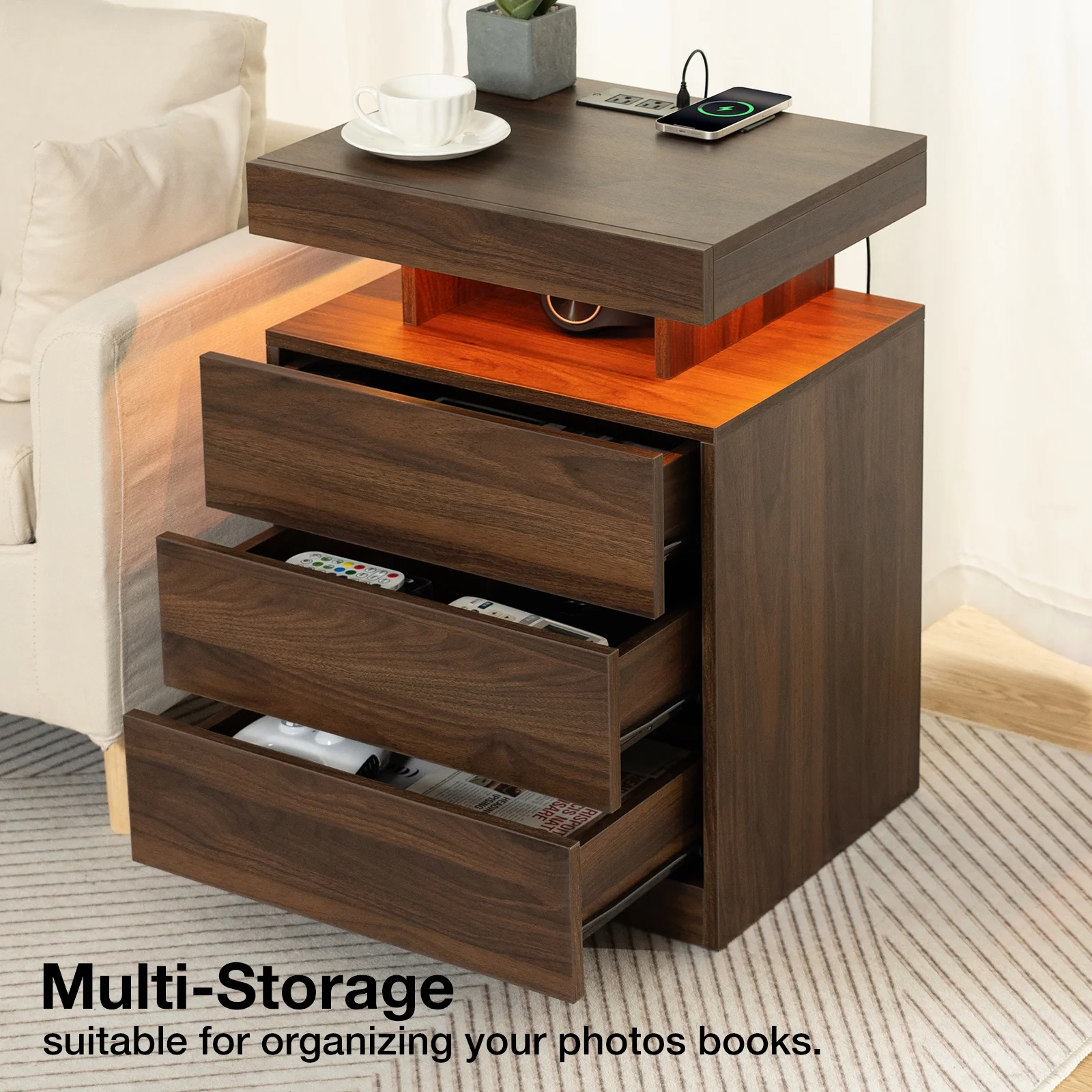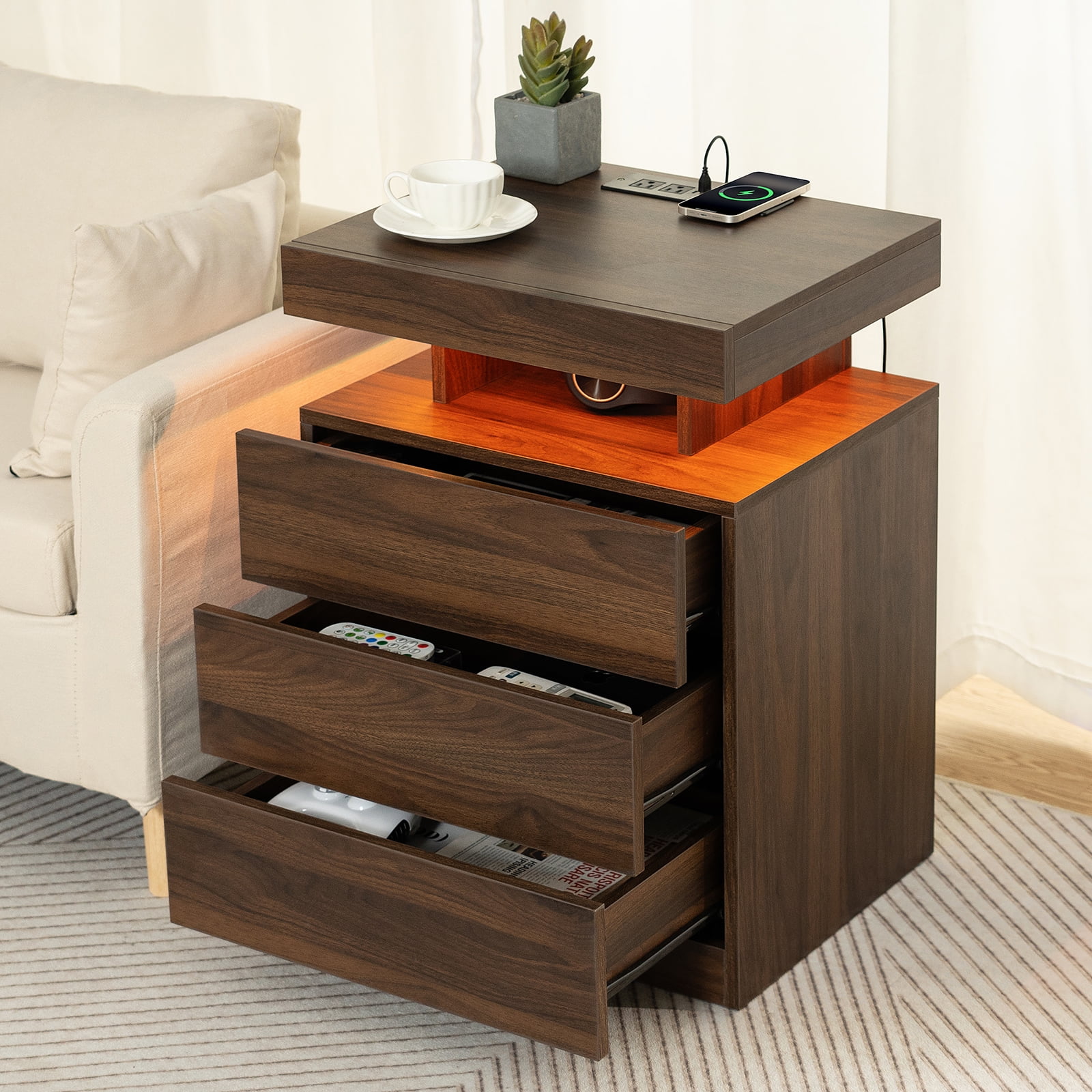 With an upgraded 15W WIRELESS charging station, USB and Type C ports and 2AC outlets , this smart nightstand can charge electronic equipment. -