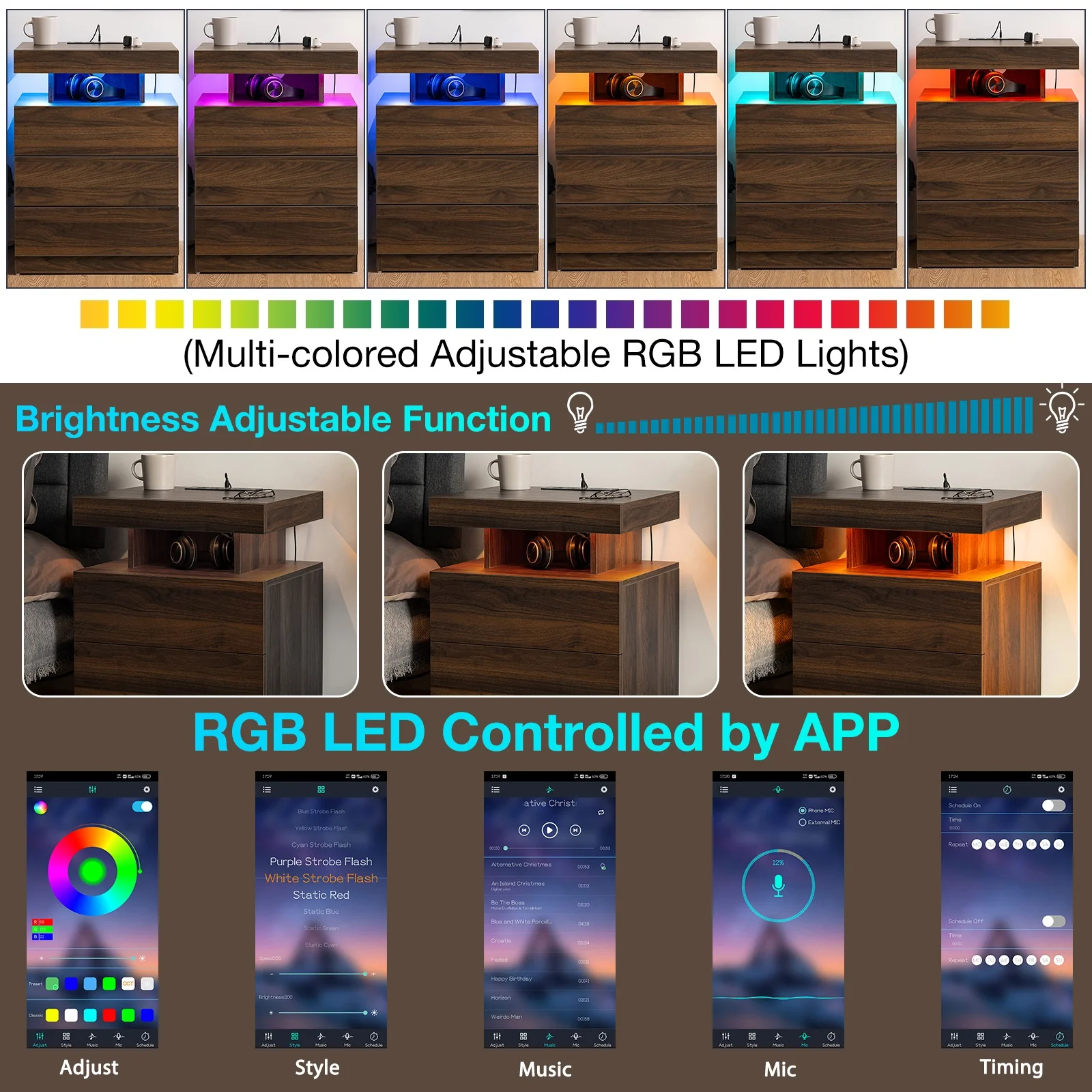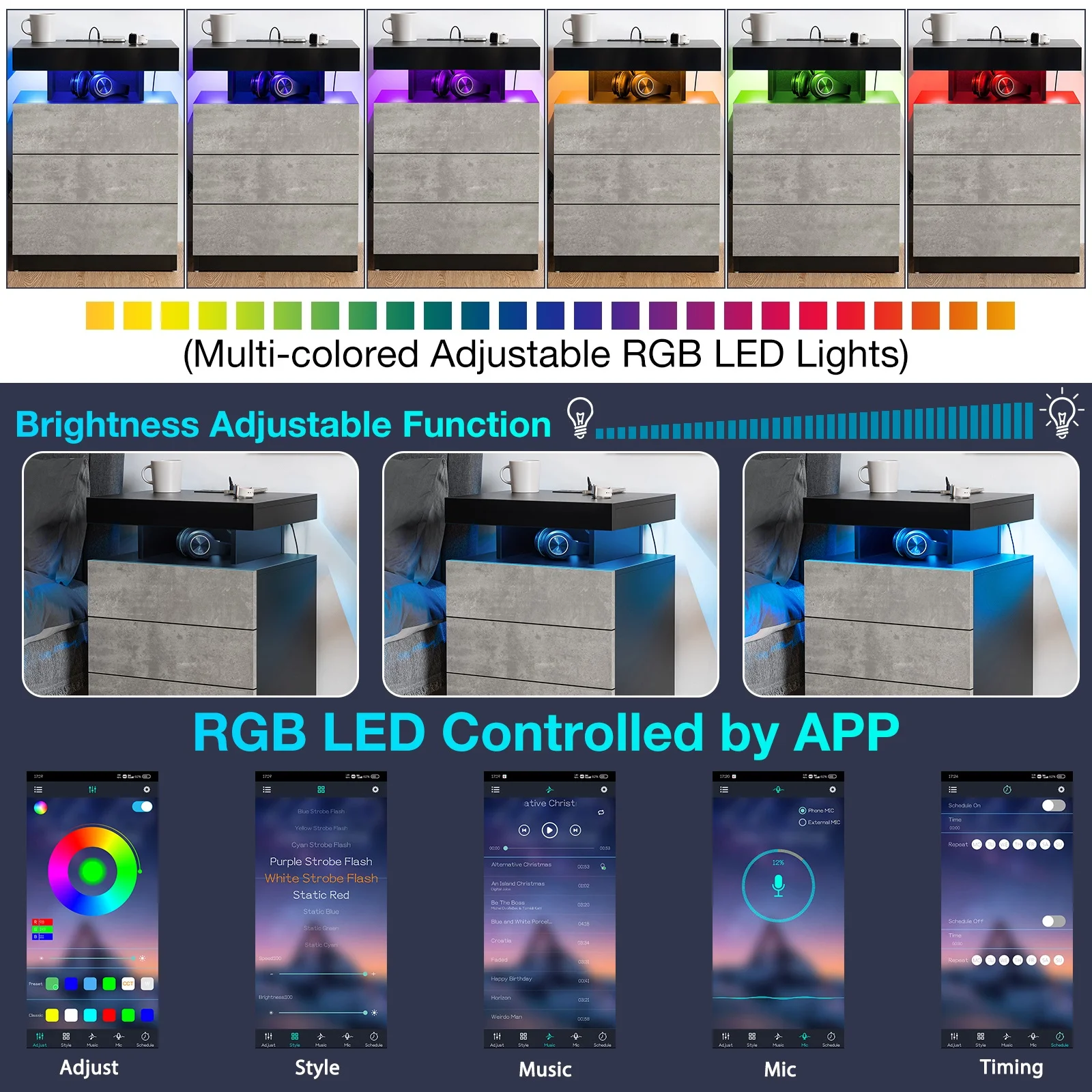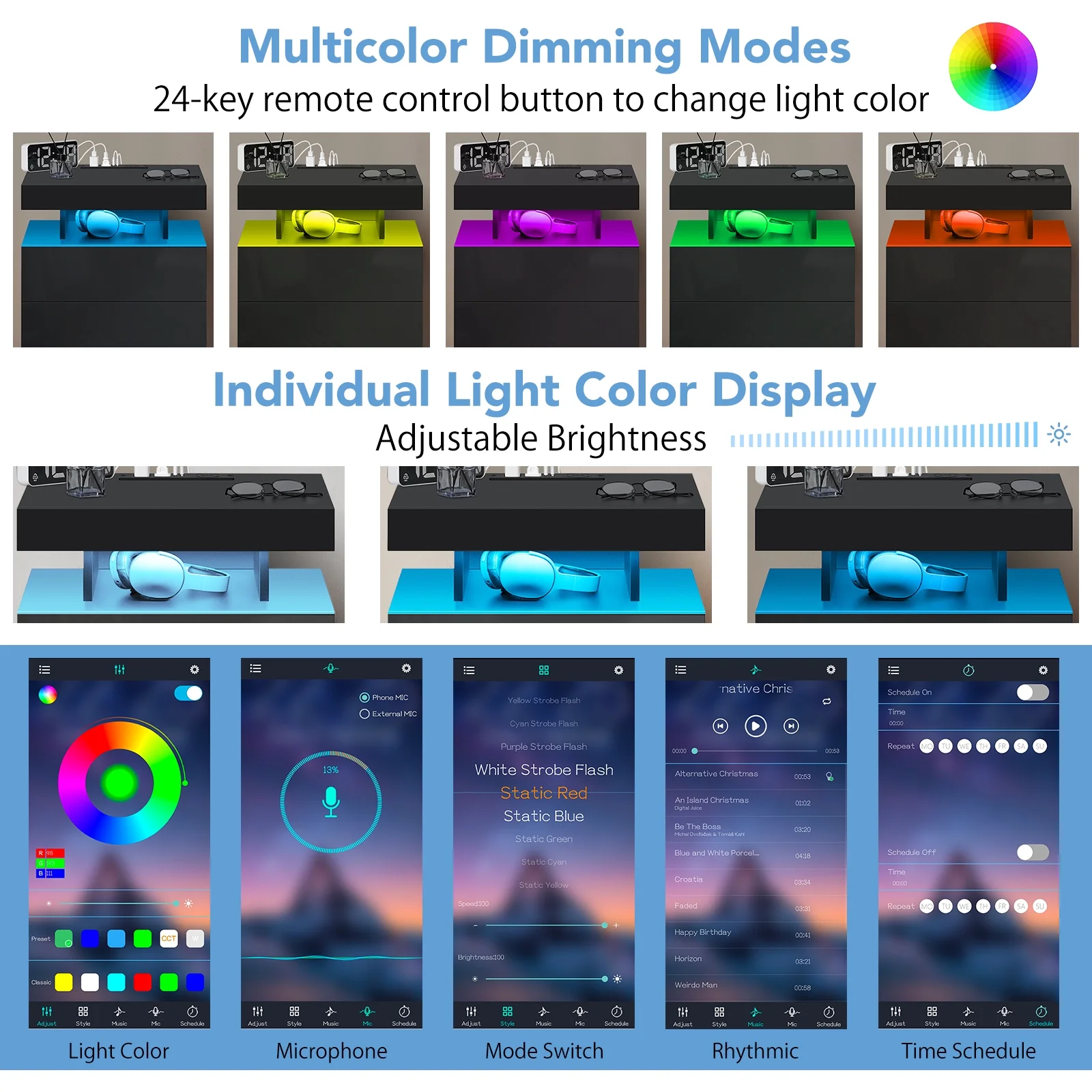 RGB LED lights can be remotely adjusted with multiple light colors and brightness and multiple modes. -