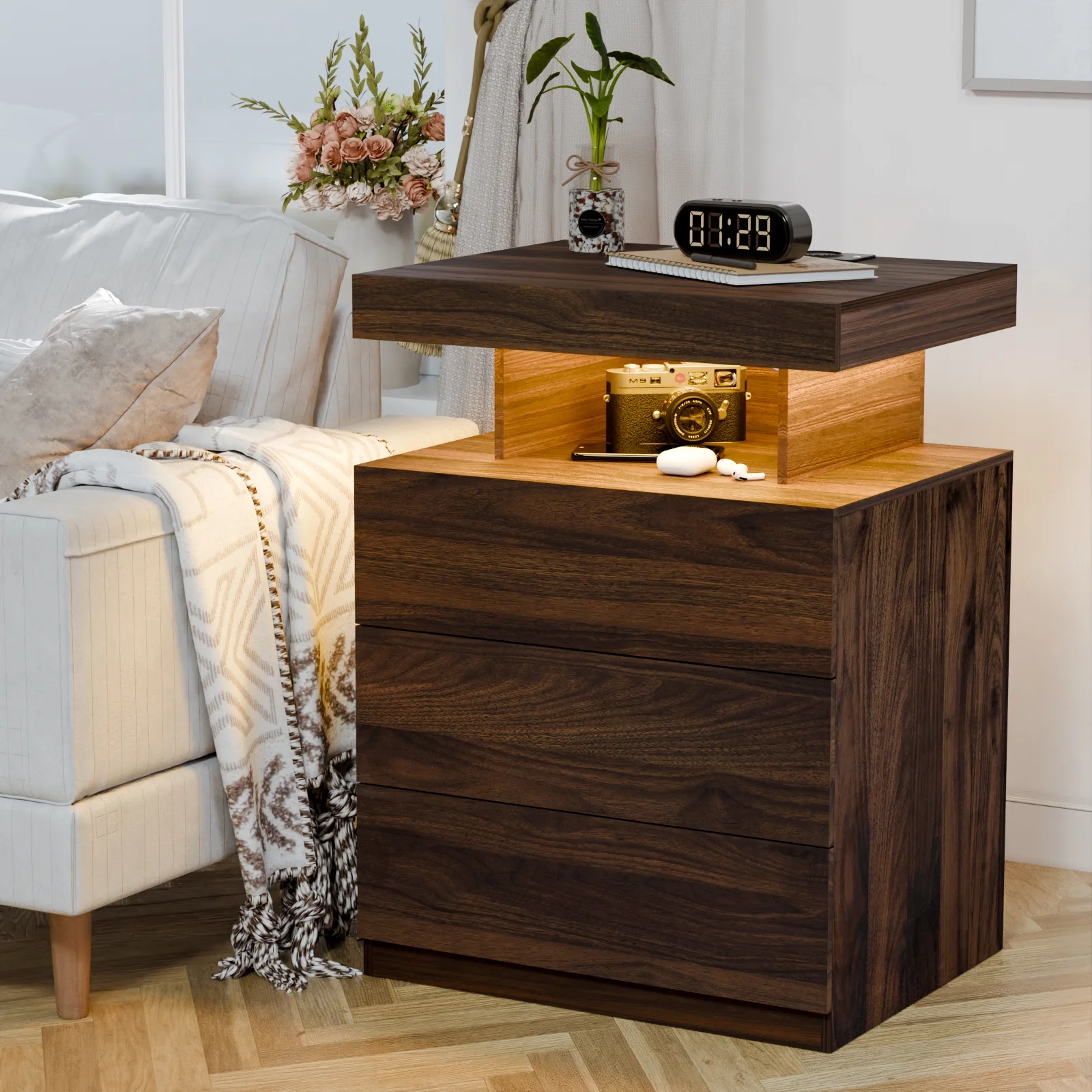 3 drawers and an open shelf, giving you plenty of space to organize your lamps, books, alarm clock . -
