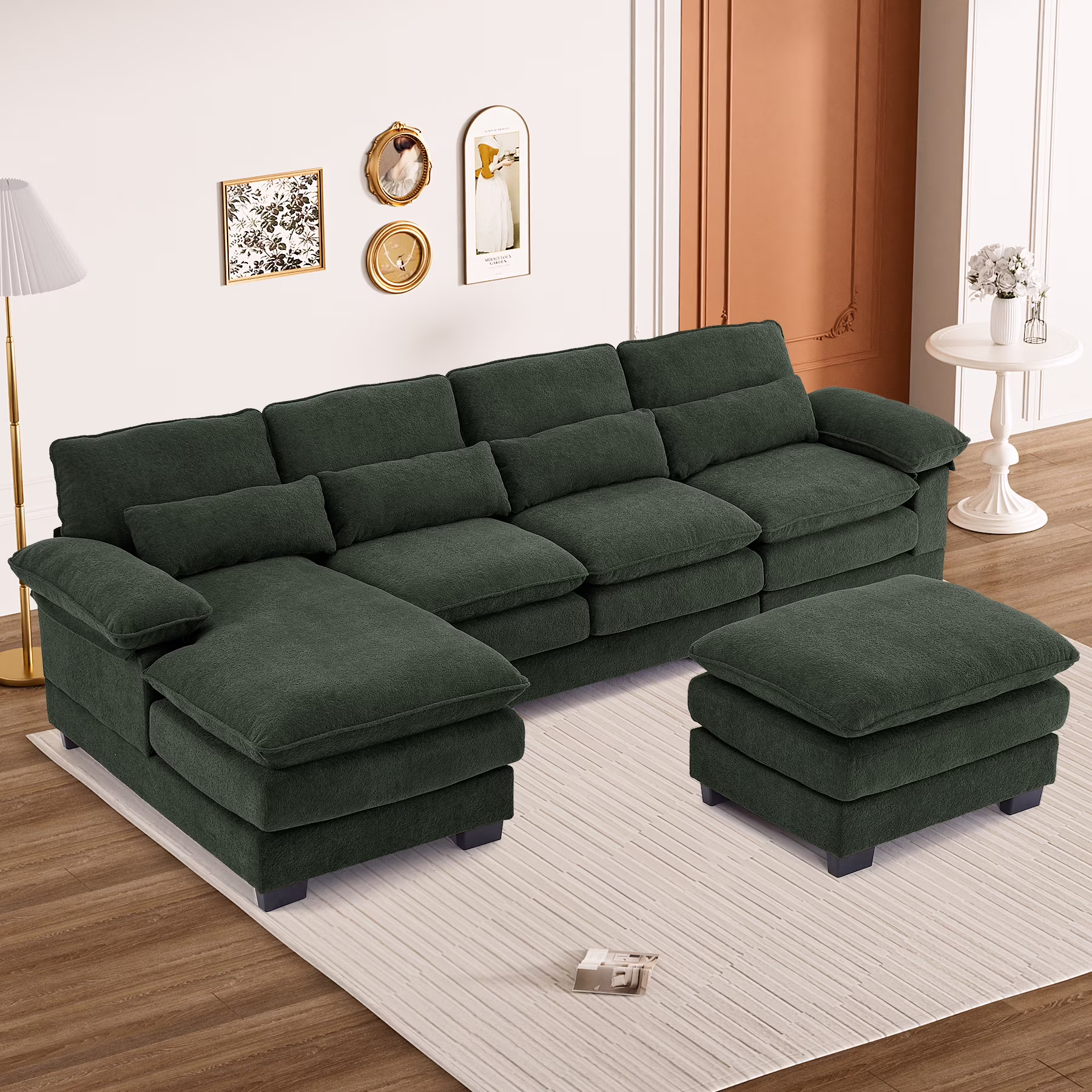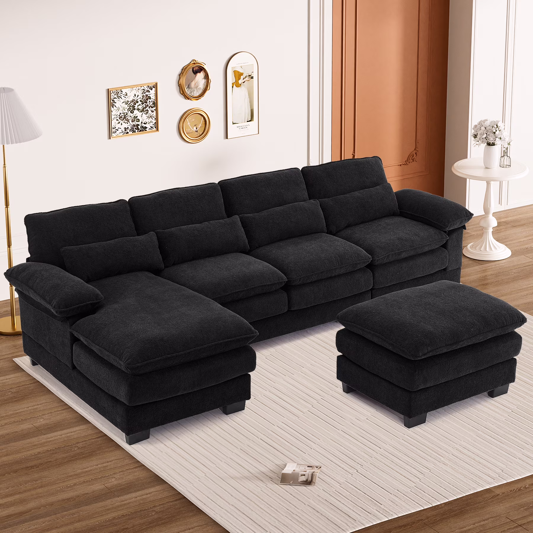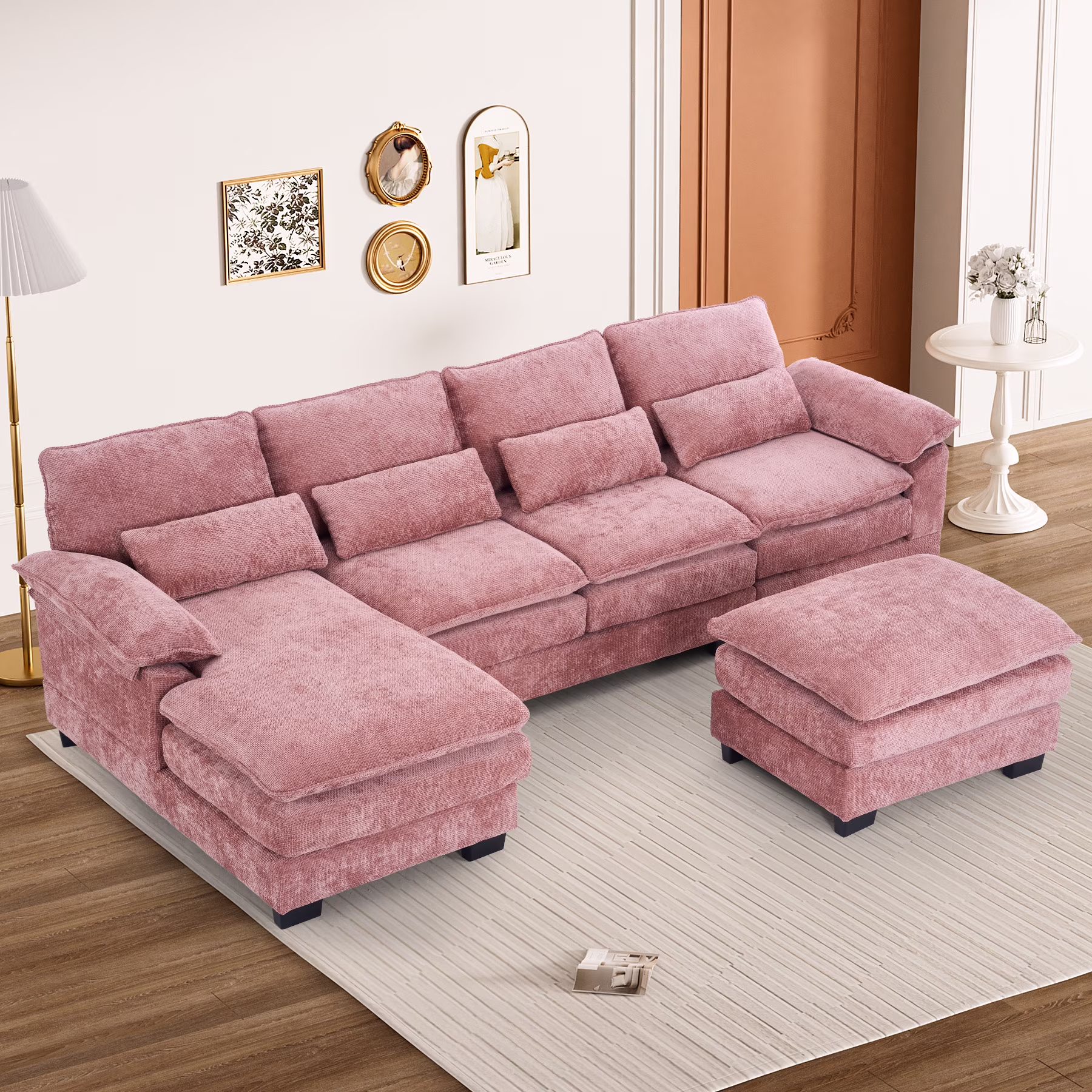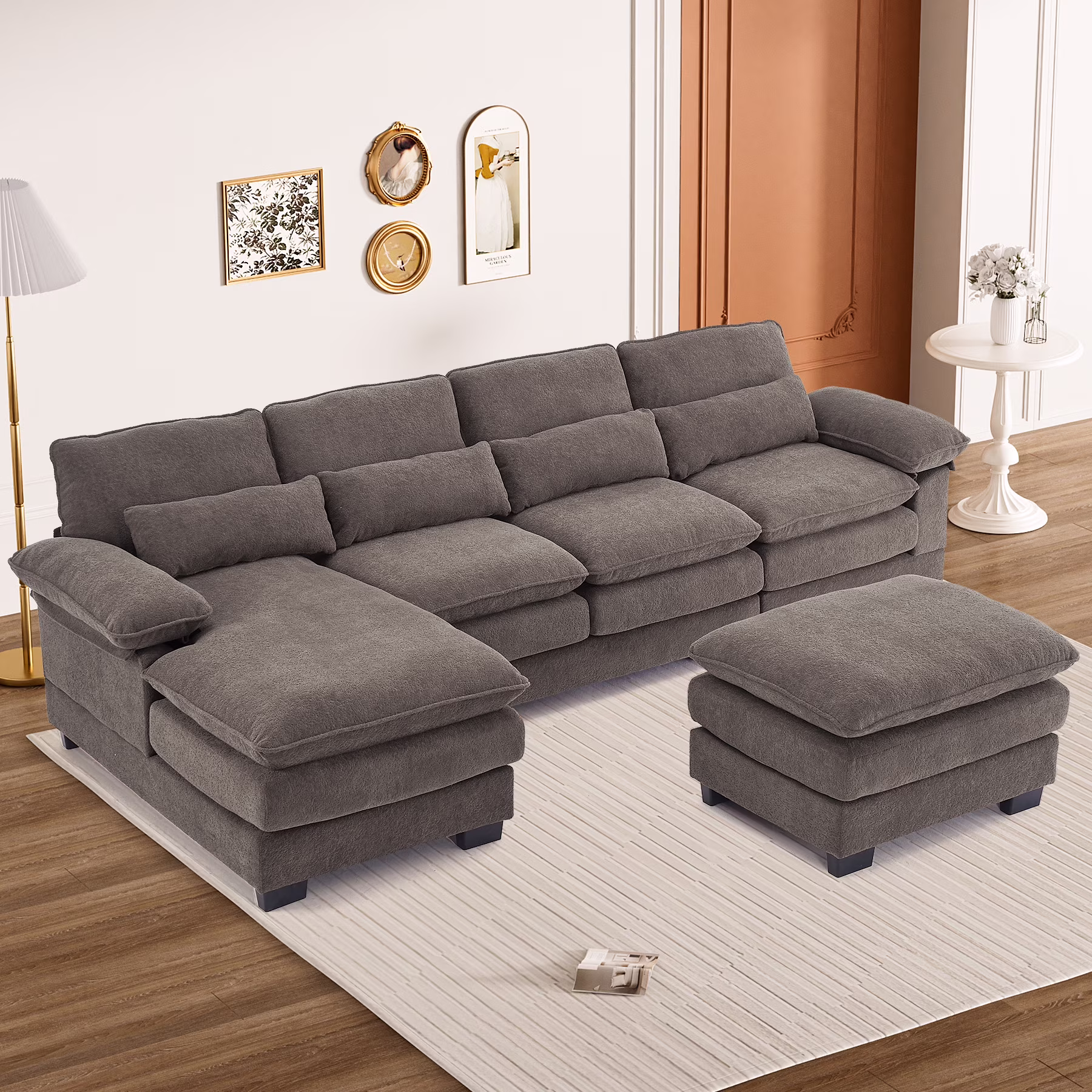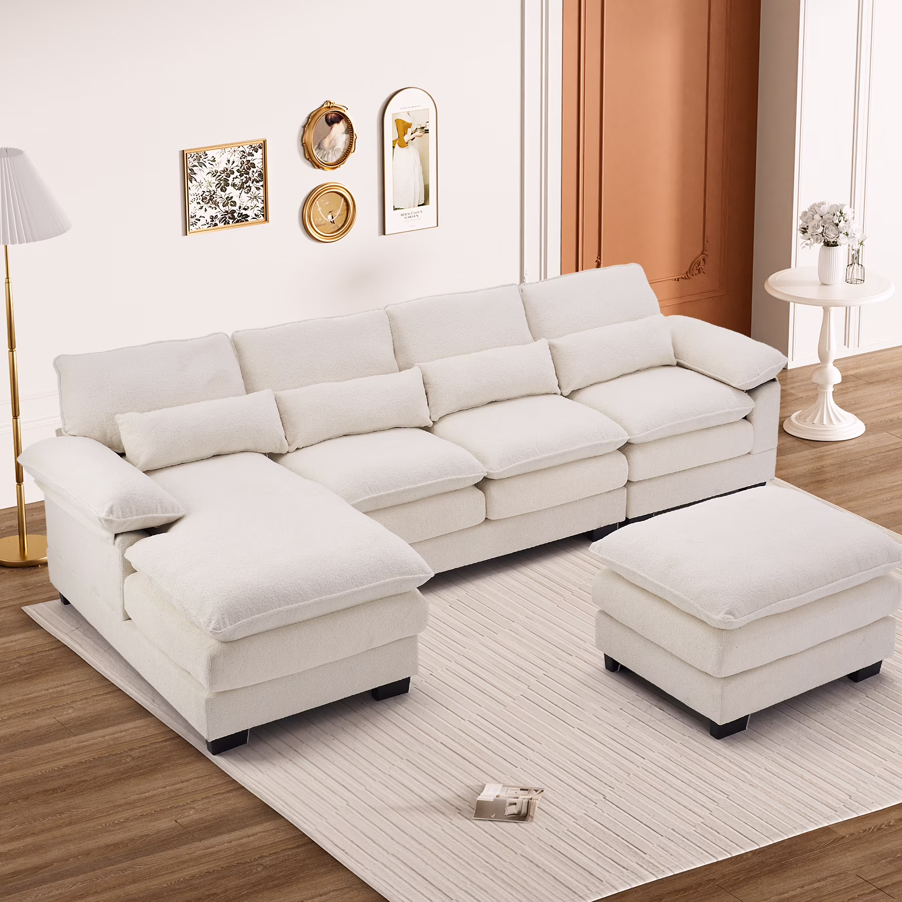 Includes: 2-Seat Sofa + 1 Single Sofa + 1 Chaise + 1 Ottoman + 4 Pillows -