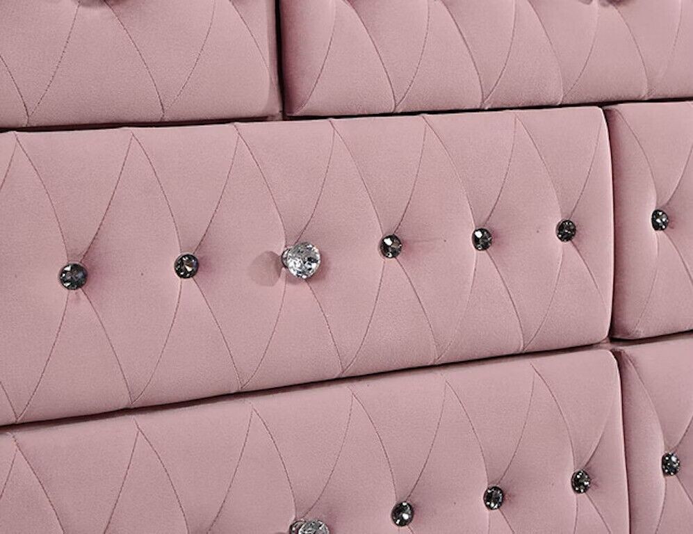 Resting atop elegant bun feet, this glamorous bedroom set brings a touch of stylish appeal that instantly brightens any space! Sophisticated button tufts adorn the leatherette upholstery of the headboard, which brings more attention to its thick and chic frame. Mirrored accent panels bring extra glitz to the design and make this a stunning set to admire!