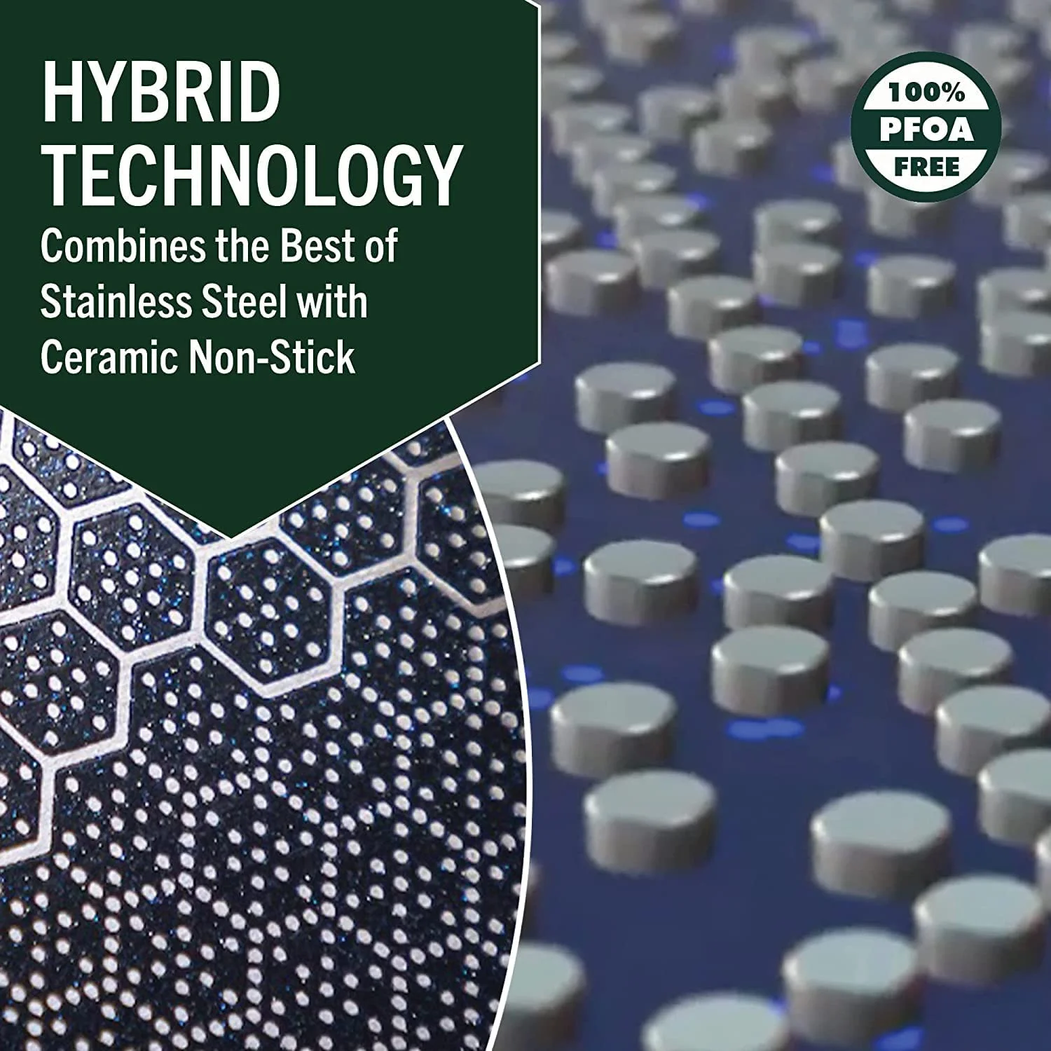 - Patented hybrid tech utilizes tri-ply construction �?aluminum between two layers of stainless-steel - laser-etched with our hexagonal nonstick surface to deliver the searing power of stainless, durability of cast-iron and easy cleanup of nonstick.