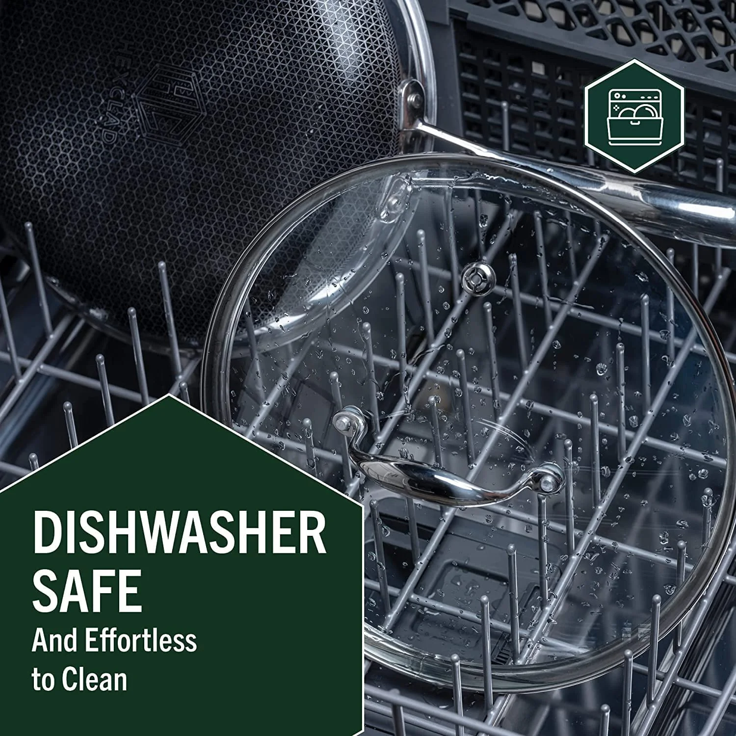 - Your purchase includes one 8 Inch Frying Pan, one 10 Inch Frying Pan and one 12 Inch Frying Pan, each with an accompanying Tempered Glass Lid.