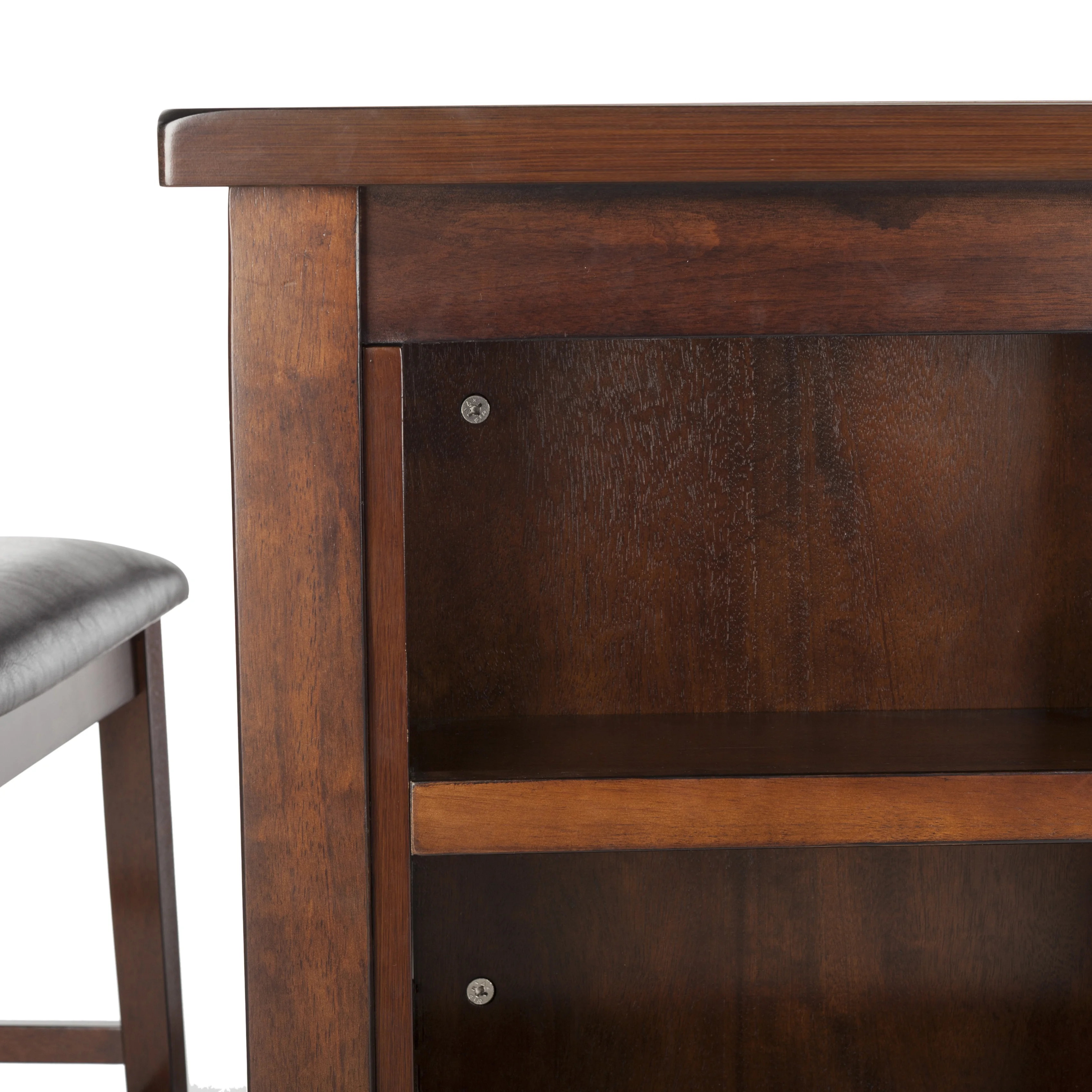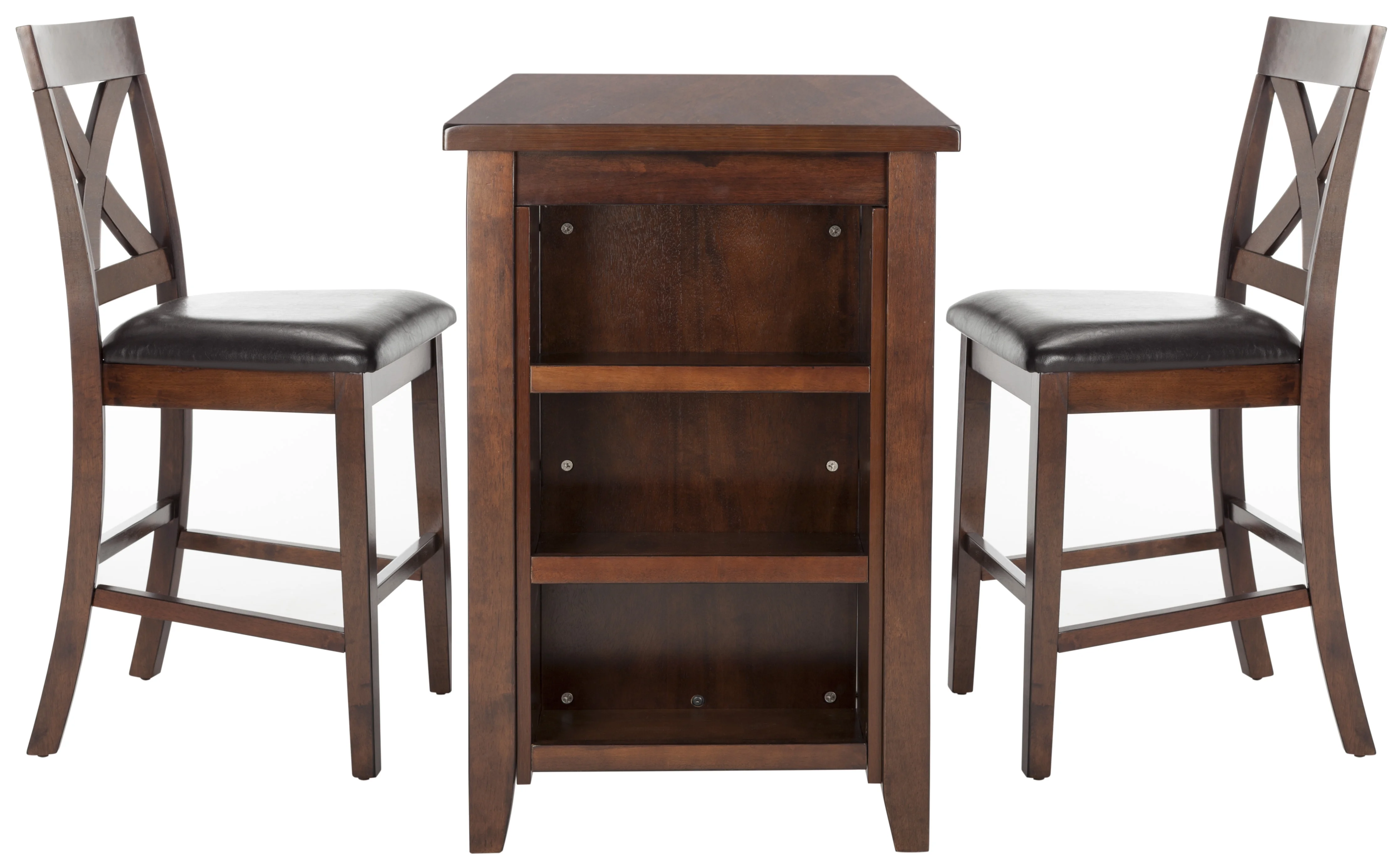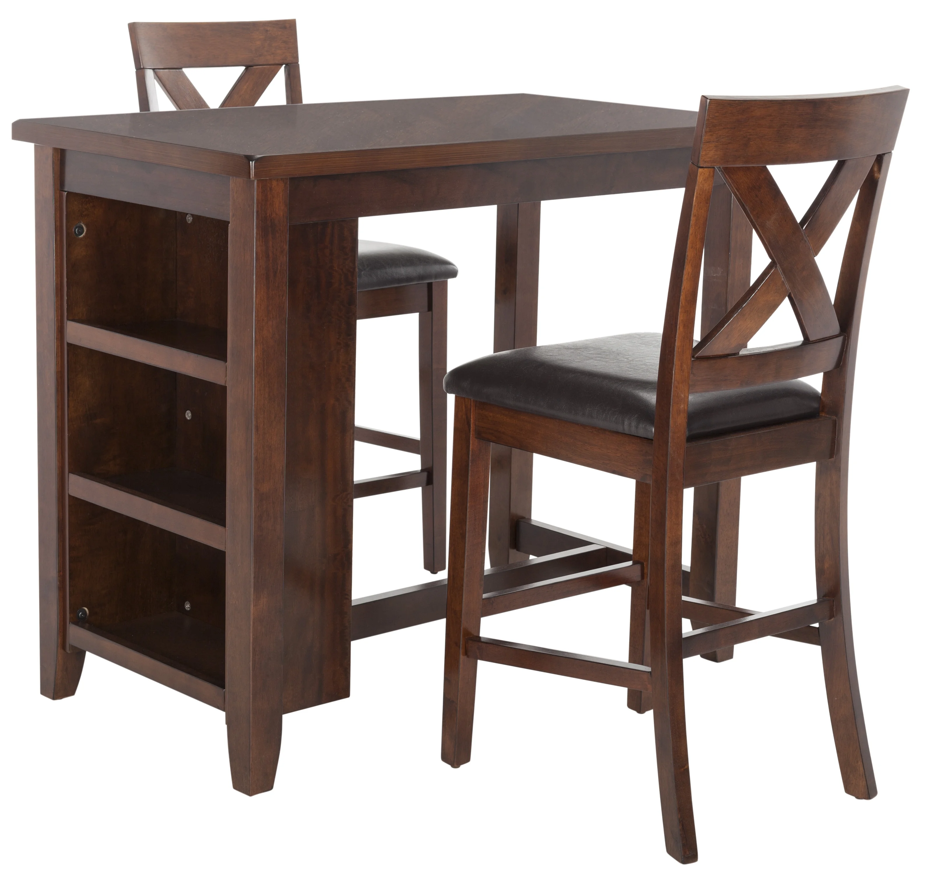 Transform any meal into a stylish dining experience with this 3-piece pub set. Constructed with solid mango wood, its mahogany finish compliments into any dining area décor. Its clever open storage shelves and classic x-back chairs make it an investment.- Contemporary design adds a chic look to your home