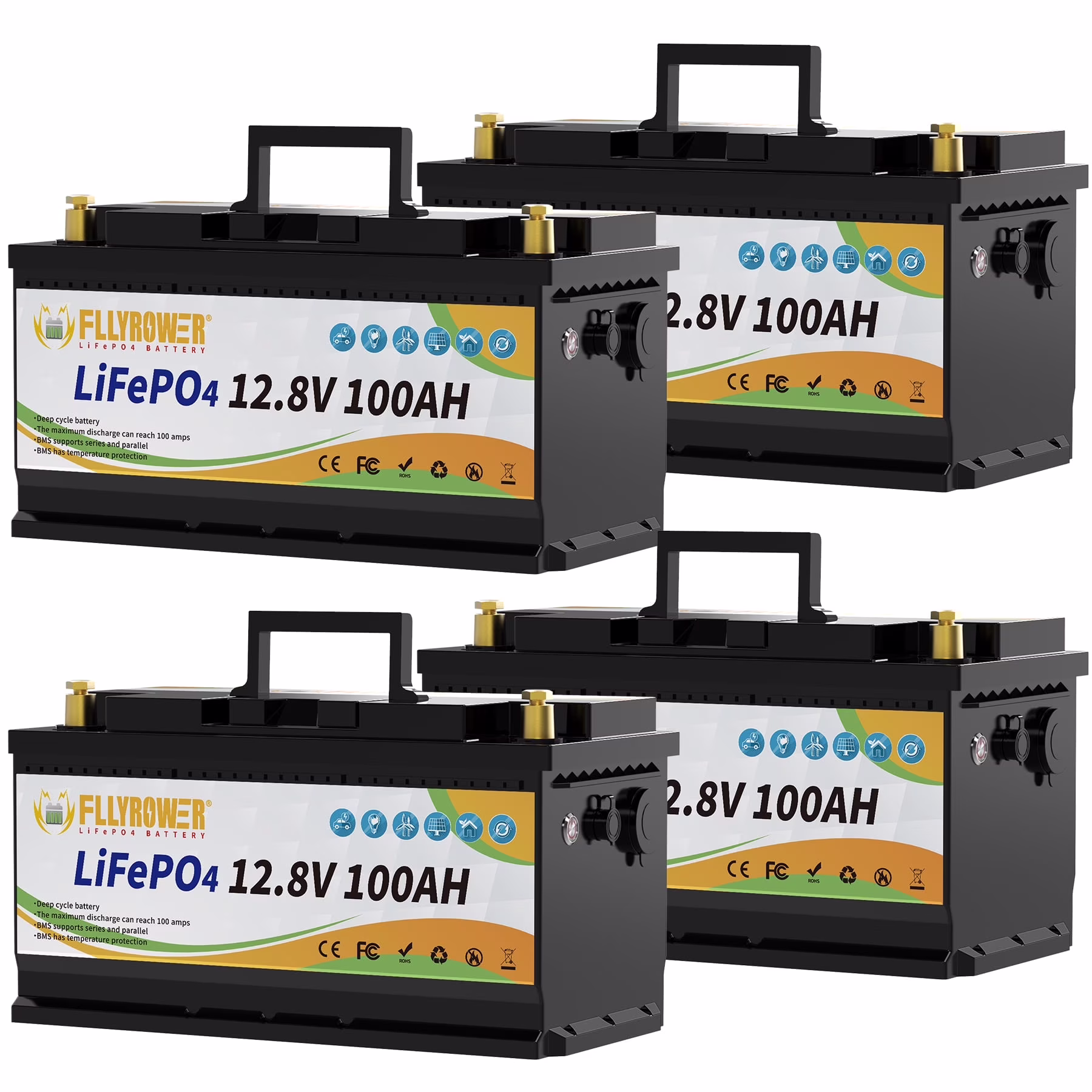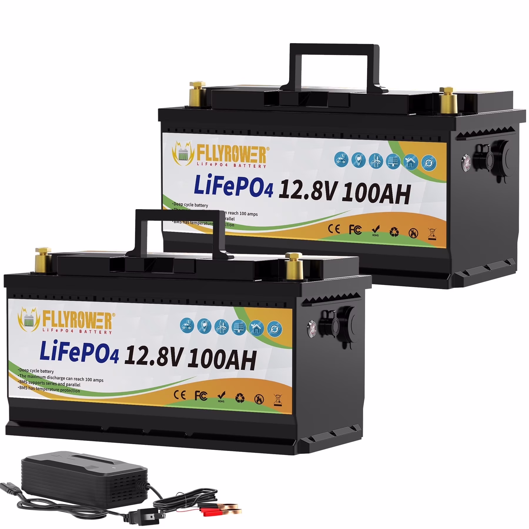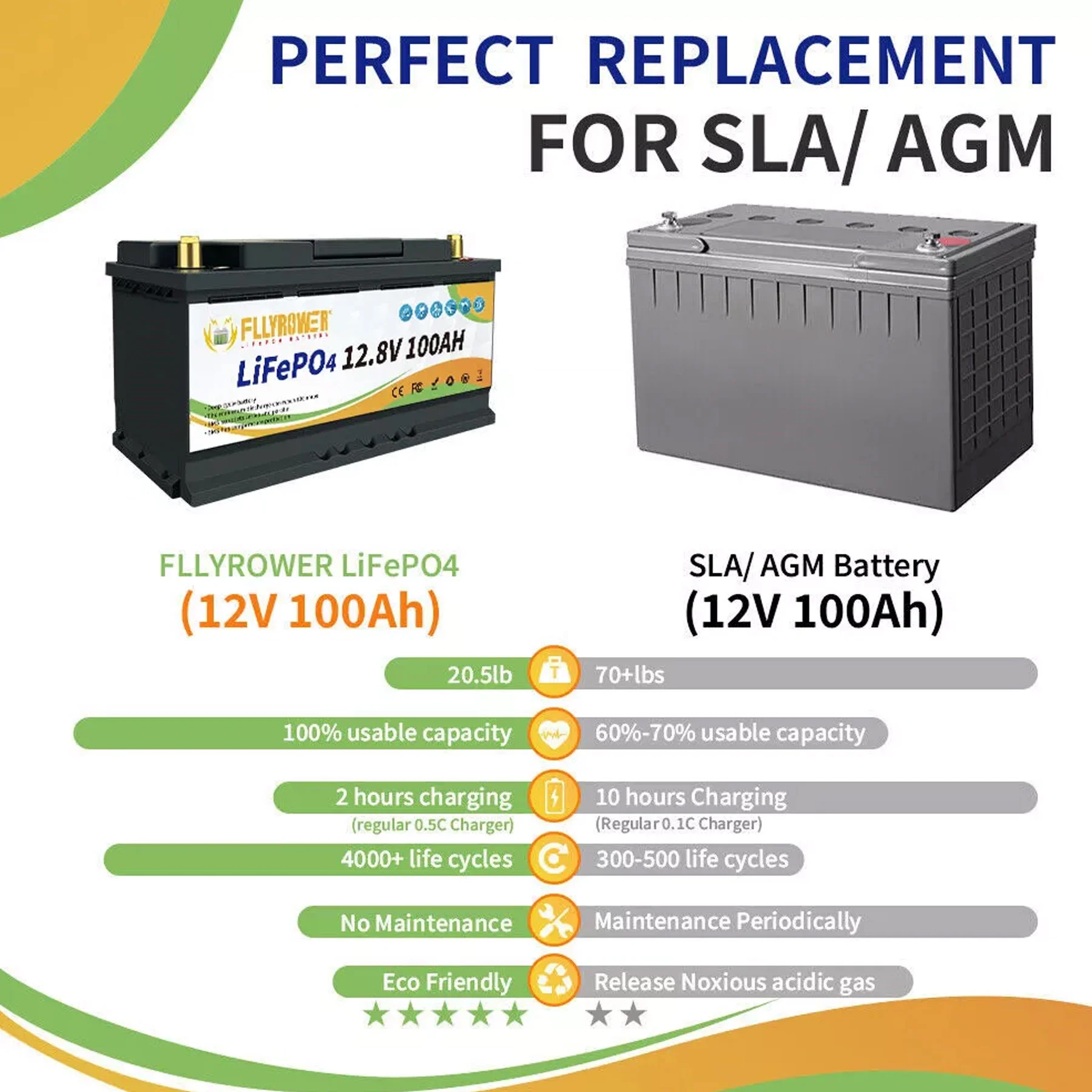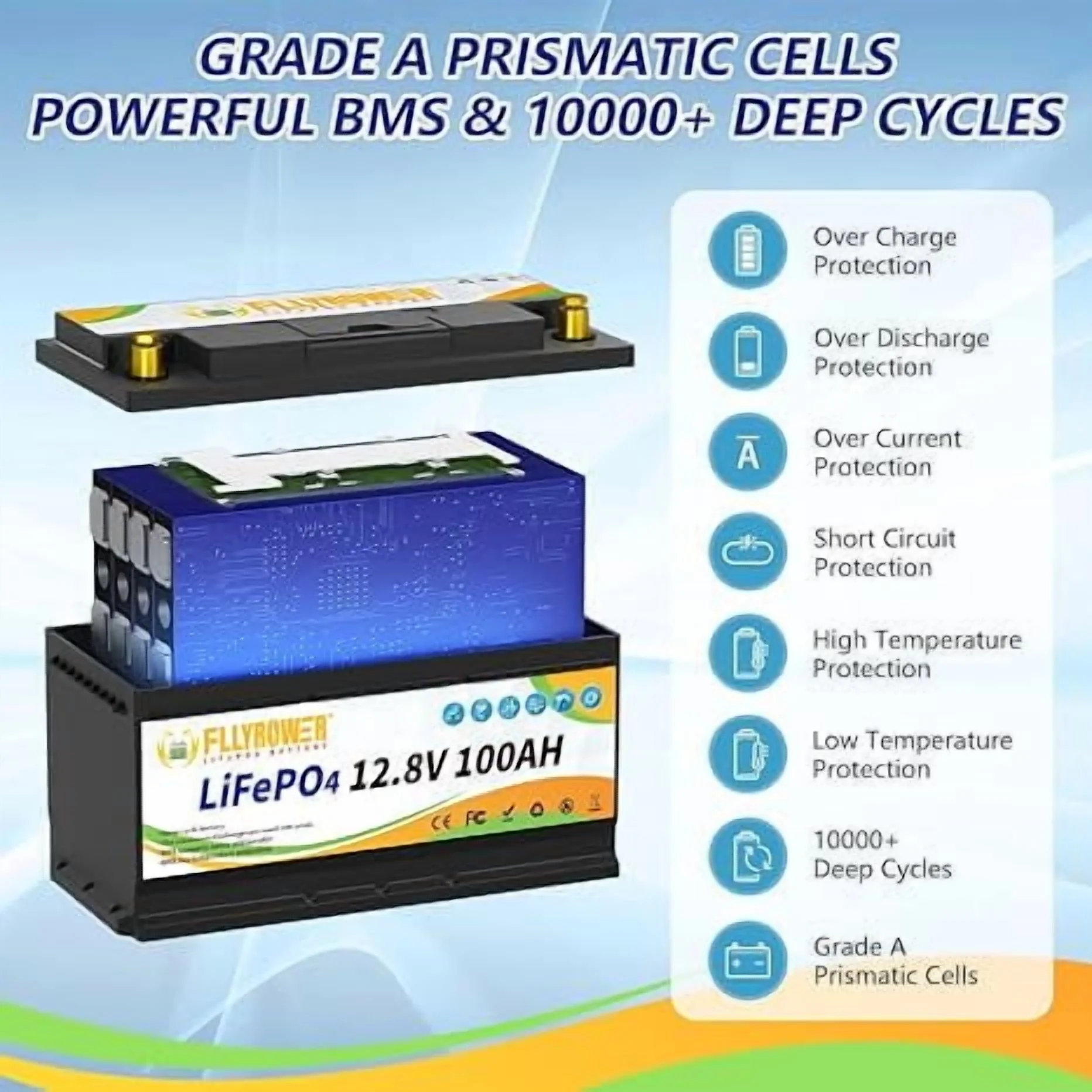 - ��Deep Cycles Battery ��FLLYROWER 12.8V 100AH LiFePO4 battery uses Grade A LiFePO4 Cells, which gets low self discharge rate and provides 5000~15000 cycles and 10-year lifetime. while the lead acid batteries with only 200~500 cycles & 3-year lifetime. and lifepo4 battery is more eco-friendly than lead acid batteries.