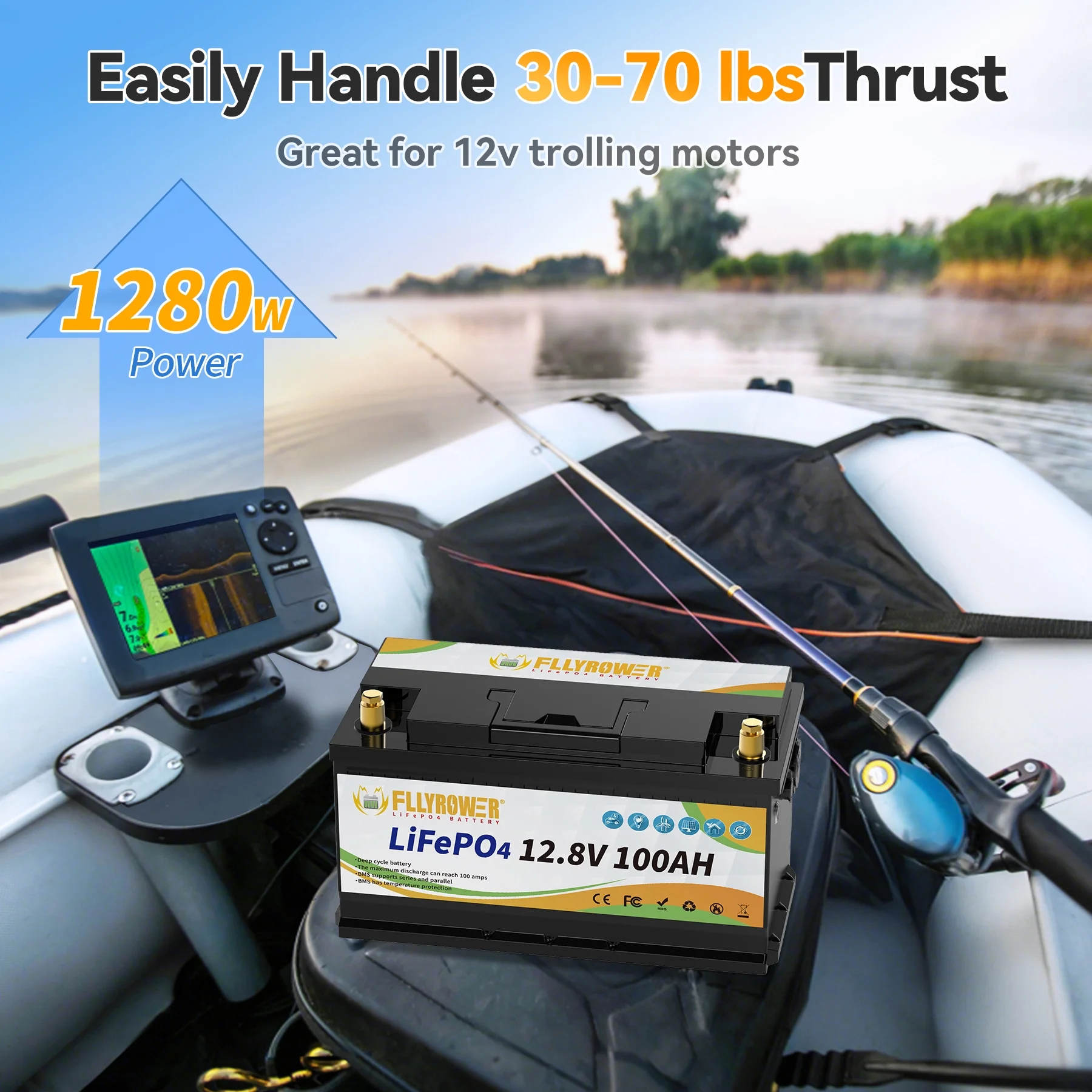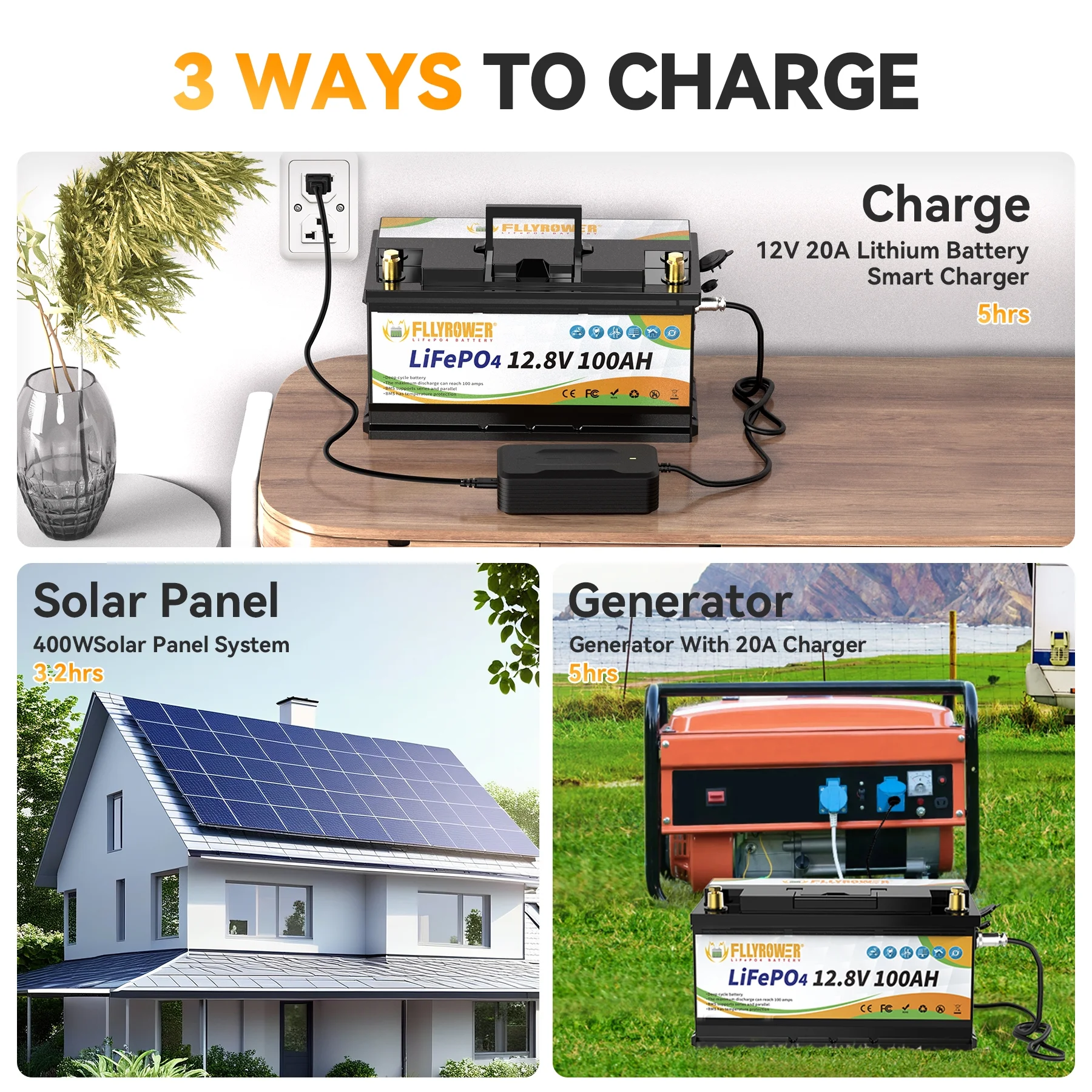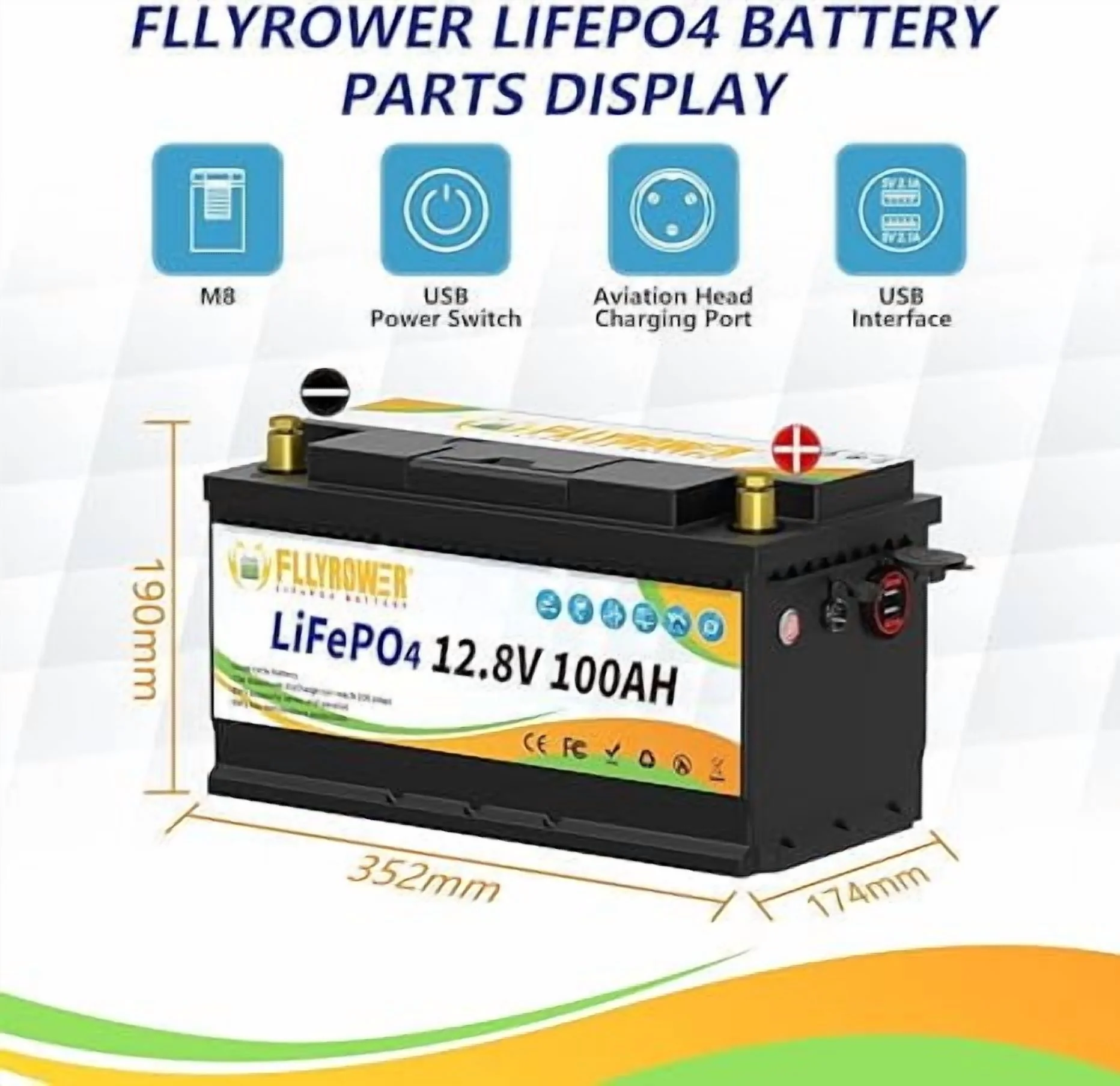 - ��Deep Cycles Battery ��FLLYROWER 12.8V 100AH LiFePO4 battery uses Grade A LiFePO4 Cells, which gets low self discharge rate and provides 5000~15000 cycles and 10-year lifetime. while the lead acid batteries with only 200~500 cycles & 3-year lifetime. and lifepo4 battery is more eco-friendly than lead acid batteries.